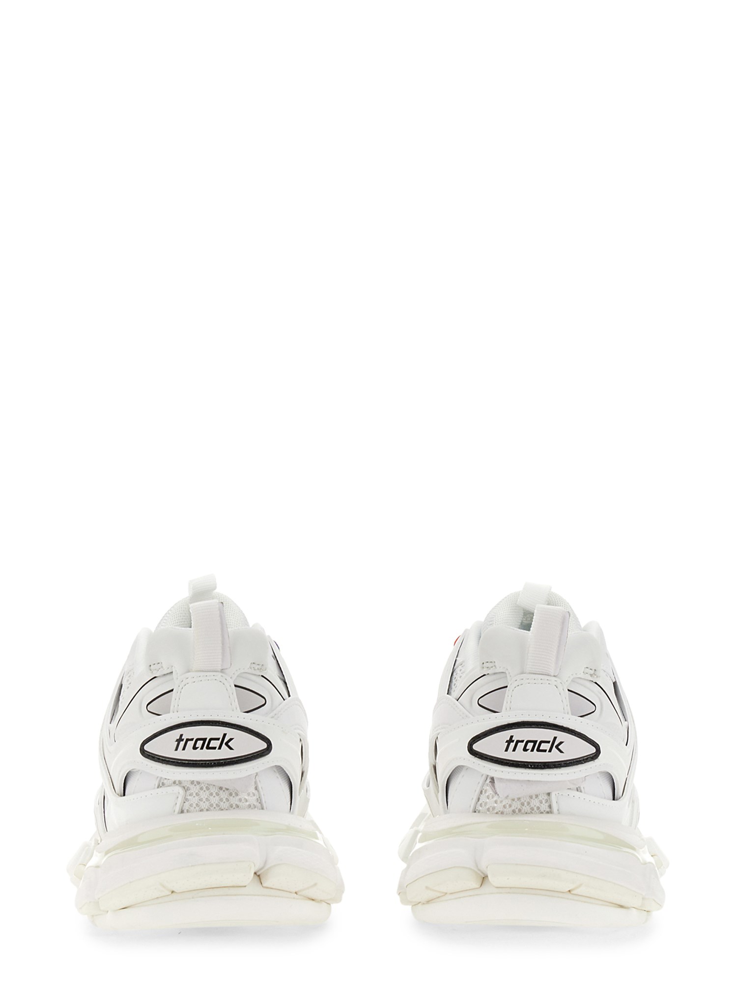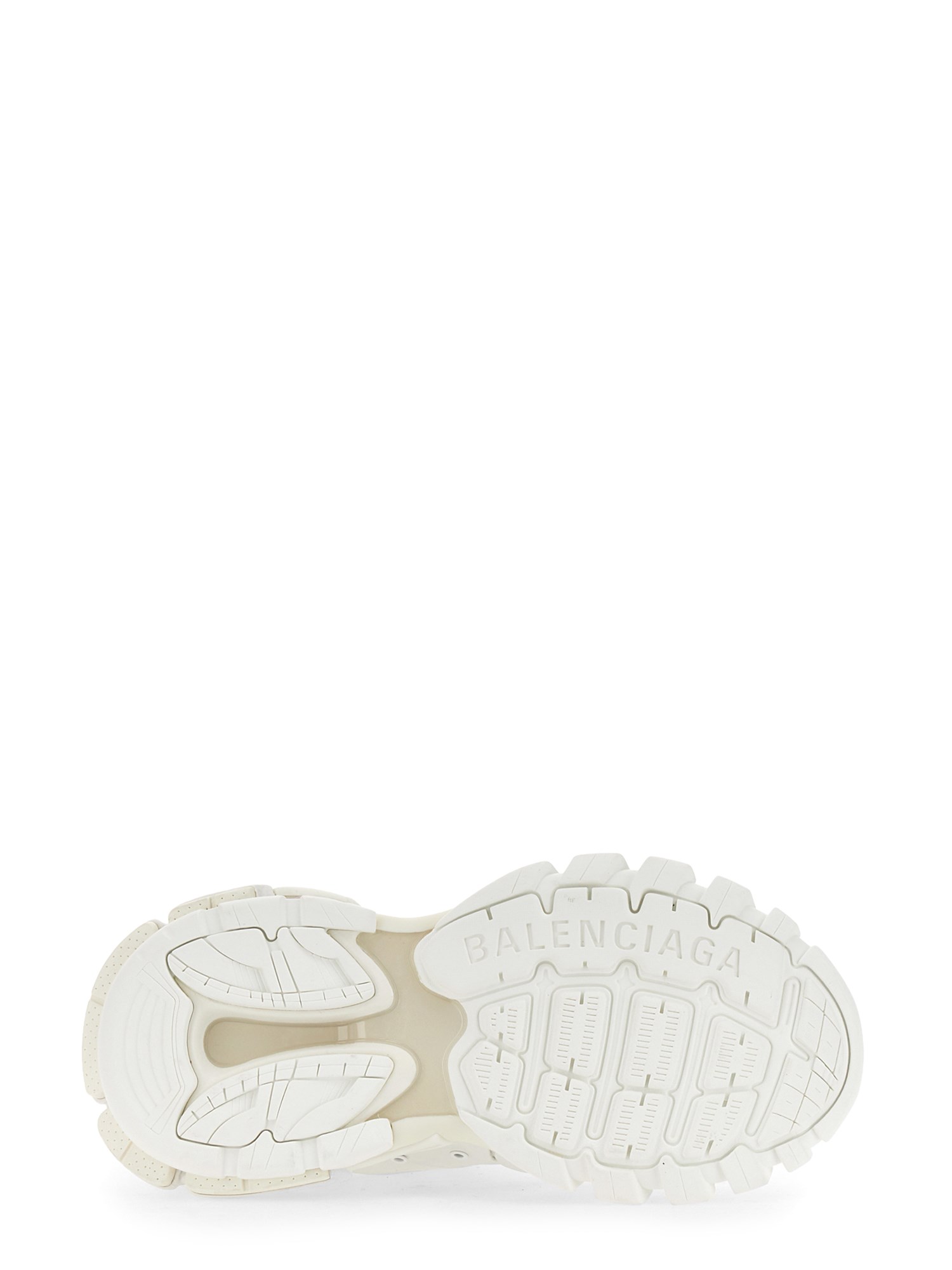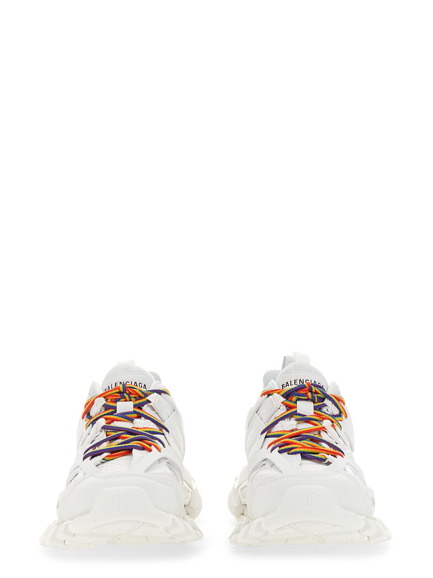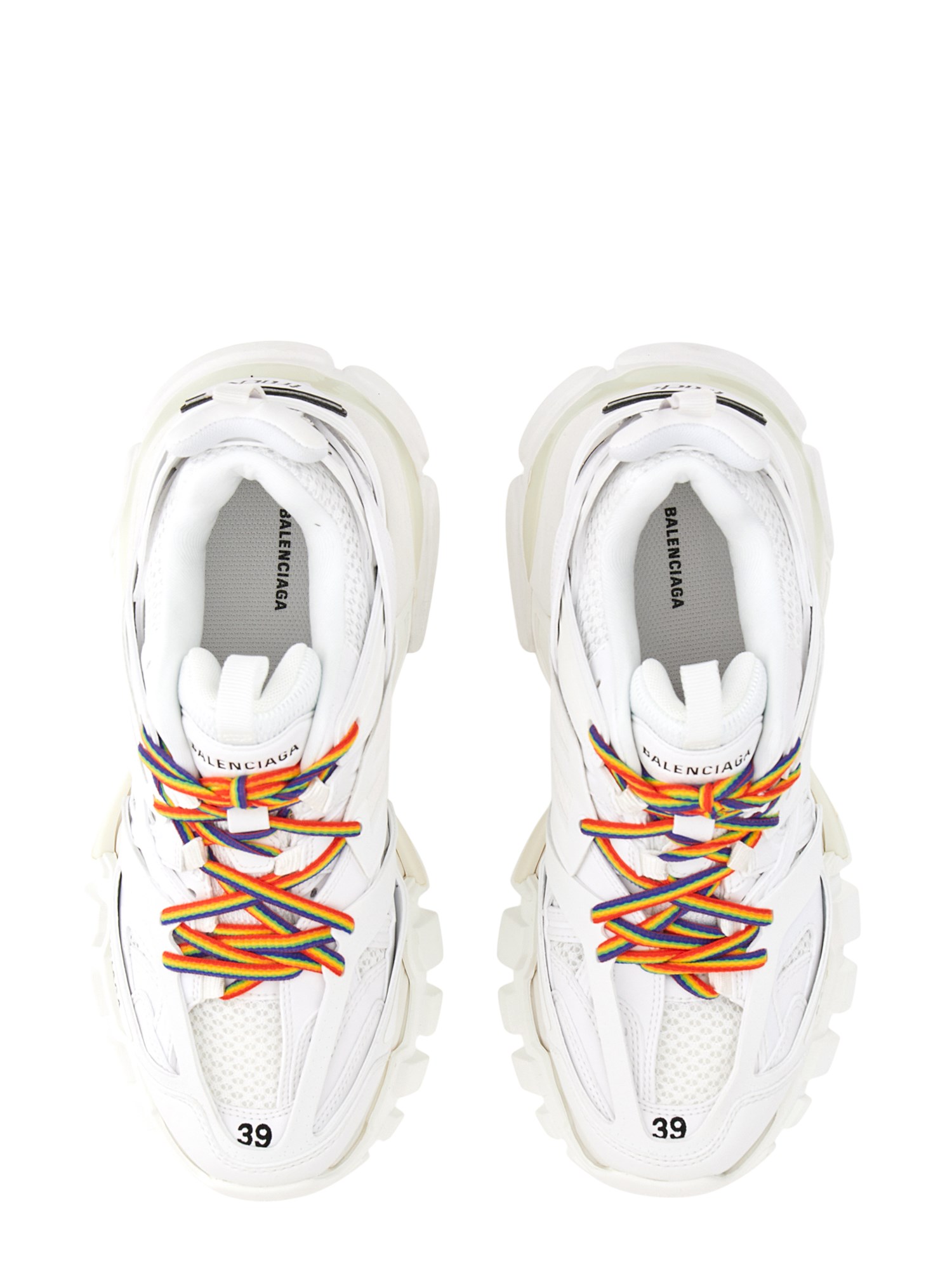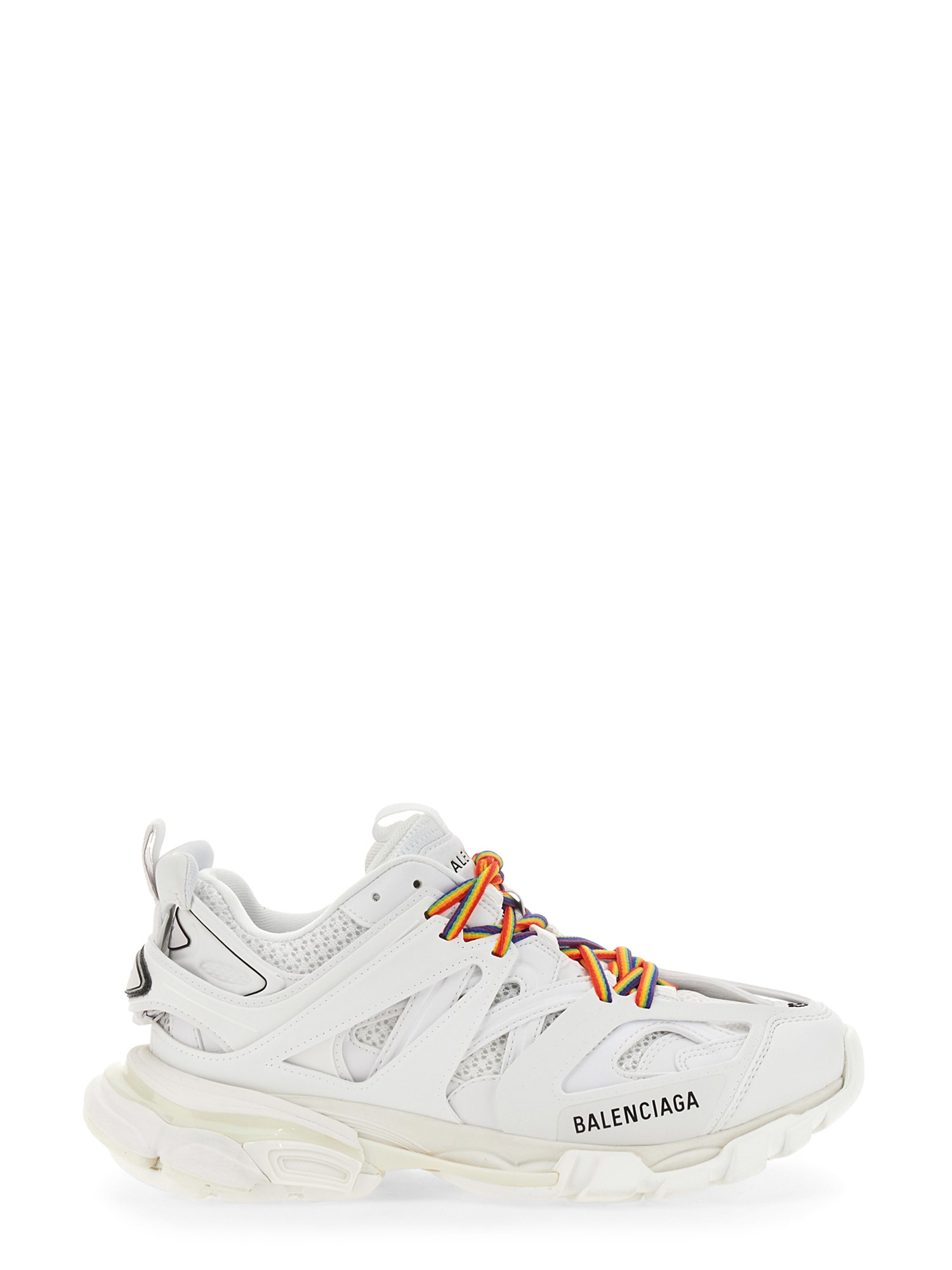 The Track sneaker from Balenciaga is a lightweight and durable shoe it has a dynamic outsole design with an augmented back to stress the forward movement of the foot. It features size written on the edge at the toe, tracks imprinted on the back of the heel, BB imprinted on the front sole, logo imprinted on the outside, and imprinted logo on the tongue. The shoes have double knotted lace and a back loop and tongue.