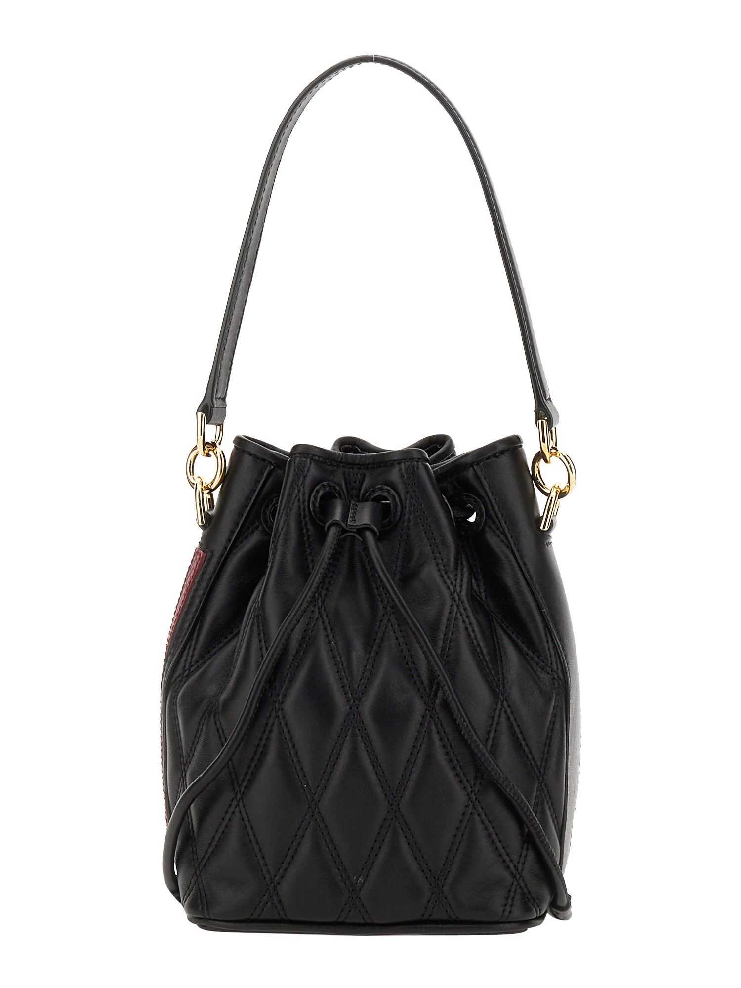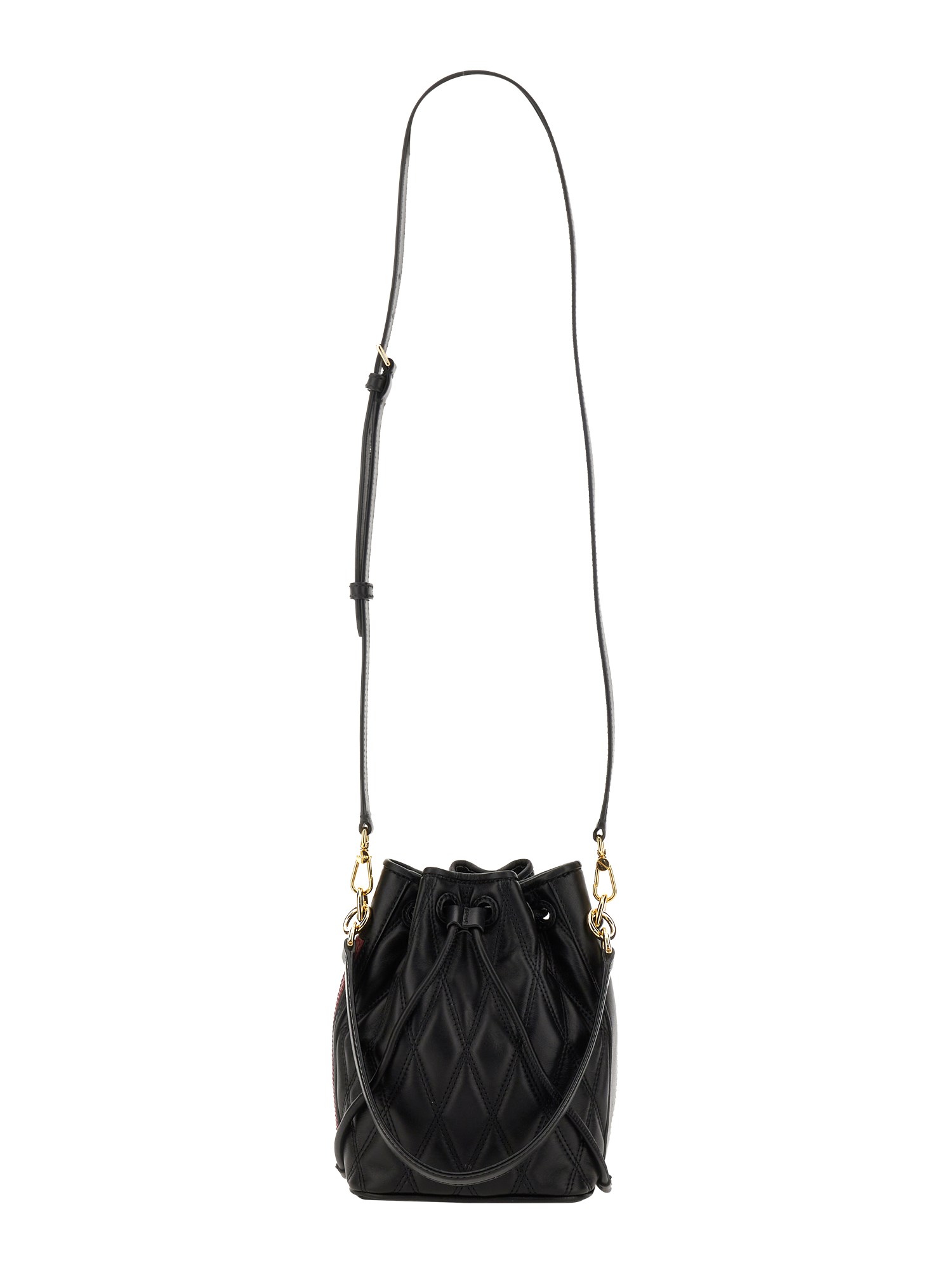 This bucket bag from Bally has a heavy-duty construction that will last for years. The upper is made of a quilted leather that is water resistant. The drawstring closure and metal logo side band give this bag a more polished look. The bucket bag is versatile and can be worn to a night out on the town or to the office.