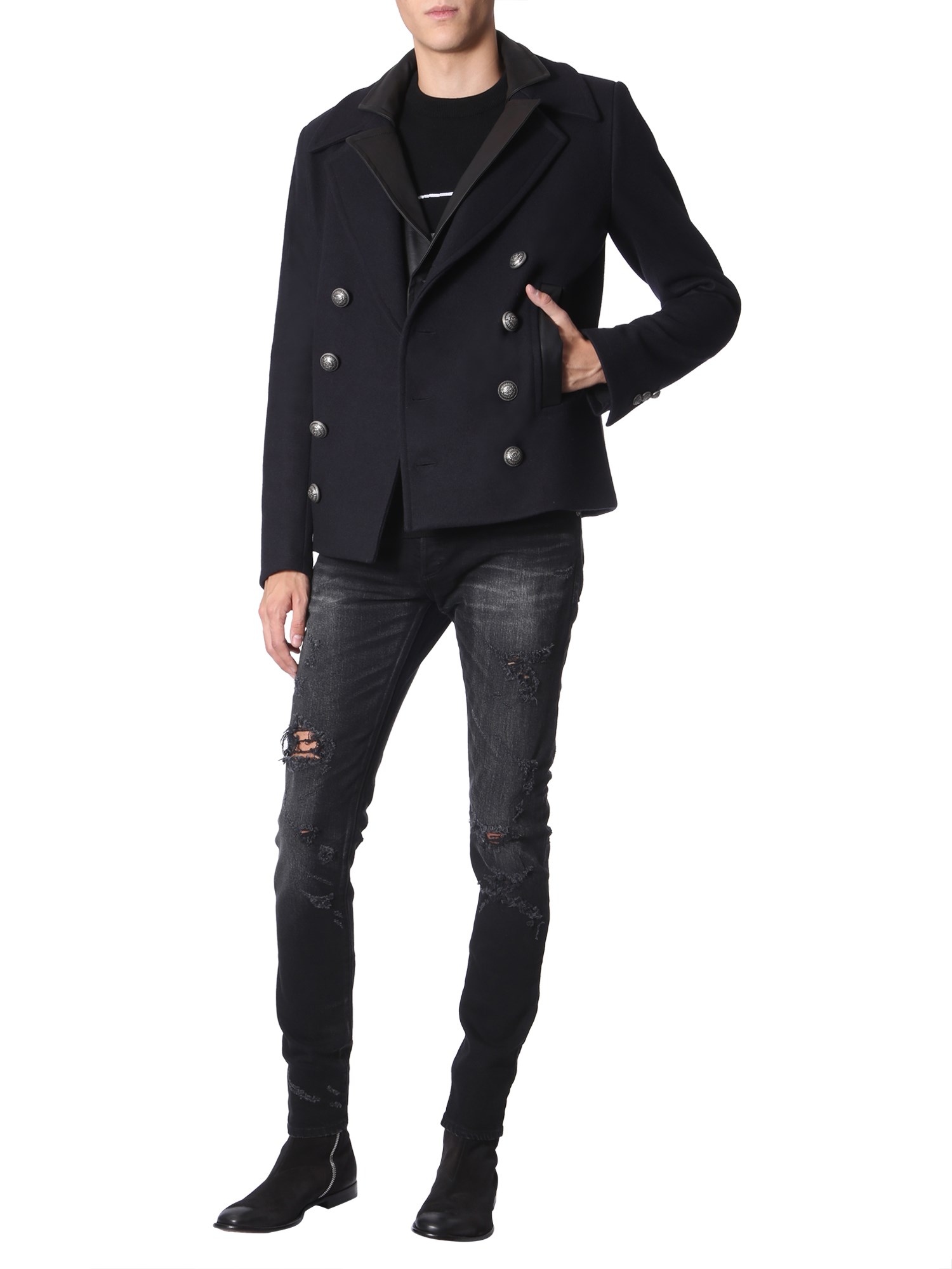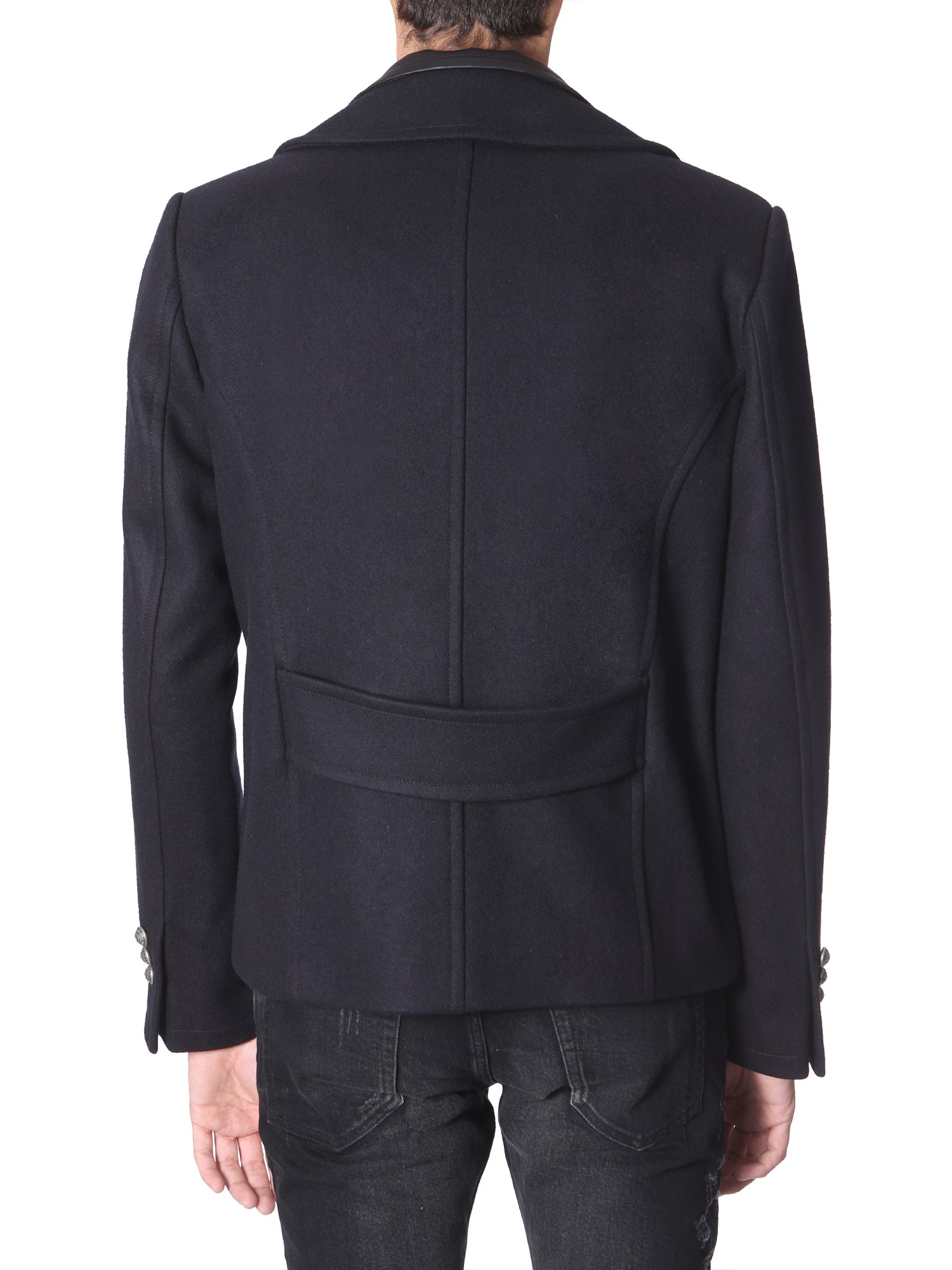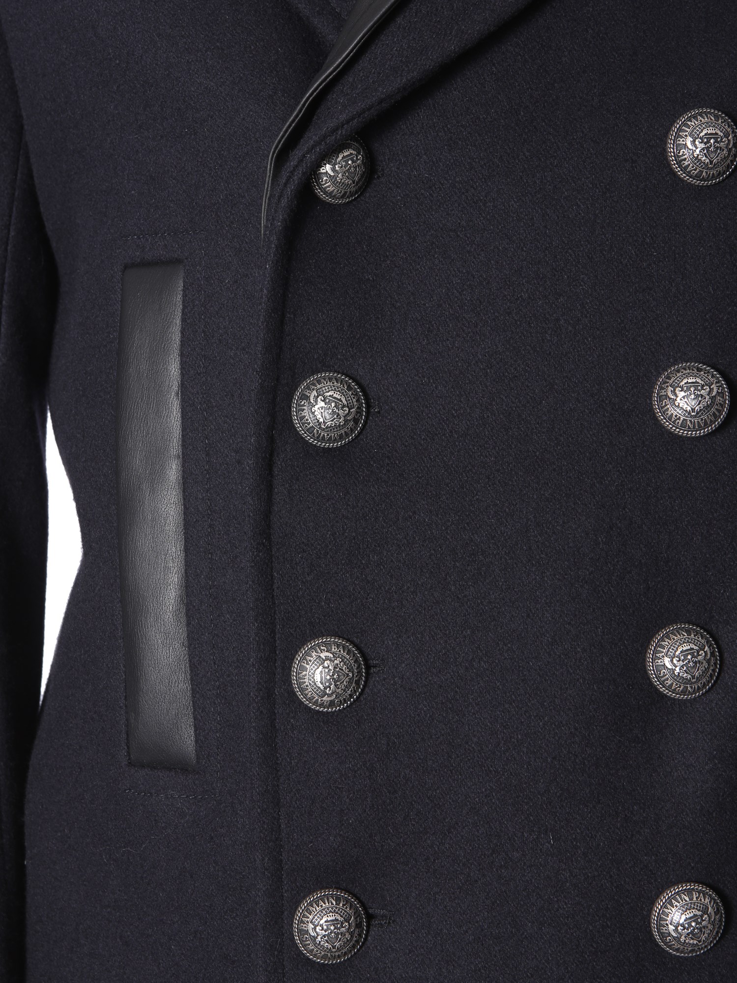 Adorned with double layered notched lapels, this double-breasted caban from Balmain will never fail to give a smart and formal look. It is made of premium wool fabric to give utmost warmth and a luxurious appeal. It has two side and two inner pockets for functionality. It is finished with inner lining for added durability.