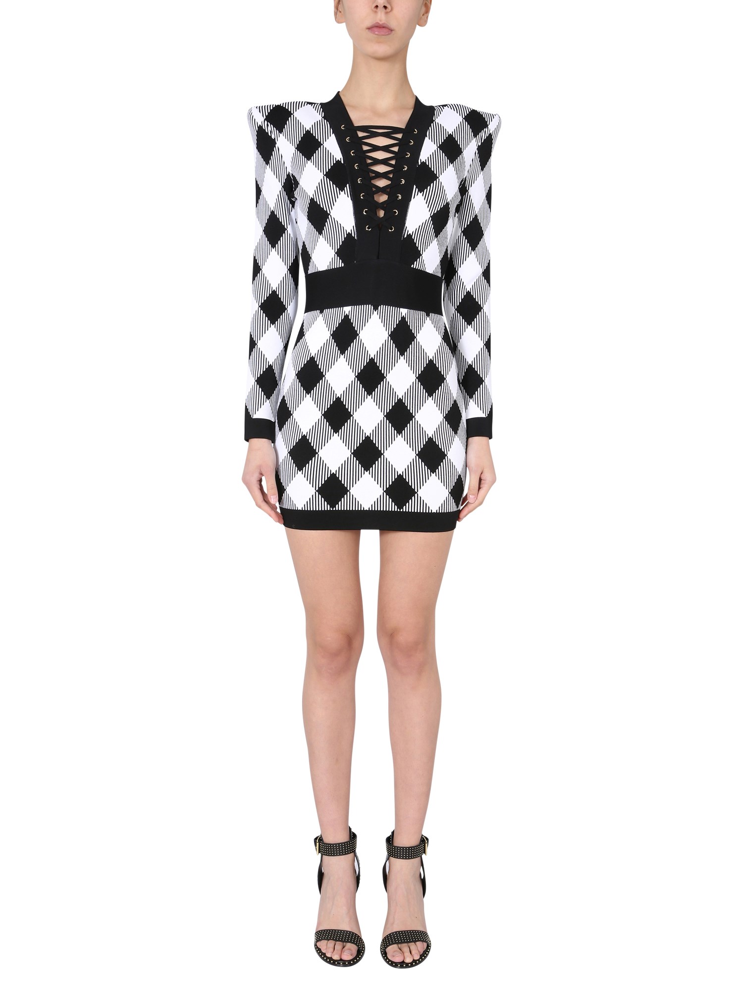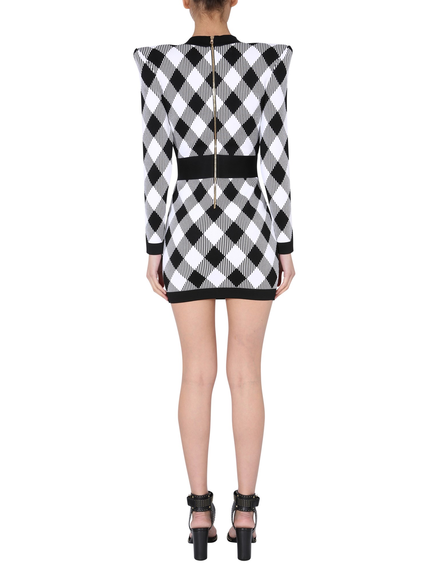This luxe, all-over jacquard knit dress by Balmain is a must-have for any season. Featuring a V-neckline with strings, back zip closure, and a cut at the waist, this elegant dress is perfect for any formal occasion. This dress is made from 86% viscose, 10% polyamide, and 2% elastane, the dress also has padded shoulders.