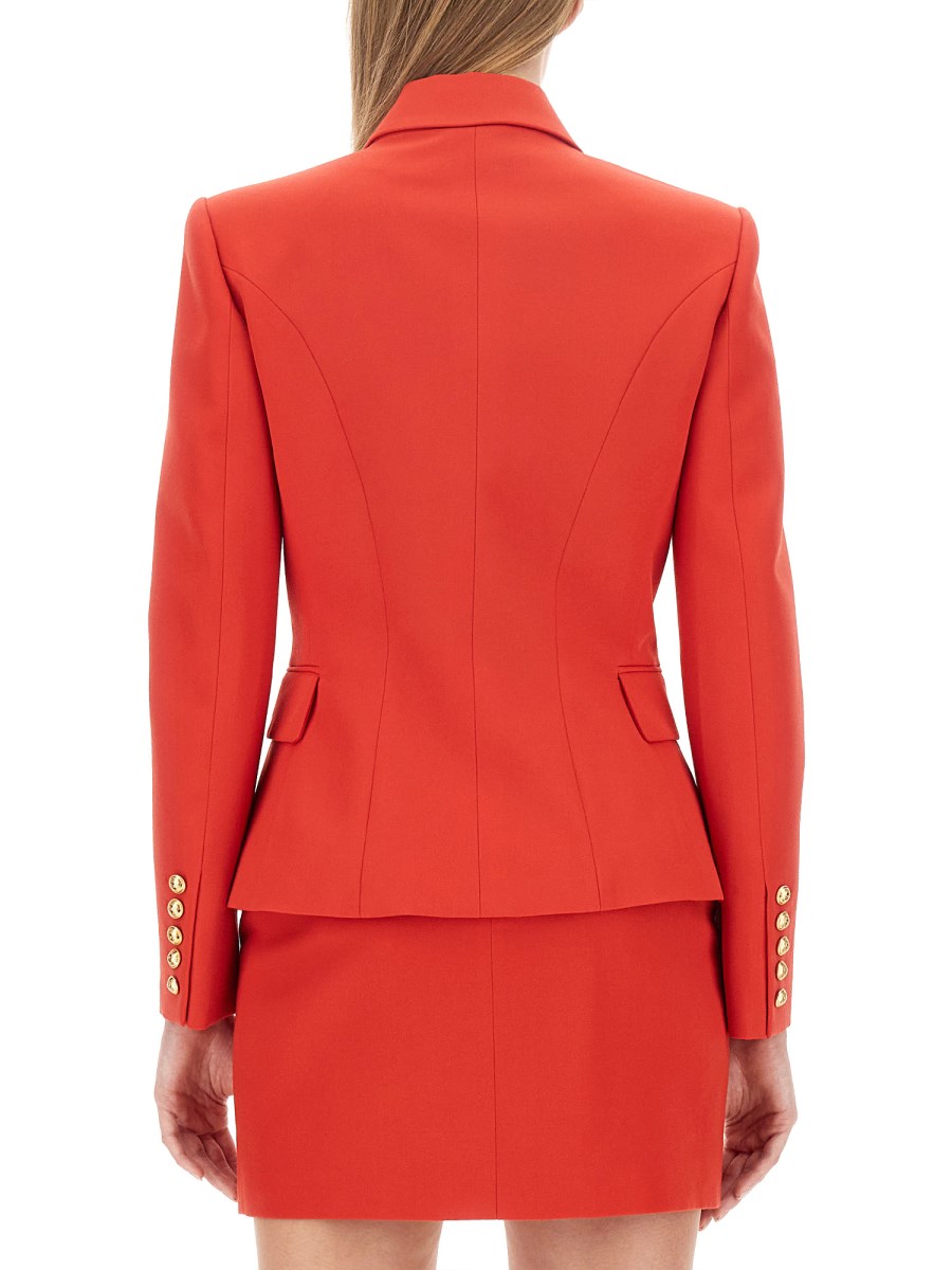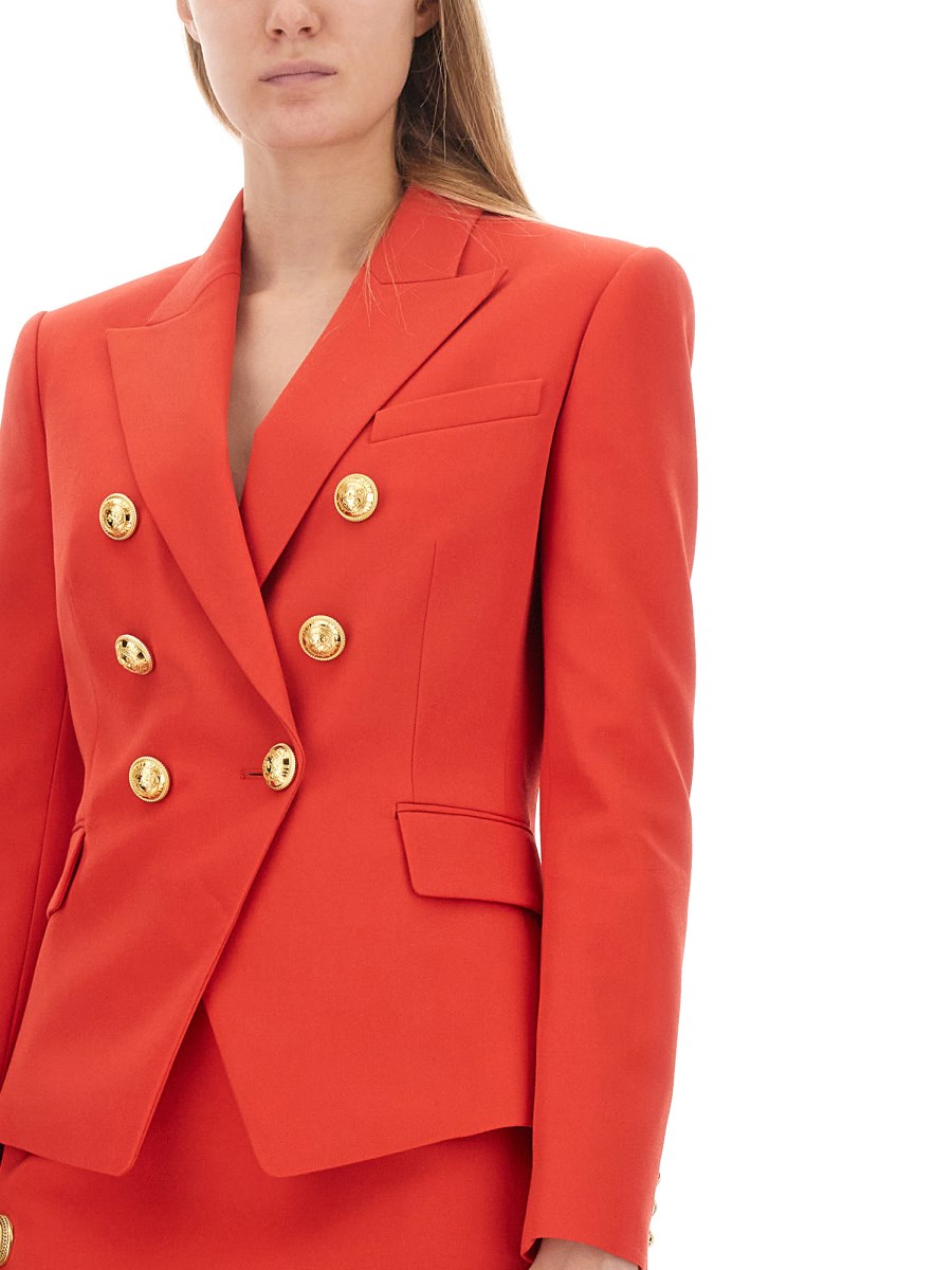 This wool jacket offers a sleek, tailored fit with peak lapels, structured shoulders, and long sleeves. Its double-breasted closure features six decorative golden metal 'Lion Head' buttons. With 100% certified responsible wool, it combines style and sustainability.