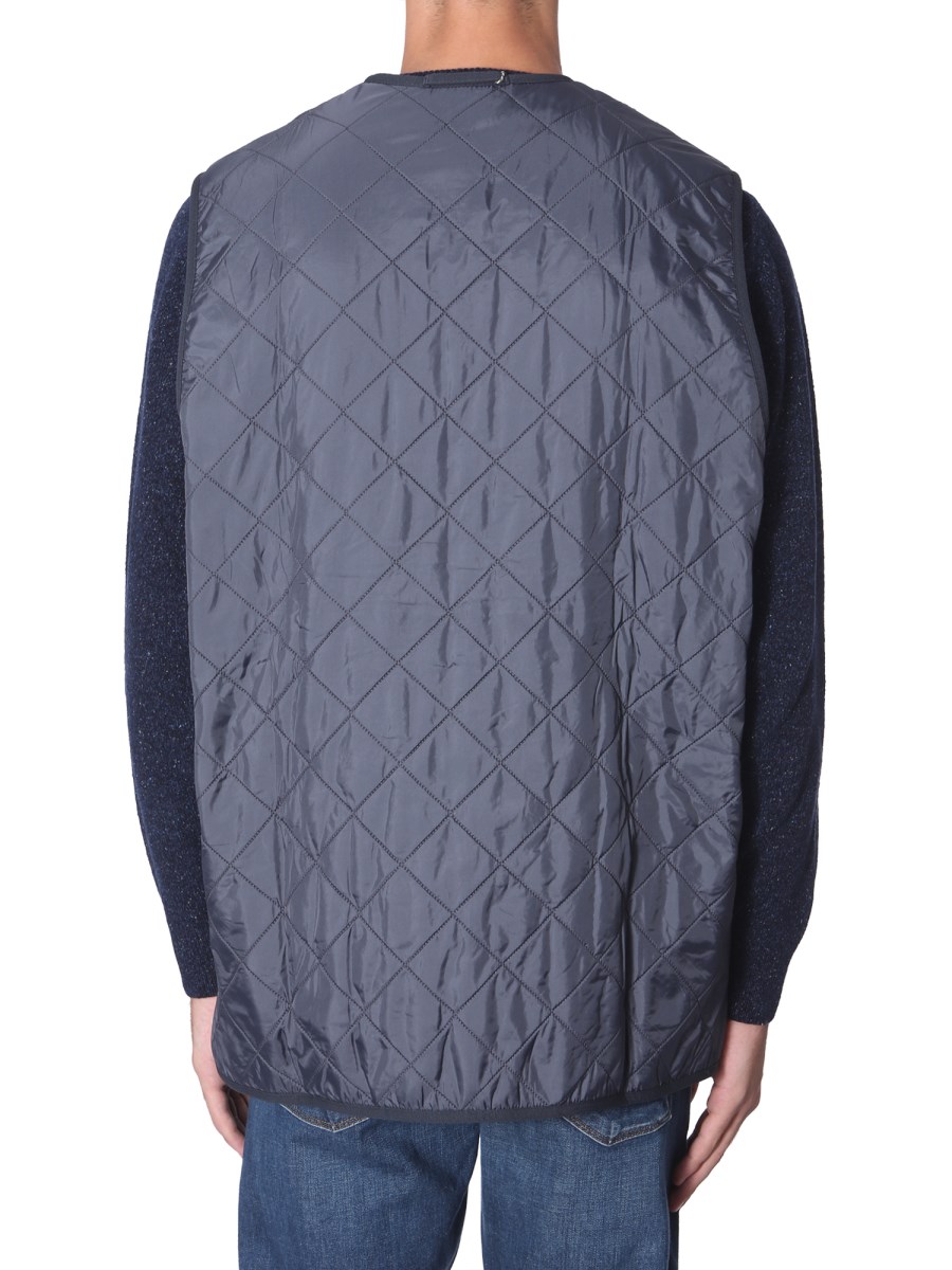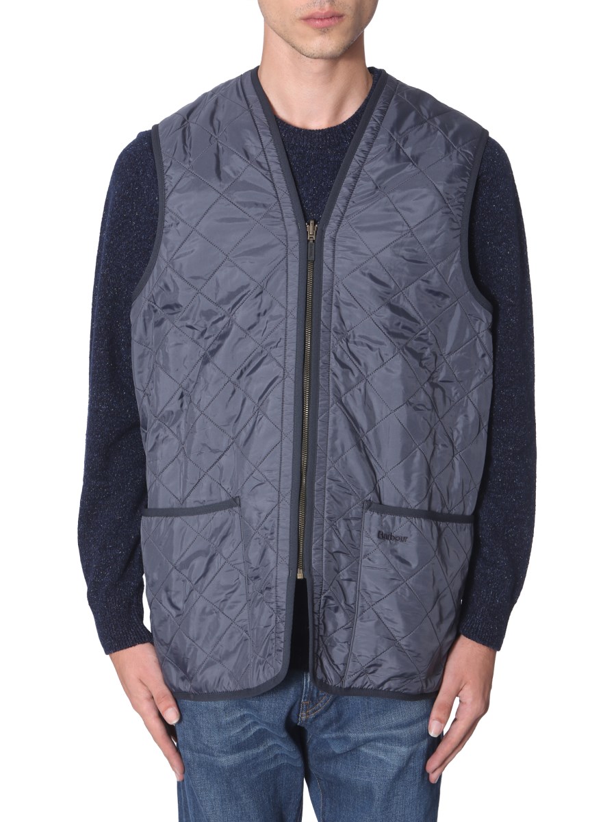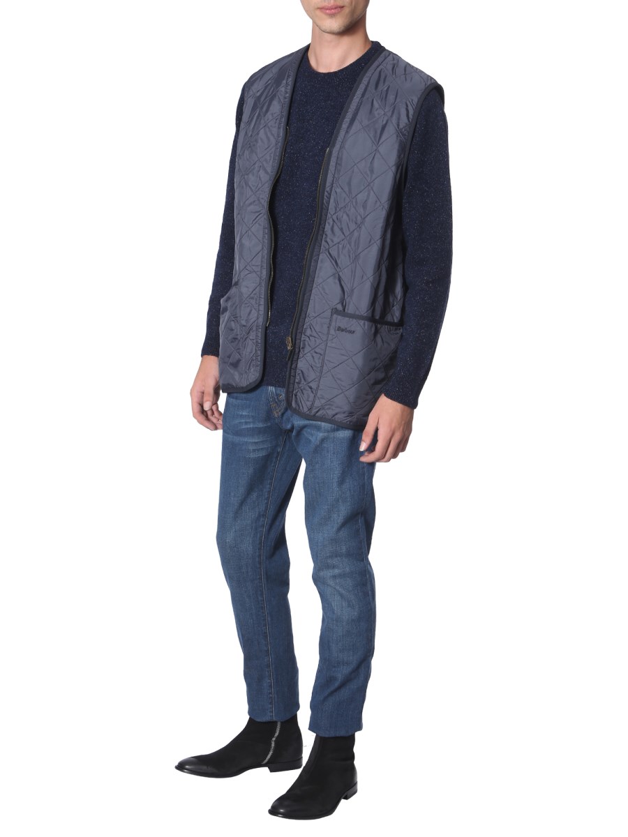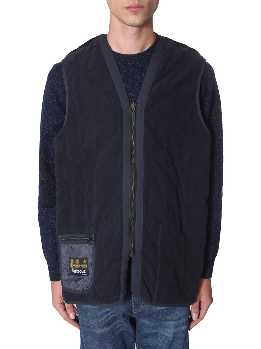 Don an uber-cool weekend look with this "polarquilt" padded sleeveless down jacket from Barbour. Made from a combination of polyester and polyamide, this sleeveless jacket delivers superior comfort. This stylish jacket is designed with attractive quilted pattern an added appeal. Tag this regular fit jacket with a white sweatshirt and blue jeans for a classy winter ensemble.