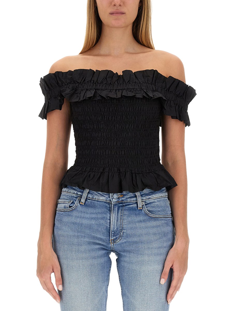 This top from Ganni is a perfect, breezy option for the summer. It's made of a soft, lightweight fabric with a light, airy feel. The off-shoulder neckline makes it easy to wear off the shoulder, and the bright black colour is perfect for the warmer months. This top has a subtle flair that is perfect for dressing up or down.