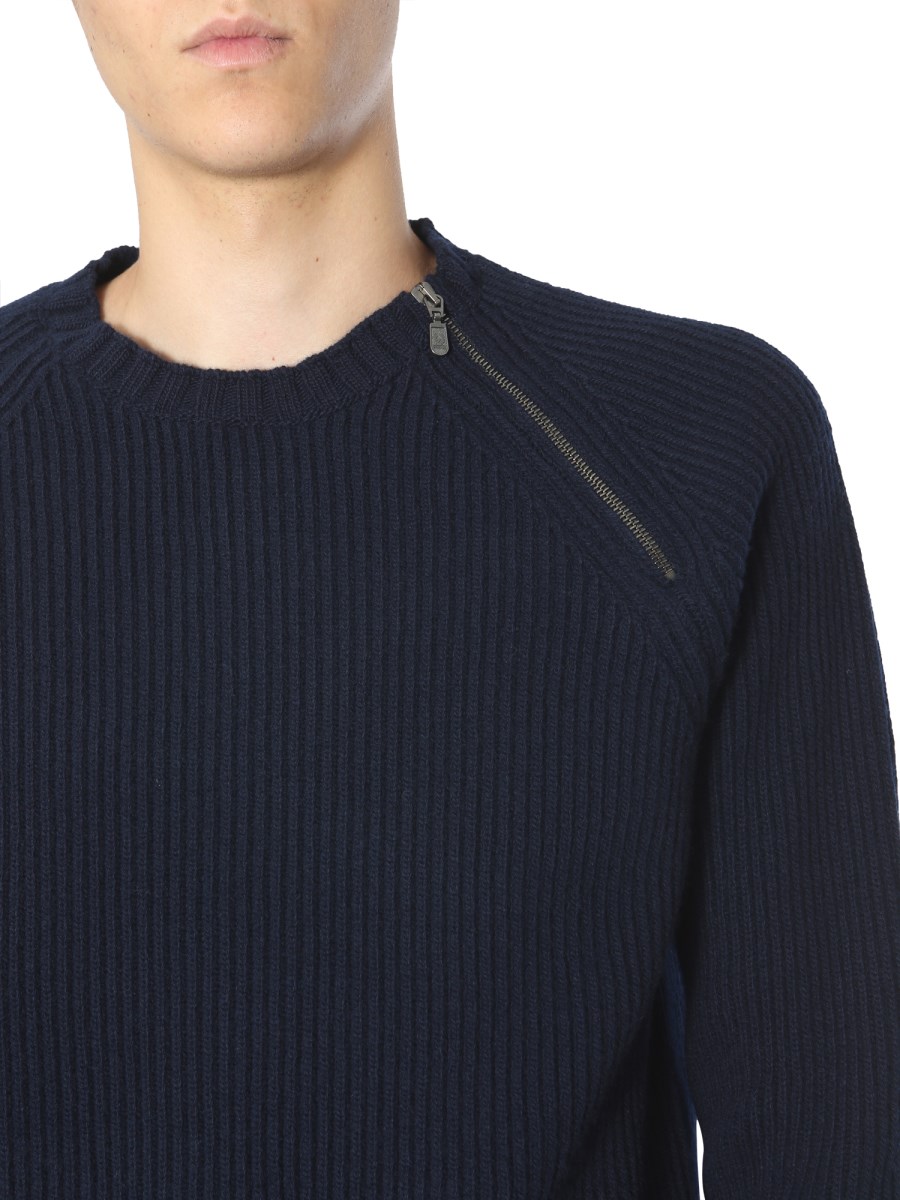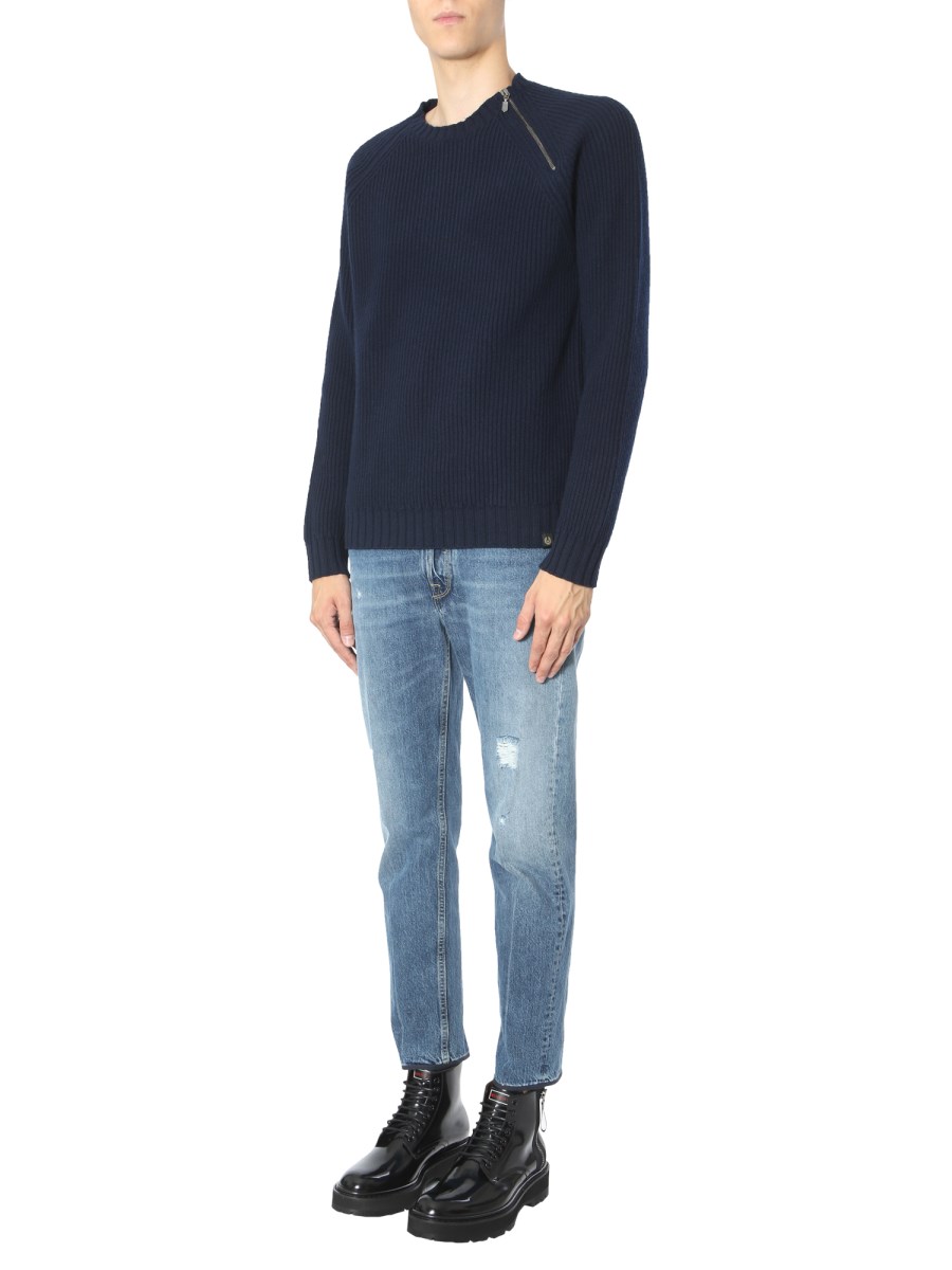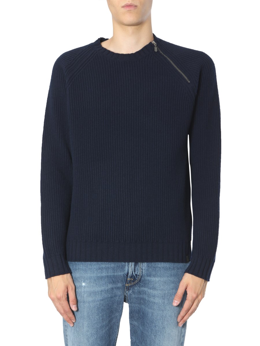 Upgrade your winter wardrobe with this crew neck sweater from Belstaff. The sweater is crafted from virgin wool that ensures utmost warmth. It comes with a ribbed neckline and zip embellishment for a trendy finish. You can pair this sweater with blue jeans and sneakers for a stylish winter ensemble.