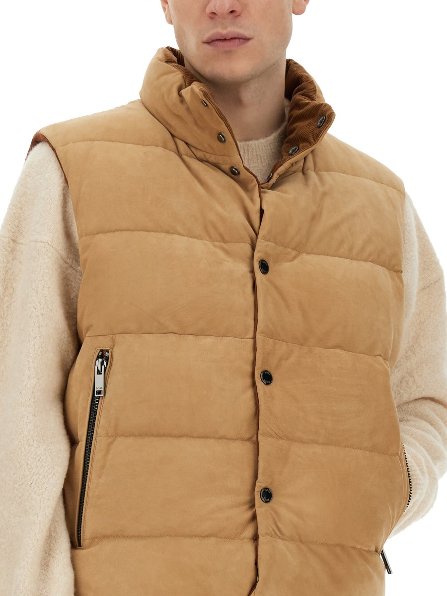 This jacket from Boss Camel seamlessly combines the timeless allure of genuine leather with the cosy warmth of down feathers. Its sleeveless design exudes a contemporary charm, allowing you to effortlessly layer it over your favourite ensembles. With its reversible feature, you can effortlessly switch between two distinct looks, ensuring you stay fashion-forward in any setting.