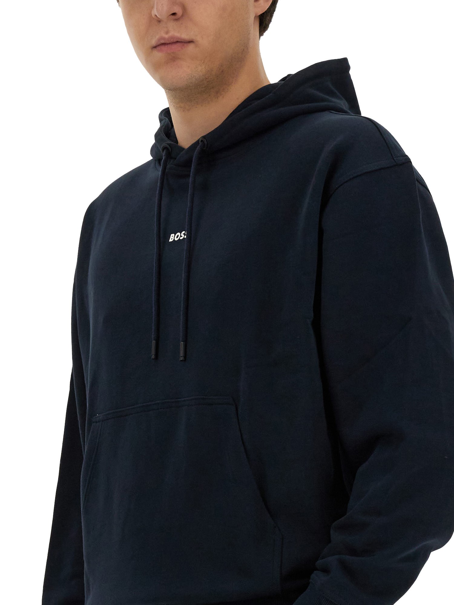 This black cotton sweatshirt from Boss features a drawstring hood for a customizable fit, making it both stylish and comfortable. The front logo adds a touch of branding without being too overpowering, making it a versatile piece for casual wear. Made from soft and breathable cotton, this sweatshirt is perfect for everyday use and can easily be paired with jeans or joggers for a laid-back look.