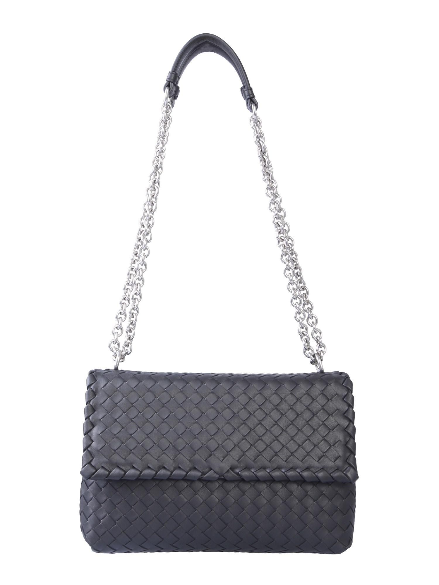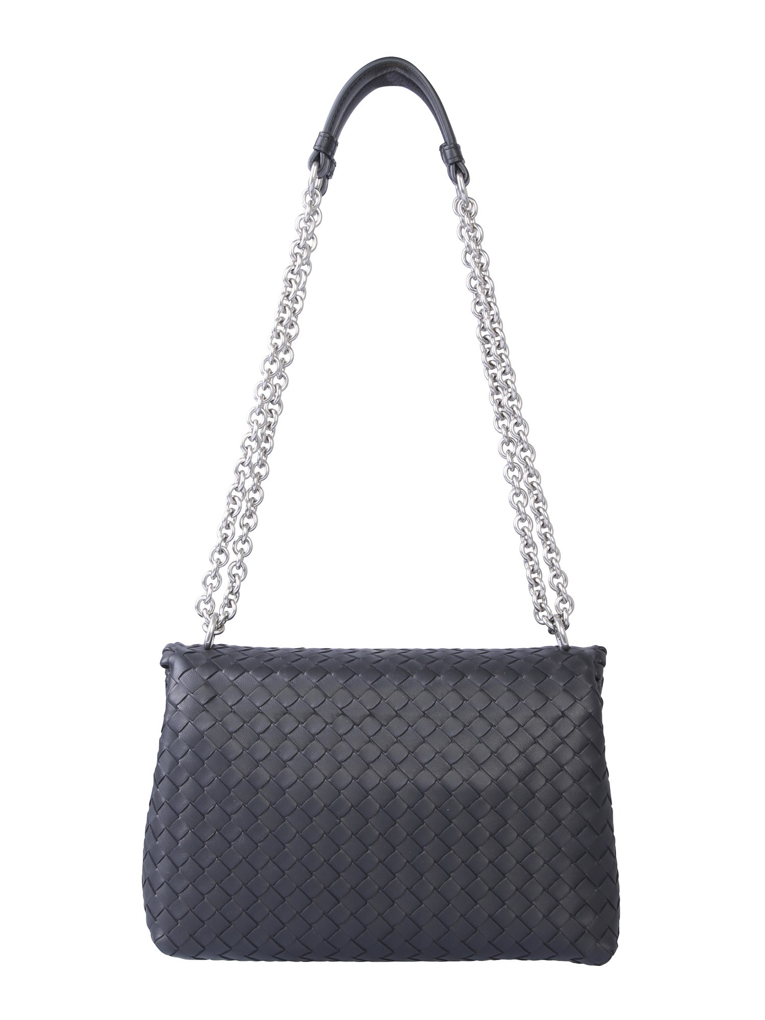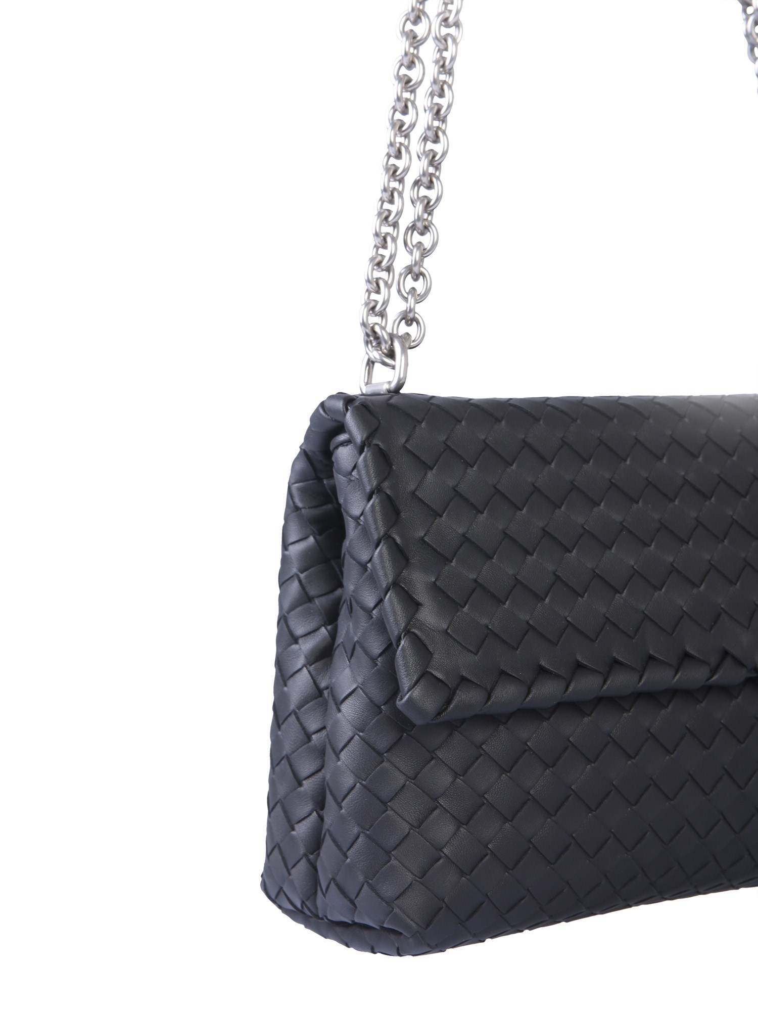 Embrace the ongoing trend with this small olimpia bag from Bottega Veneta. It has half chain and half leather shoulder strap that goes well with its leather body. It has magnet closure, inner pockets and two roomy compartments for better organisation of your stuff. The calf braided design gives it a visually appealing look.