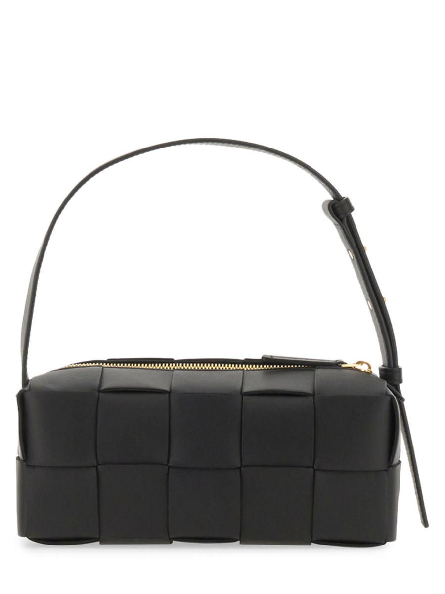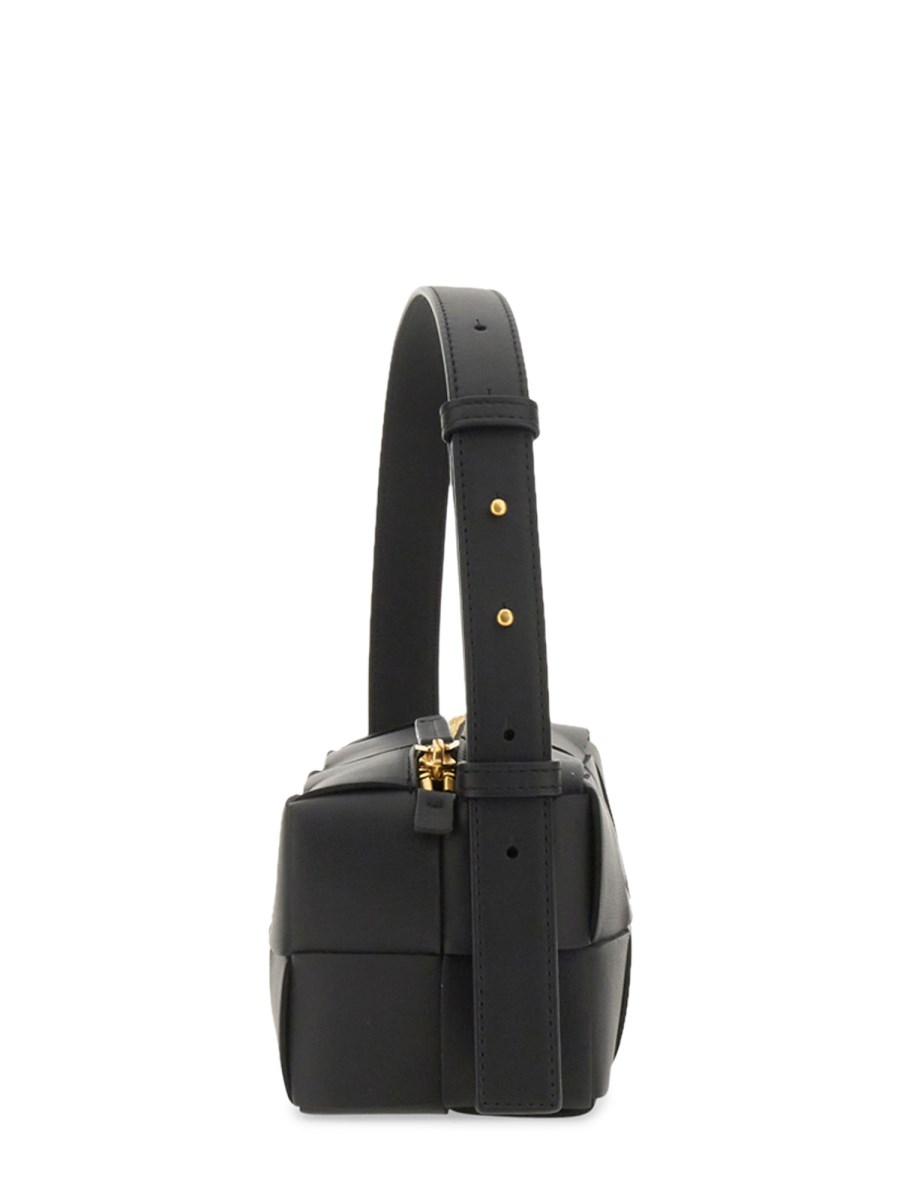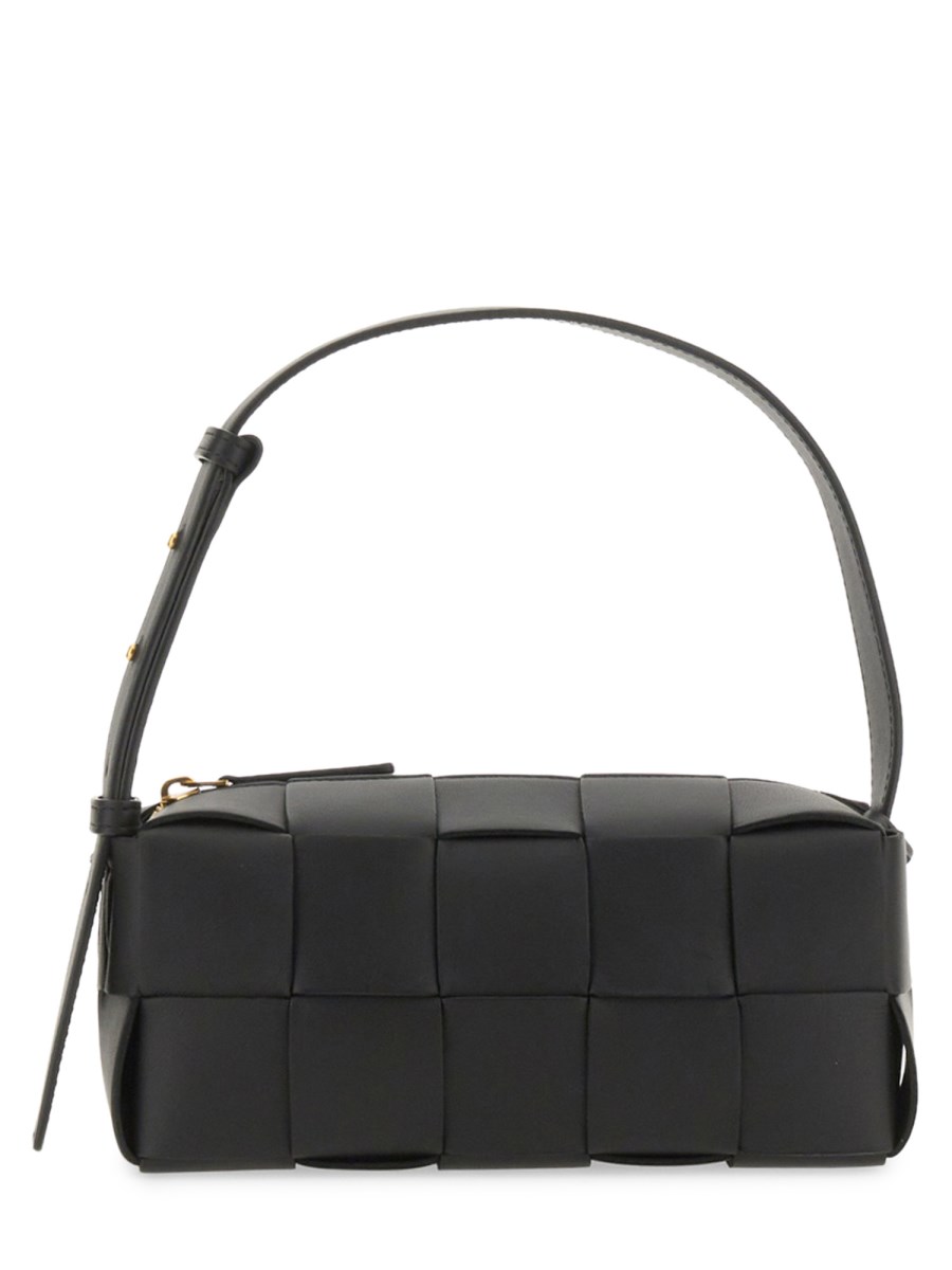 The Bottega Veneta Small Brick Cassette is a shoulder bag crafted using Intreccio techniques in soft lambskin leather, boasting an elongated brick silhouette. Its features include a single interior zippered pocket and zipper closure. Made of 100% Lambskin with lambskin bonded Intreccio lining, it's available in black with gold-finish hardware. Dimensions: Height: 10 cm, Width: 23.5 cm, Depth: 10 cm, Strap drop: 20 cm. Made in Italy.