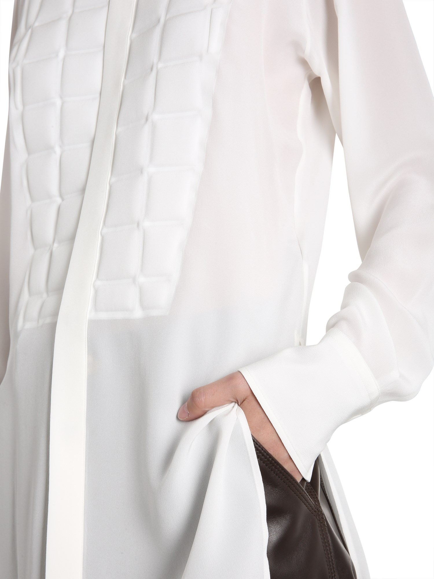 Blended looks like the ones featured in this silk shirt from Bottega Veneta take your outfit from regular to premium. The shirt is made from Crepe de Chine silk fabric and a padded quilting detail around the chest.The straight collars and taped button closure make this shirt suitable to wear in official meetings and events.