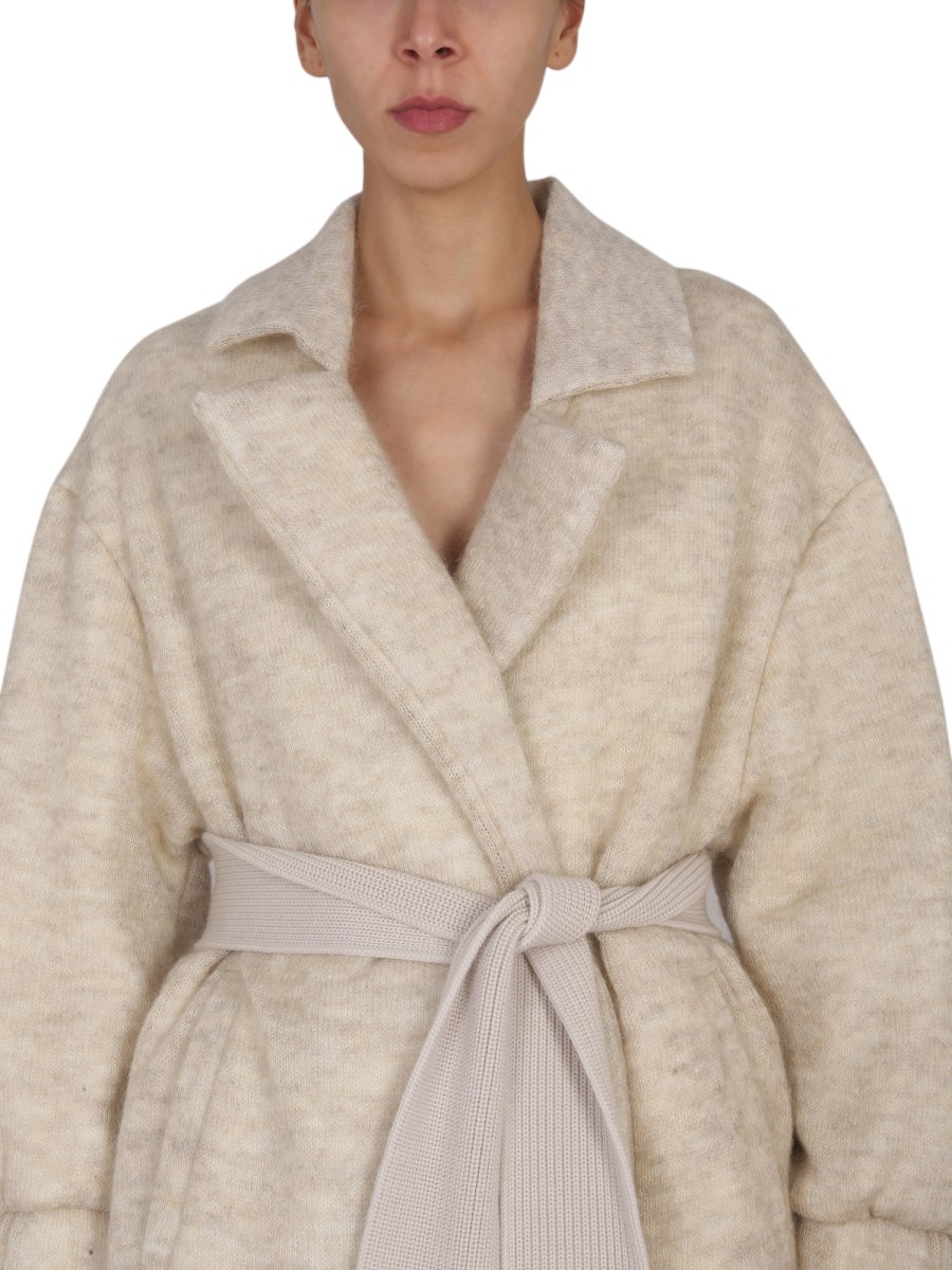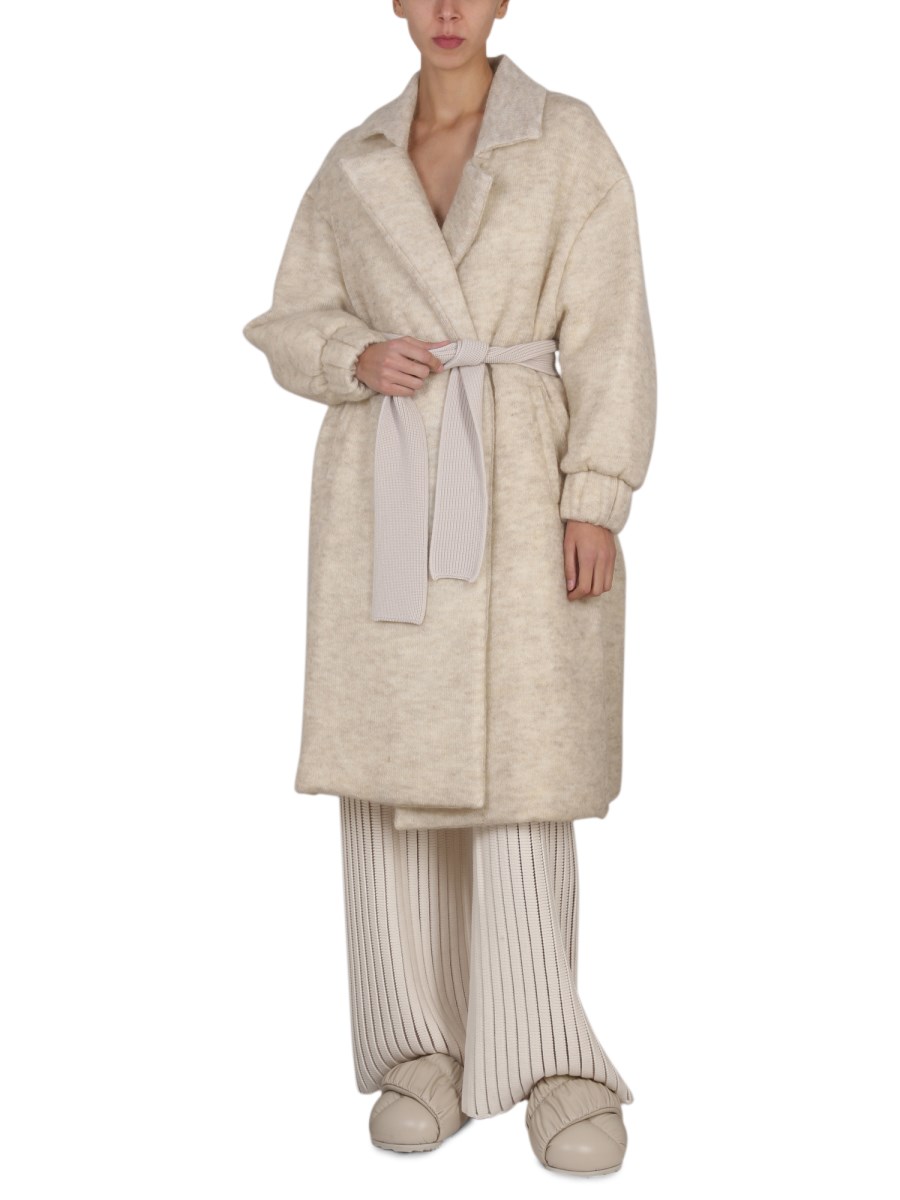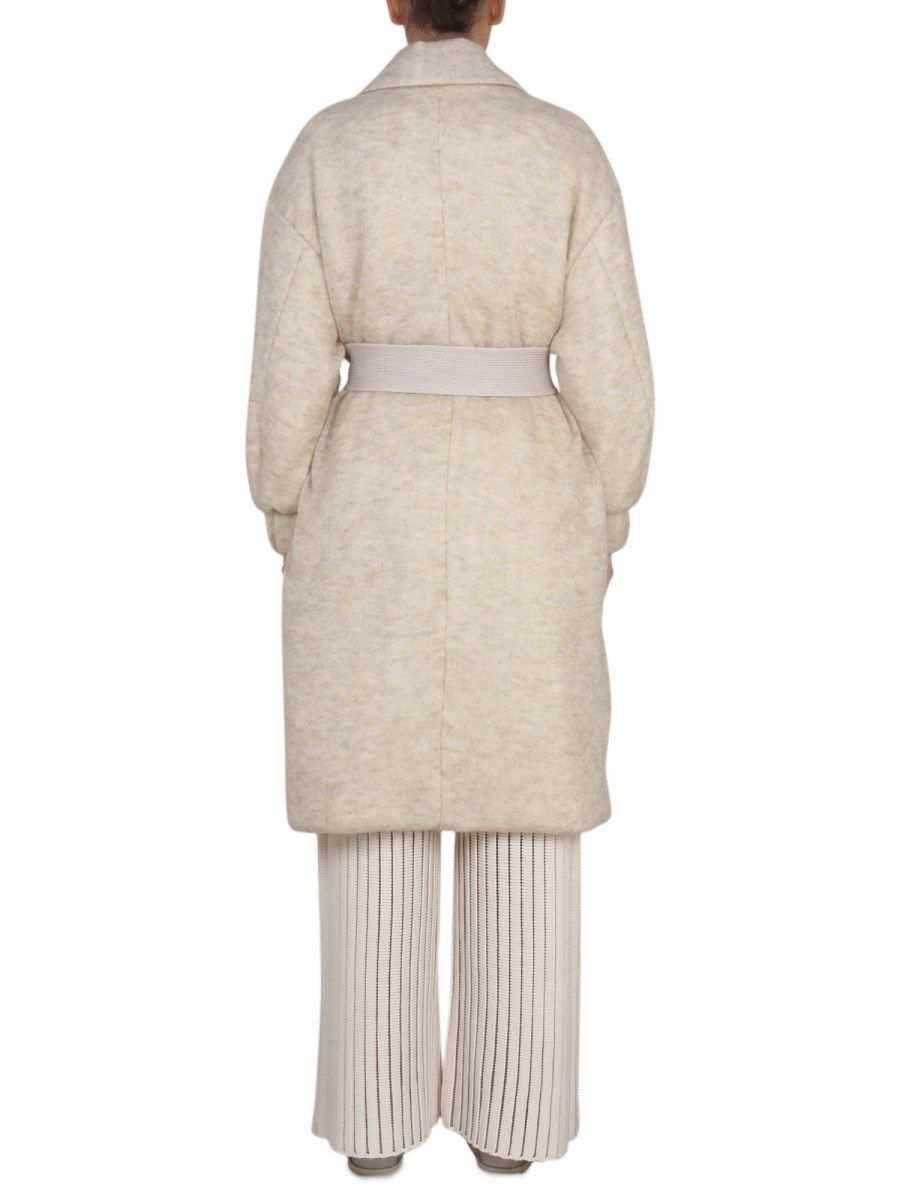 This classic style coat from Fabianna Filippi is made from a soft, mohair blend, which is sure to keep you warm in the coldest of weather. This lapel knitted belt closure coat features a belt closure, a curved hem, and a relaxed fit. This classy, yet casual mohair blend coat is the perfect accessory for any outfit.