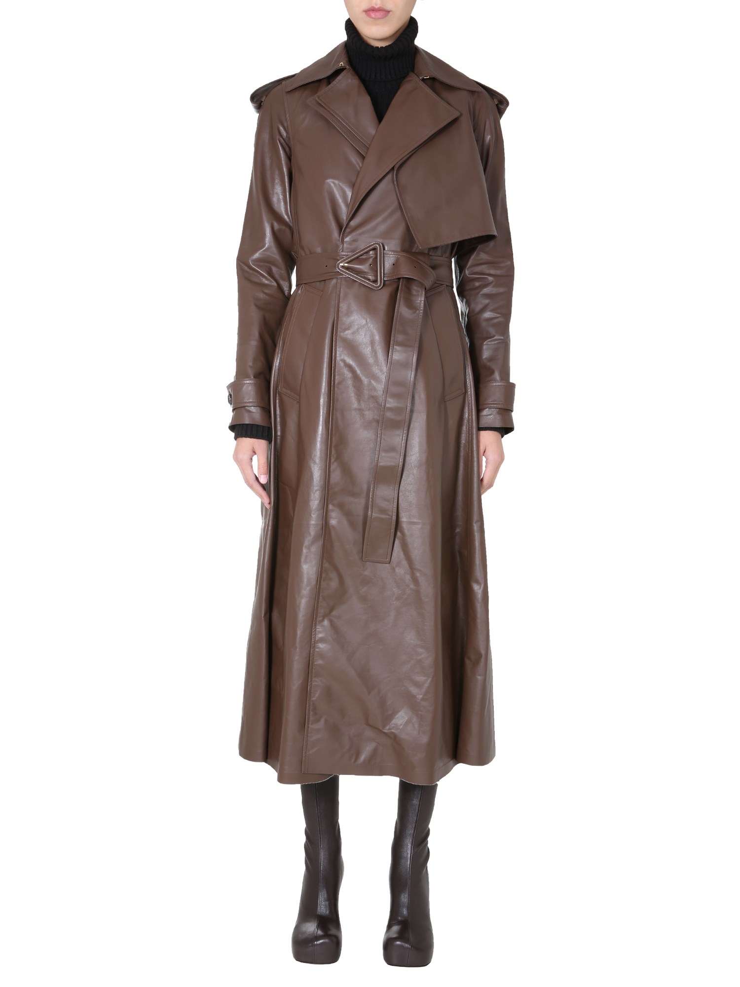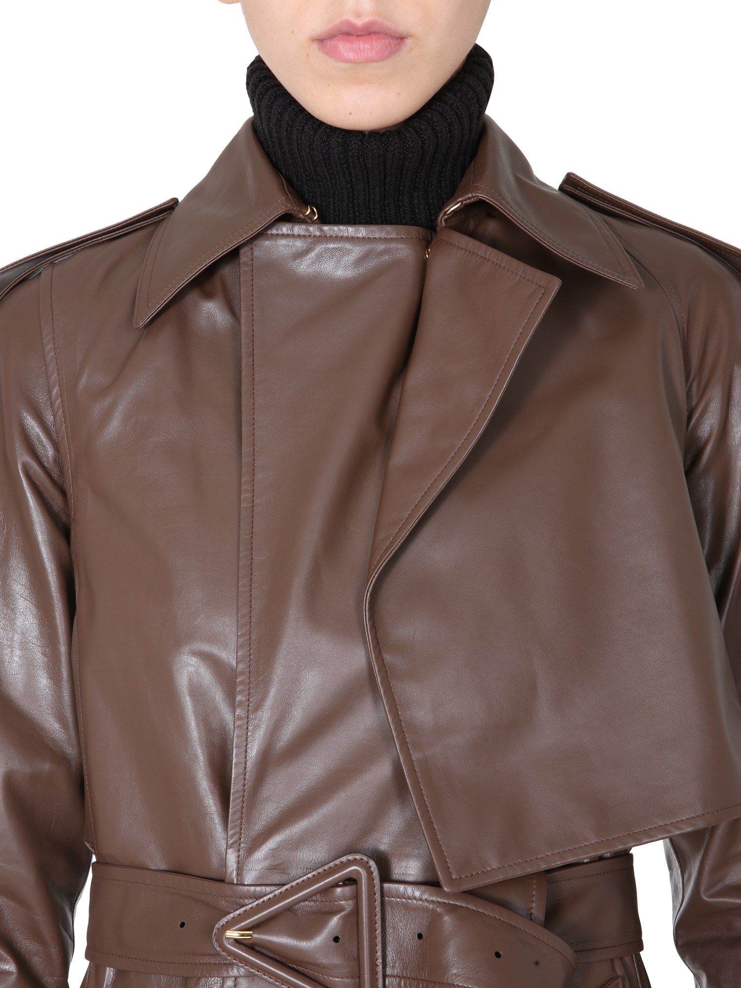 The phenomenal fashion brand, Bottega Venetta brings to you this breath taking and charismatic Long Trench coat with a slit on the back. This trench coat comes with buttons on the shoulders, cuffs and on the neck for closure. It has an adjustable waist belt with side pockets. It is made with 100% calf leather and has a windbreak flap, making this a chic addition to your winter collection.