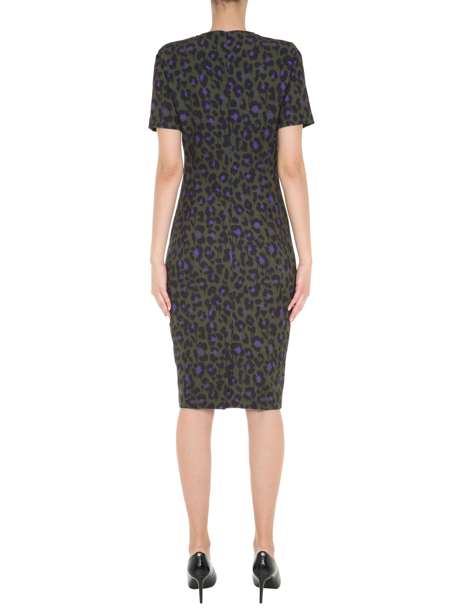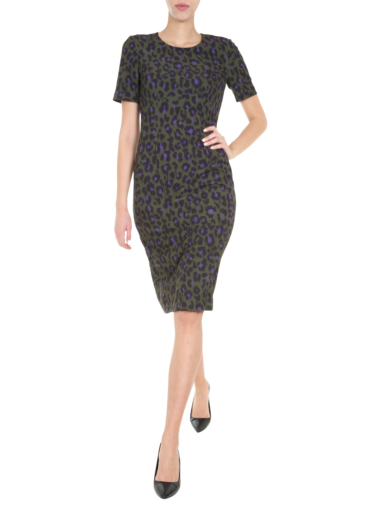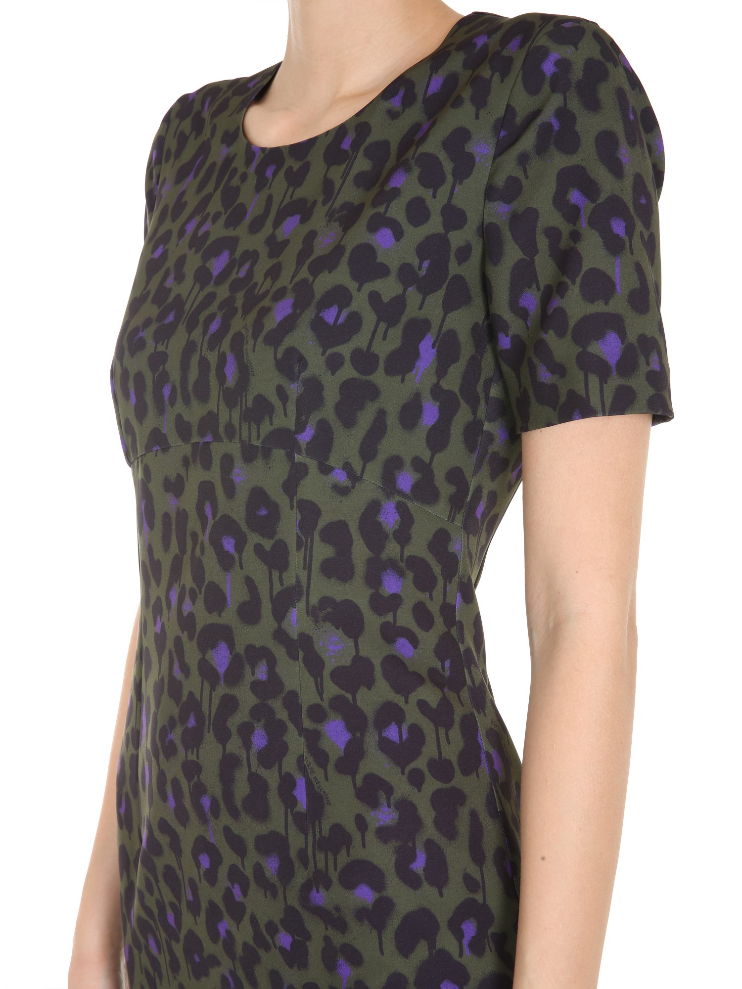 Create a stunning party look as you wear the boutique Moschino pencildress. It has a dripping effect and animal print detailing all over. With a back slit and invisible zip closure on the back, this pencil dress gives you a sensuous appeal. It has a round neck and short sleeves. This dress is made with a blend of polyester and elastane.