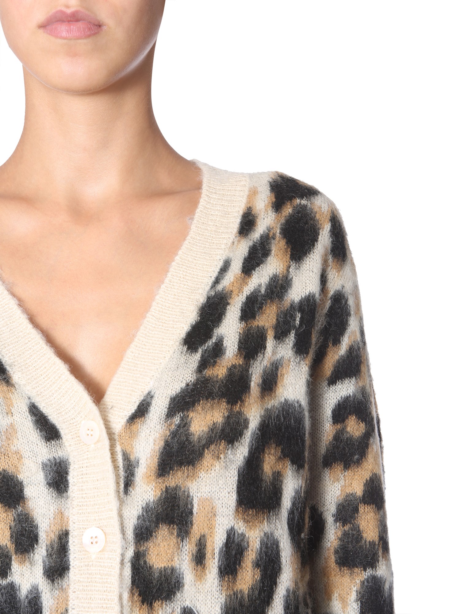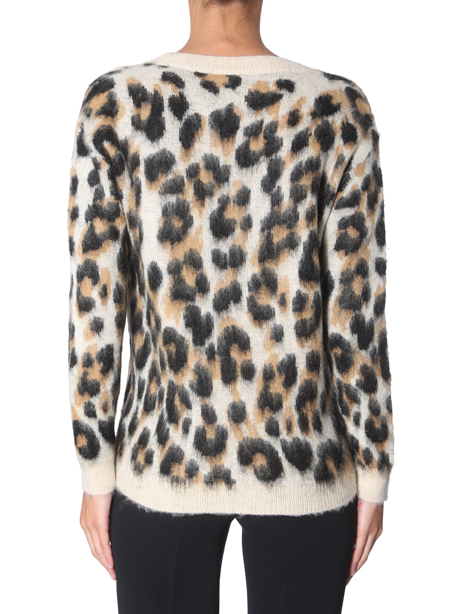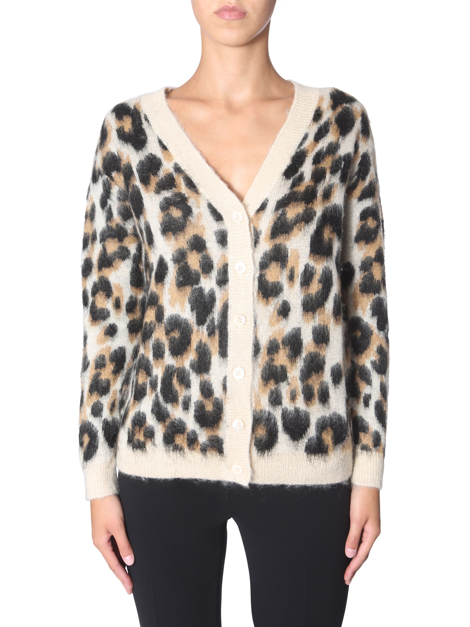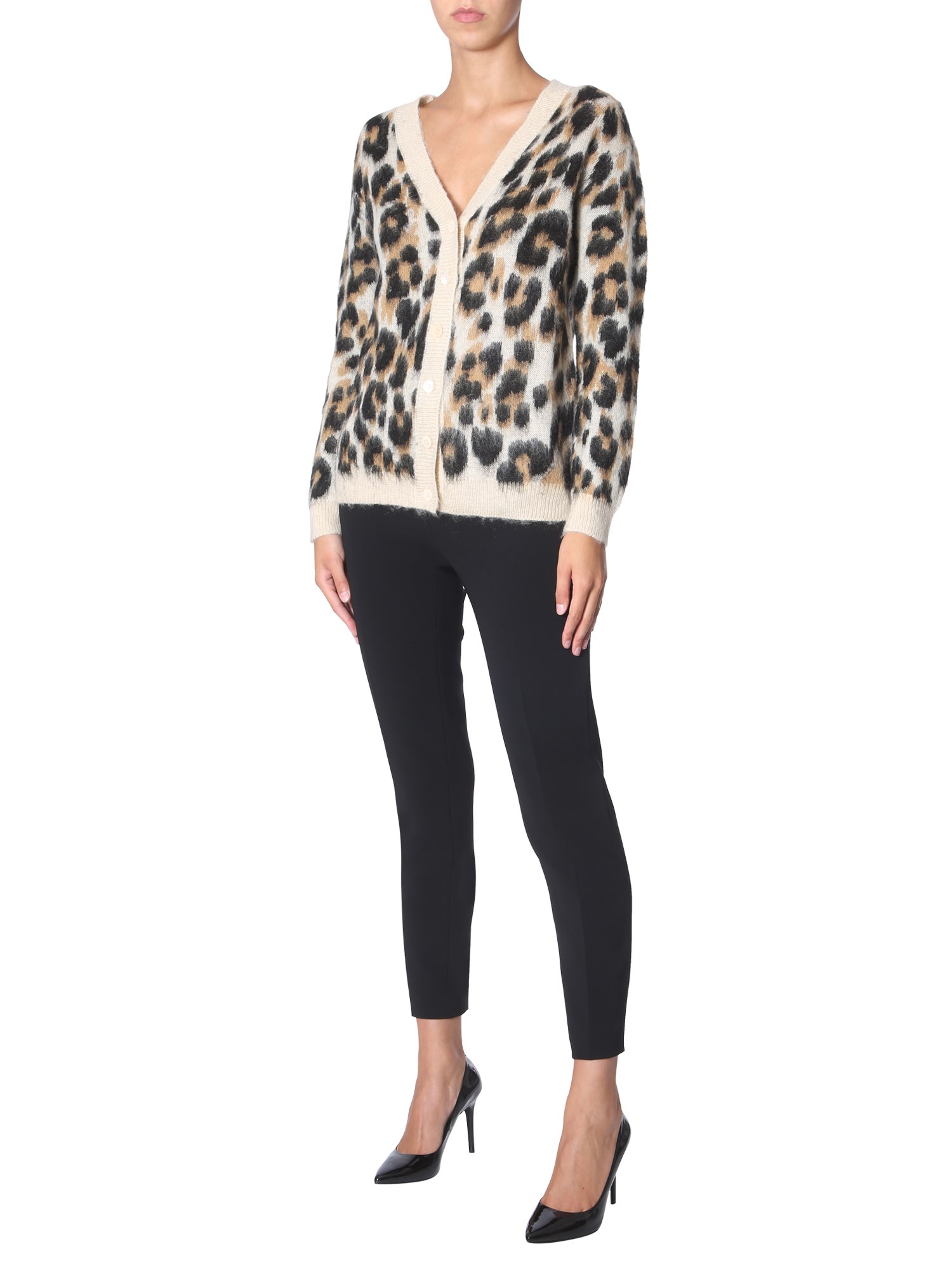This cardigan from Boutique Moschino features the softness of mohair and appeal of an animal print. Smooth to touch and easy to wear, this sweater has a V-neck and front button closure. The regular fit makes it suitable to wear for all events and occasions. For the best look, wear it with a skinny pair of jeans.