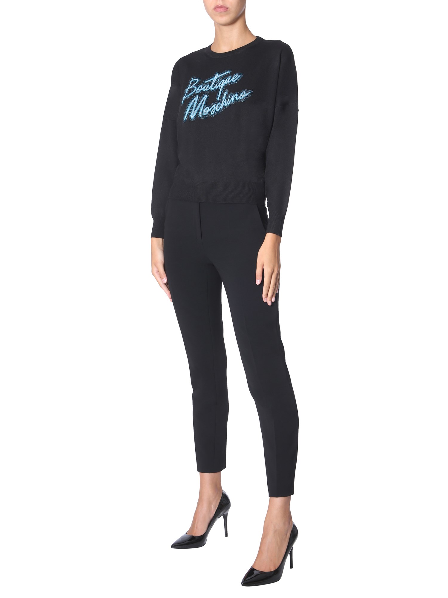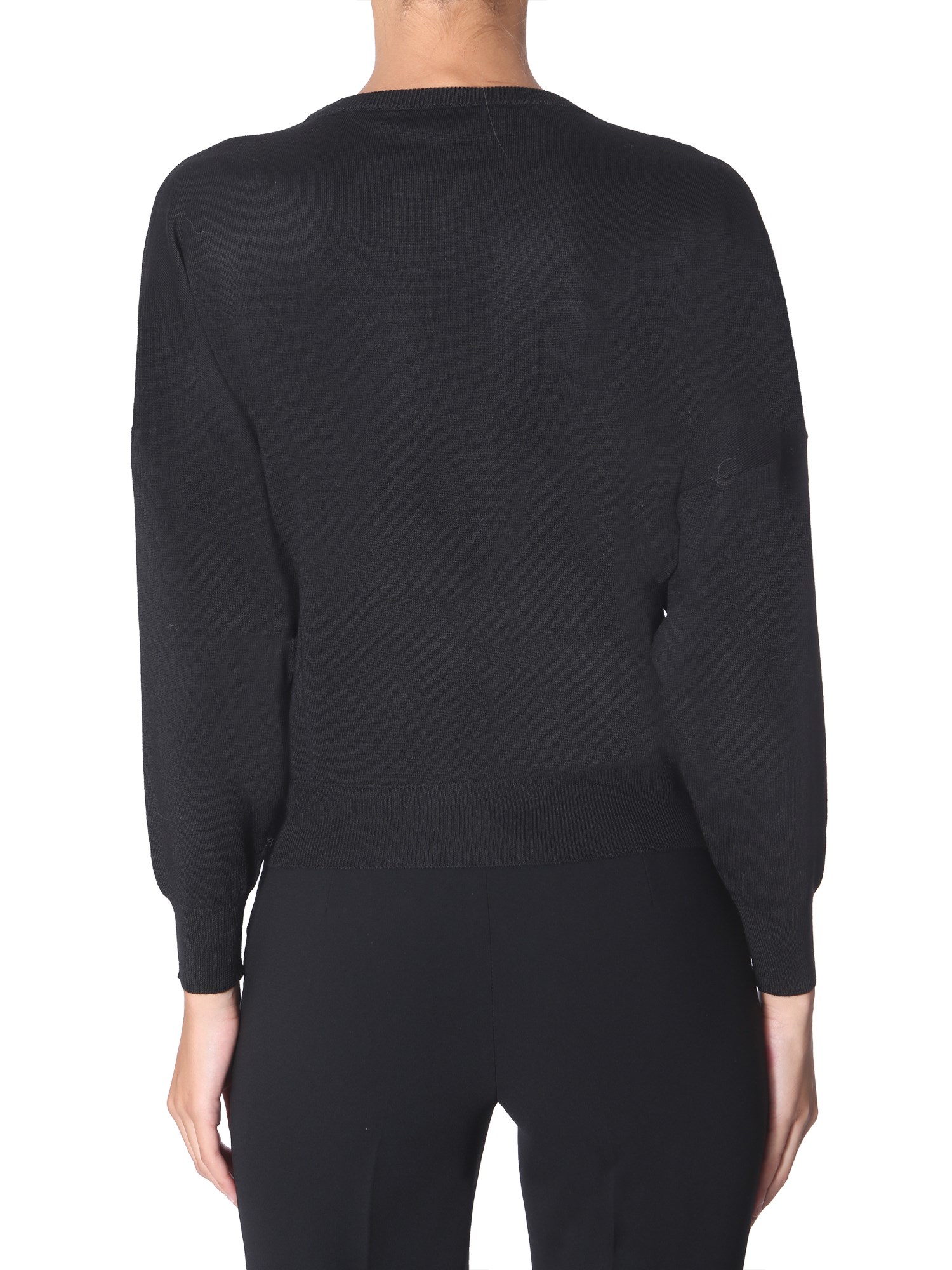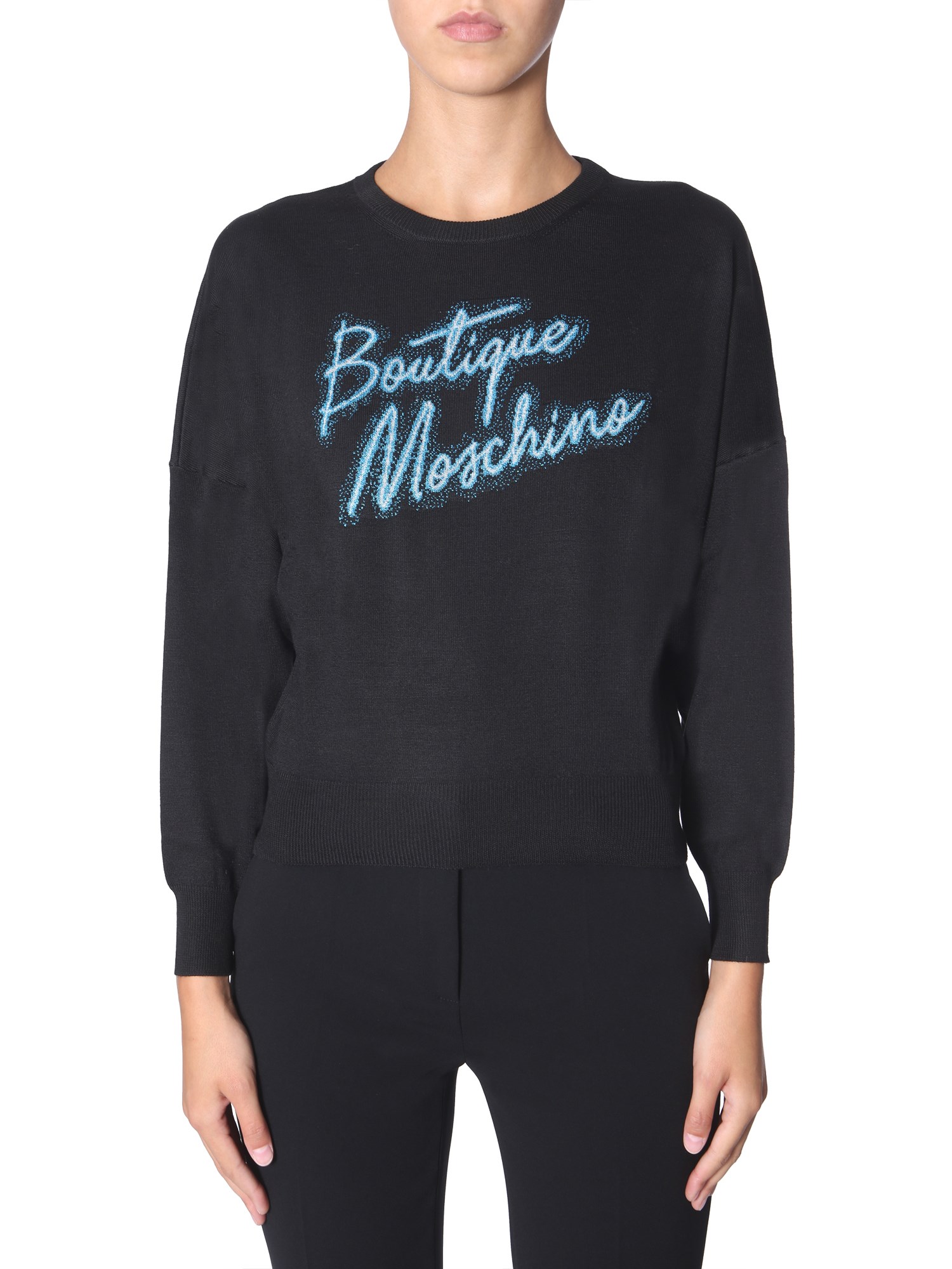 For a woollen sweater, this one from Boutique Moschino is extremely comfortable and snug. It has a regular fit with a printed branding at the front. The crew neck and drop shoulders are featured in a relaxed way. You can easily wear it with trousers, a pair of jeans or shorts.