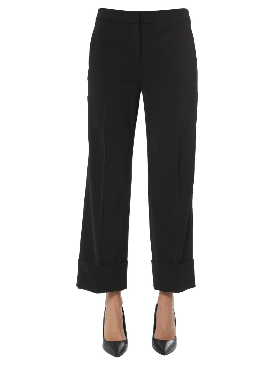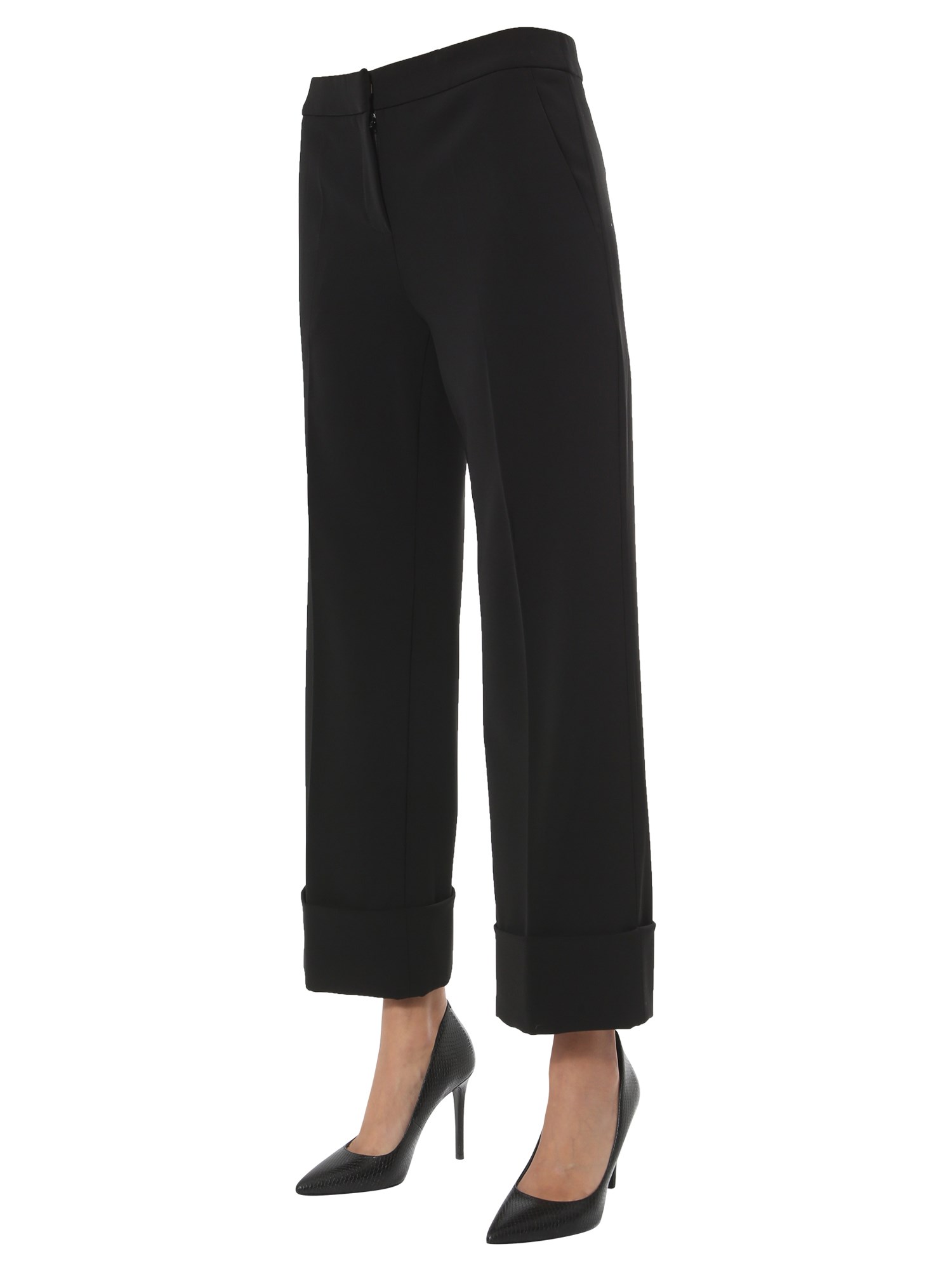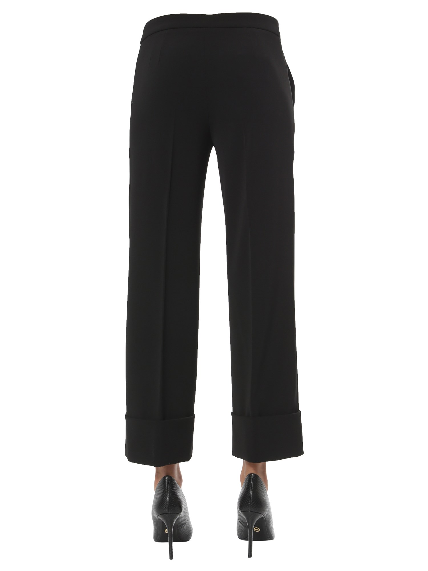 Add these unique and comfortable wide trousers from Saint Laurent to your wardrobe. They are made ofpolyester and elastane for enhanced softness and a luxurious finish. The plain surface gives them a classic appeal. It has front zip and hook closure and multiple pockets to keep your phone and keys.