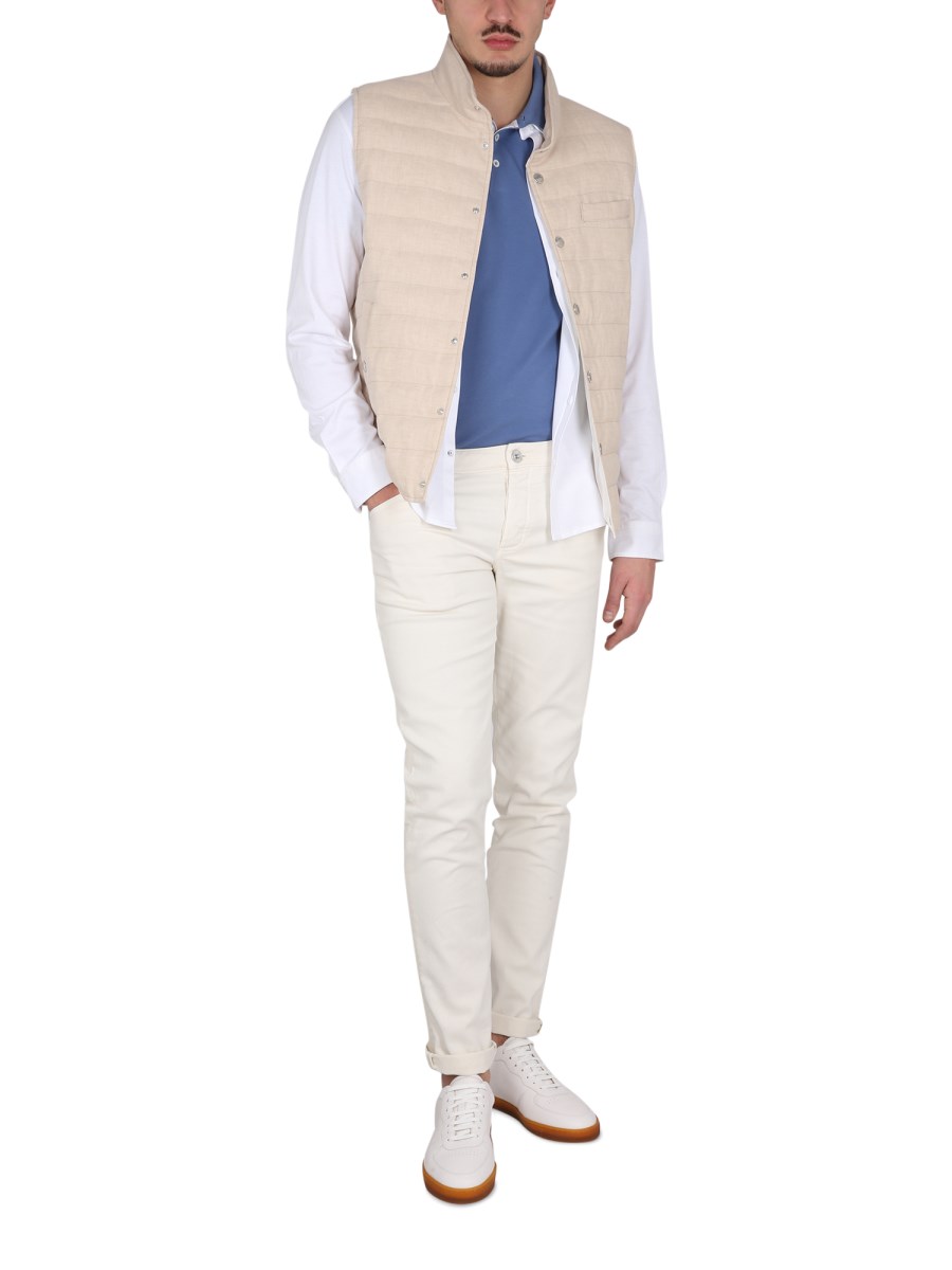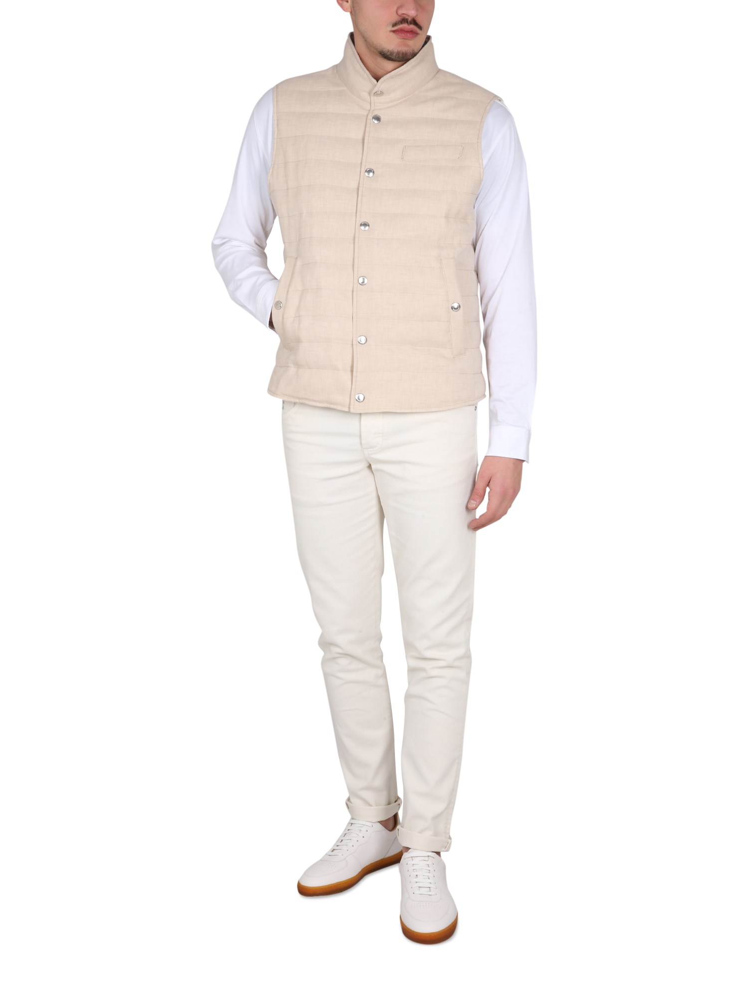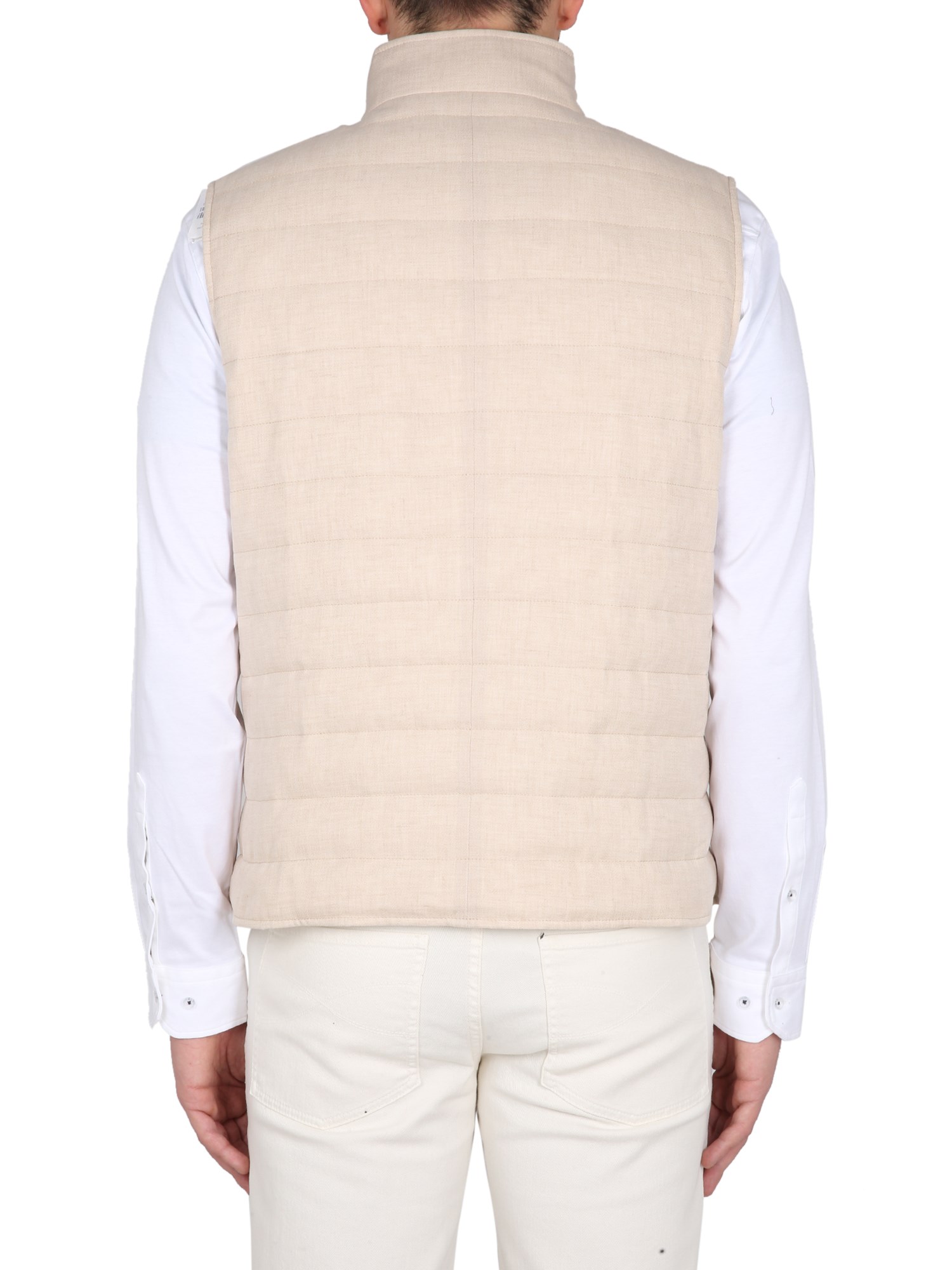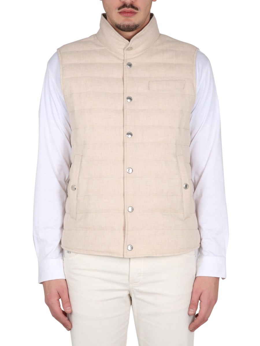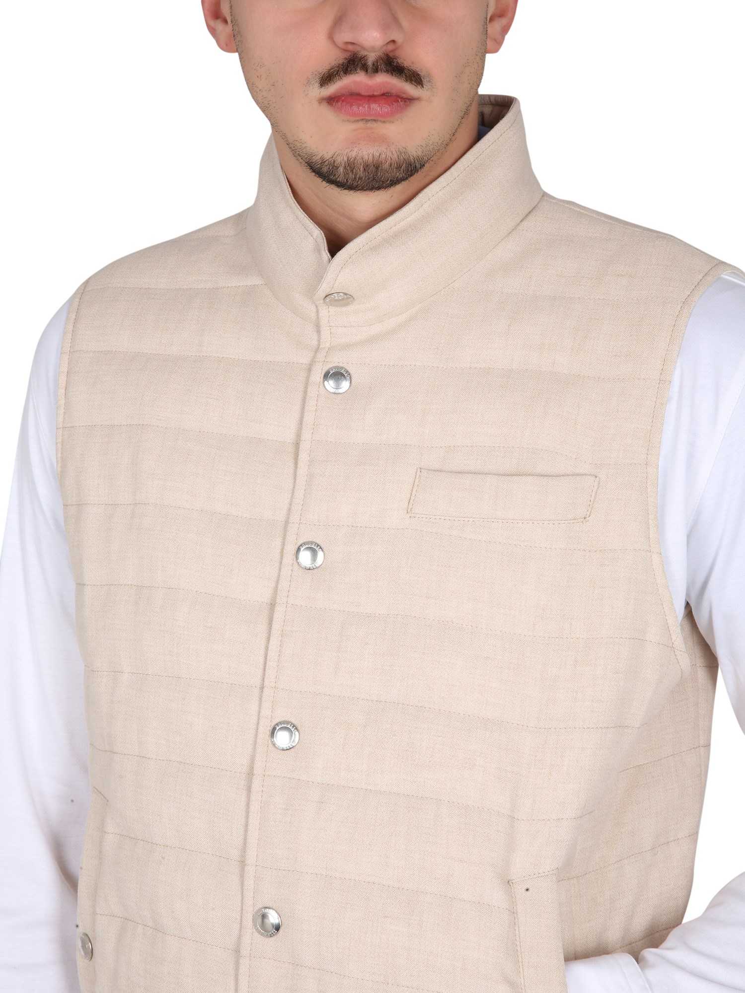 This linen vest from Brunello Cucinelli is so versatile and comfortable, it can be dressed up or down. It is padded with wool and features a button closure. A stylish vest with a slightly padded and cosy feel. With a high neck and buttons on the front, this vest is great for layering over your favourite shirt or top.