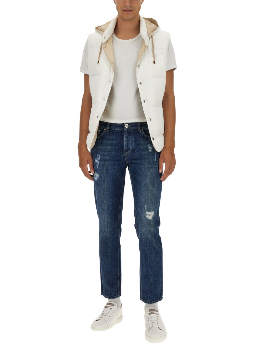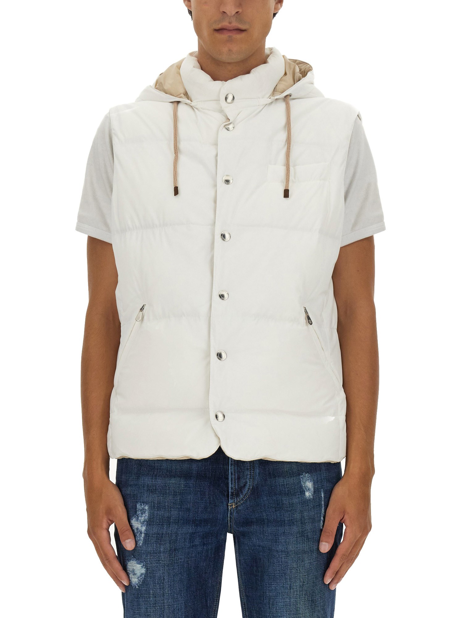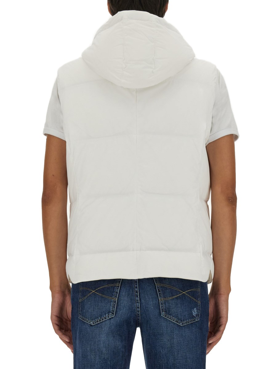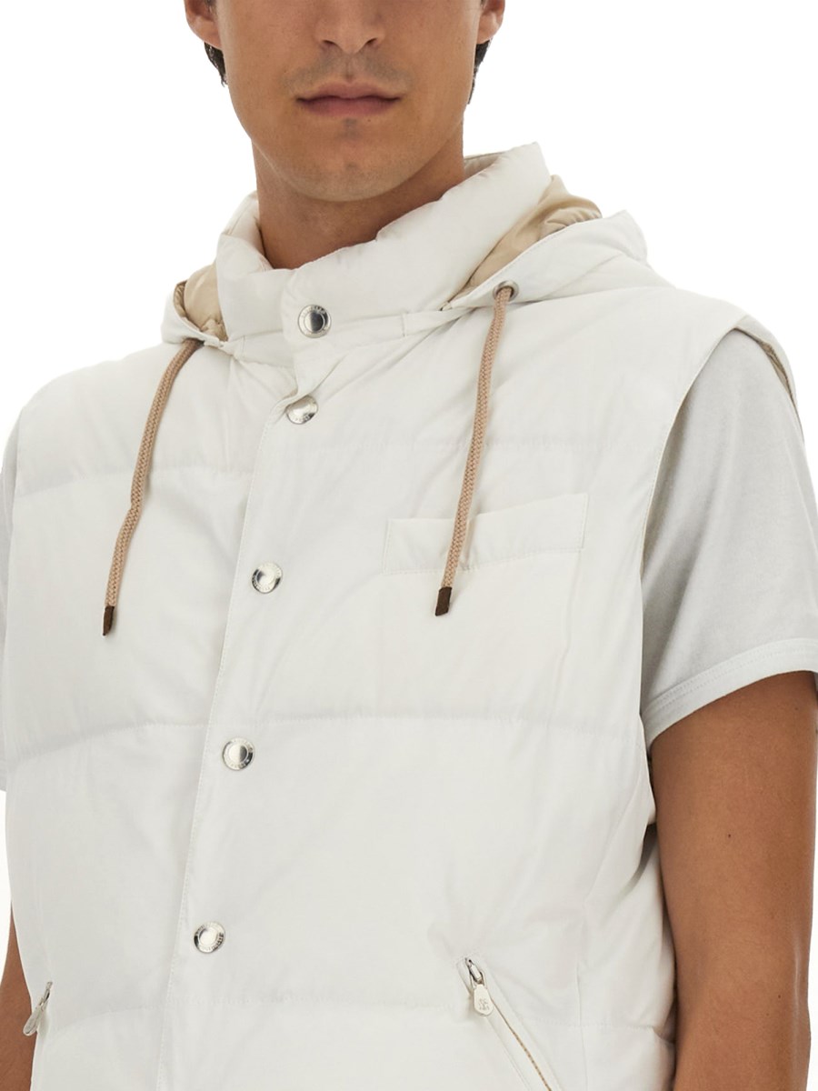 Stay cozy and stylish with this sleeveless white nylon quilted down jacket from Brunello Cucinelli. Perfect for layering, this jacket is made with high-quality materials to keep you warm and comfortable. Whether you're running errands or going out for a night on the town, this jacket is a must-have for any wardrobe.