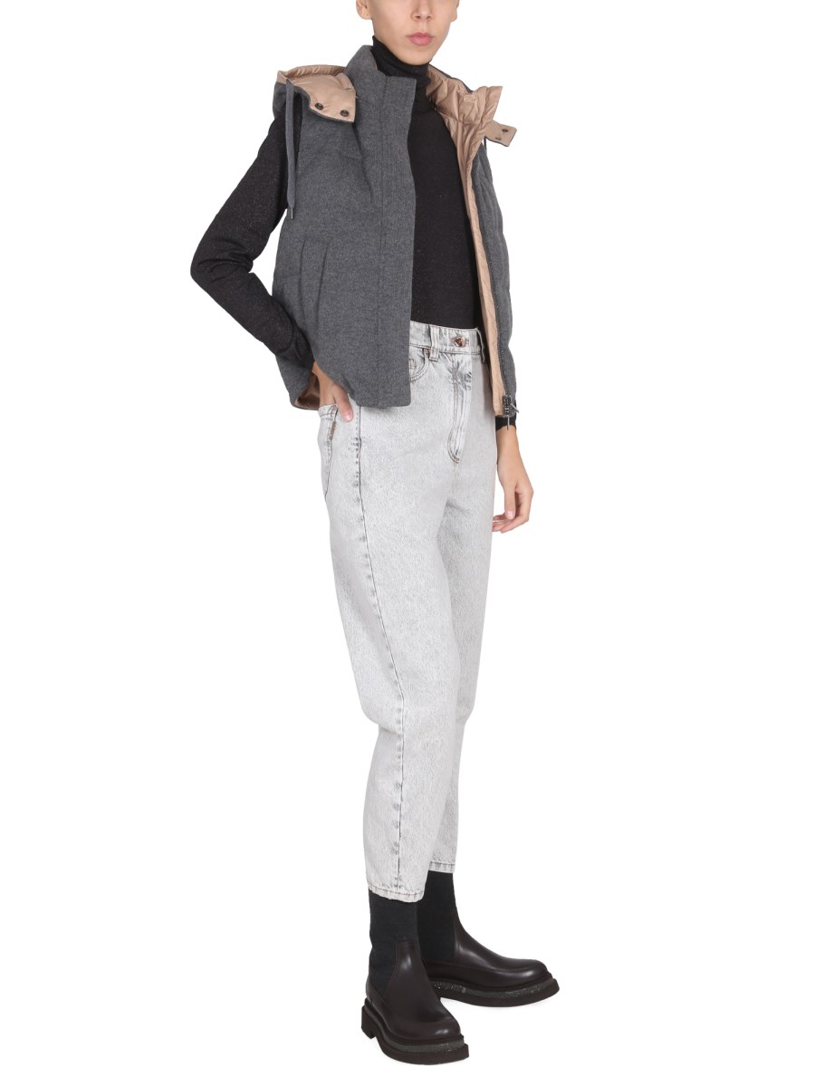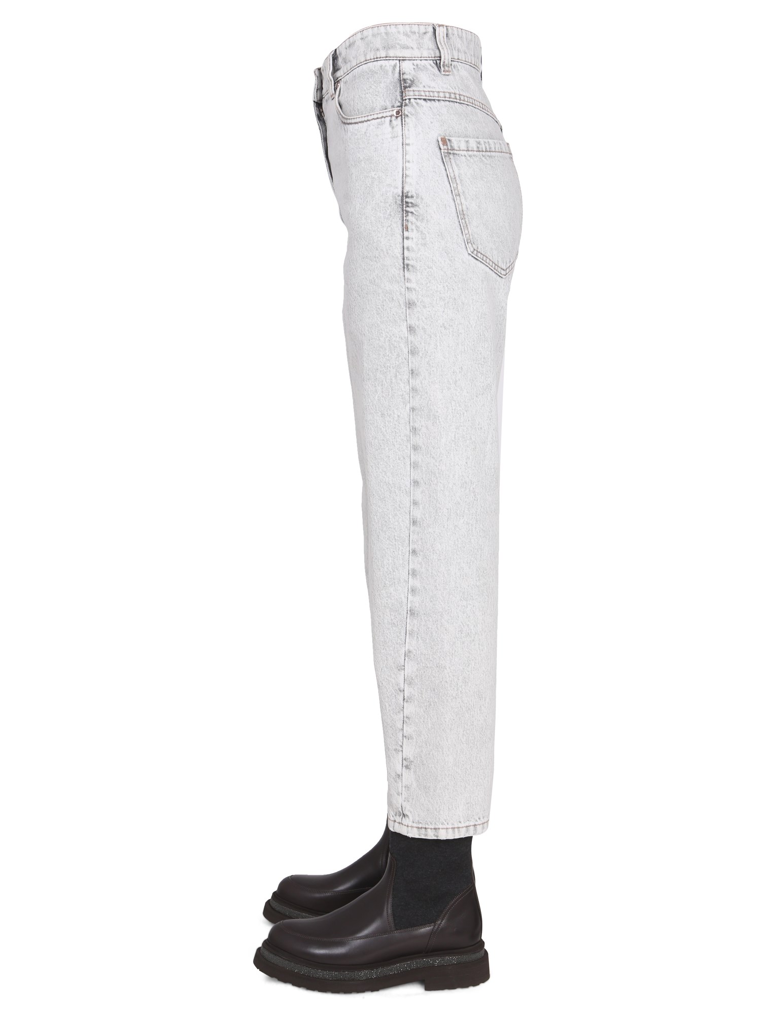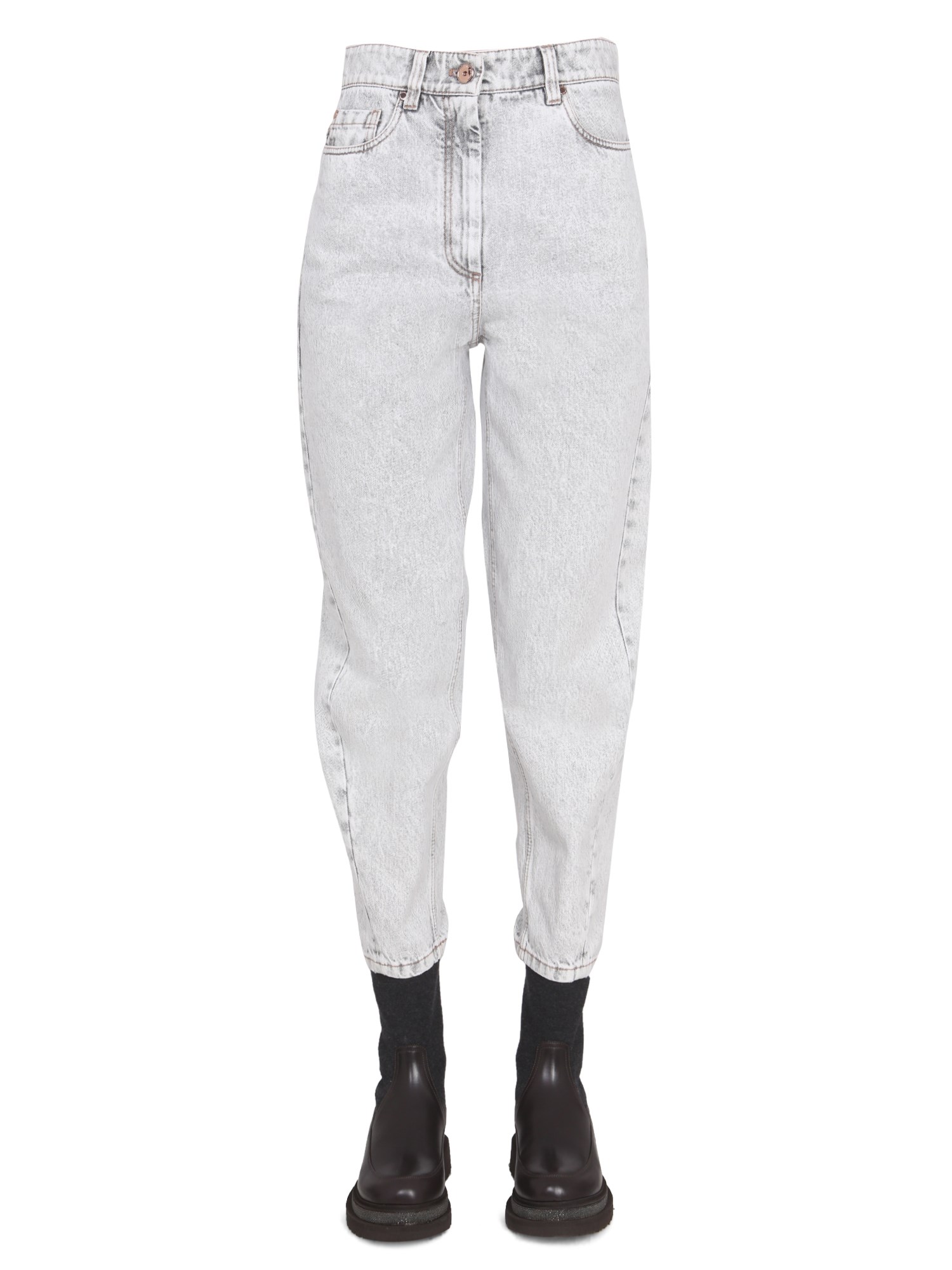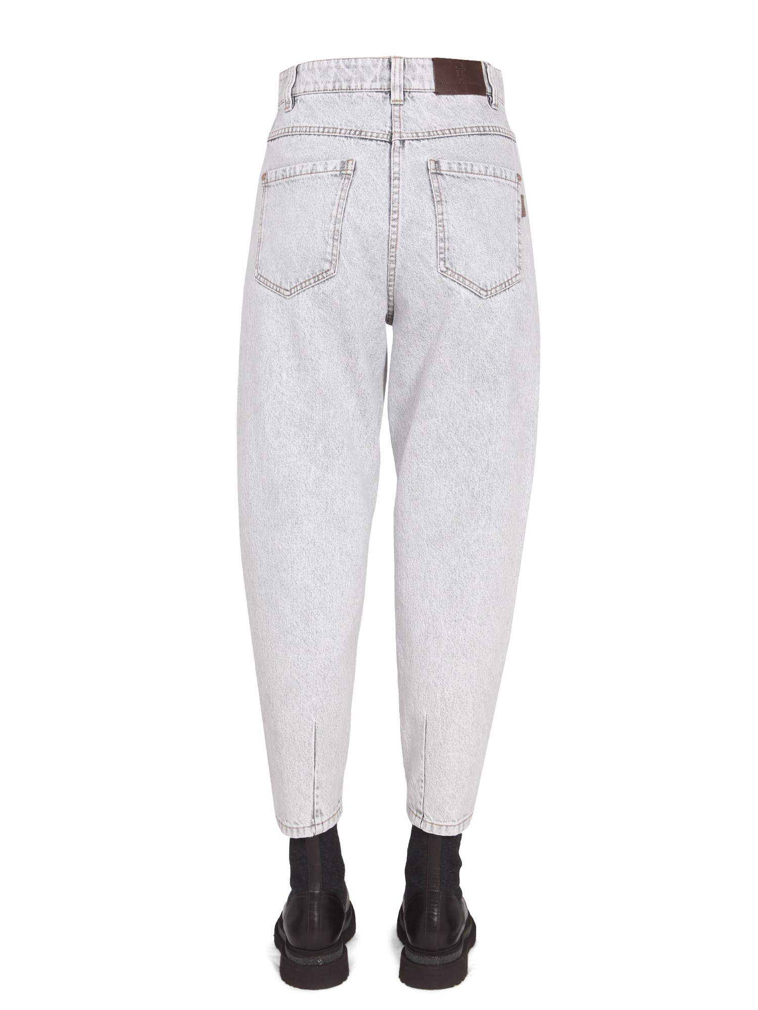 Cotton denim jeans from Brunello Cucinelli are a classic piece for any casual wardrobe. They feature a button and zipper closure and a traditional fit. They are made from cotton denim, which means they are comfortable, breathable, and easy to clean. The design of these jeans is meant to be a classic look that can be paired with a variety of tops and jackets.