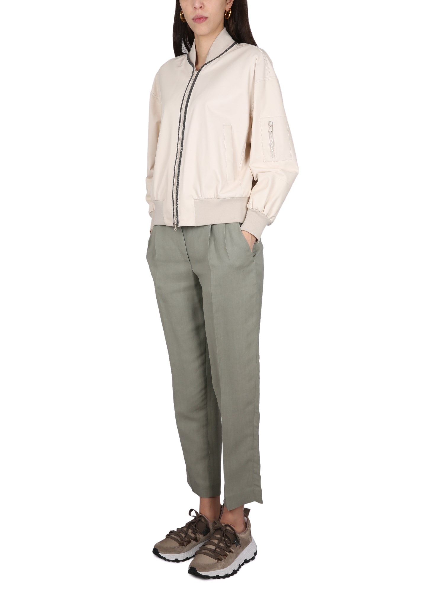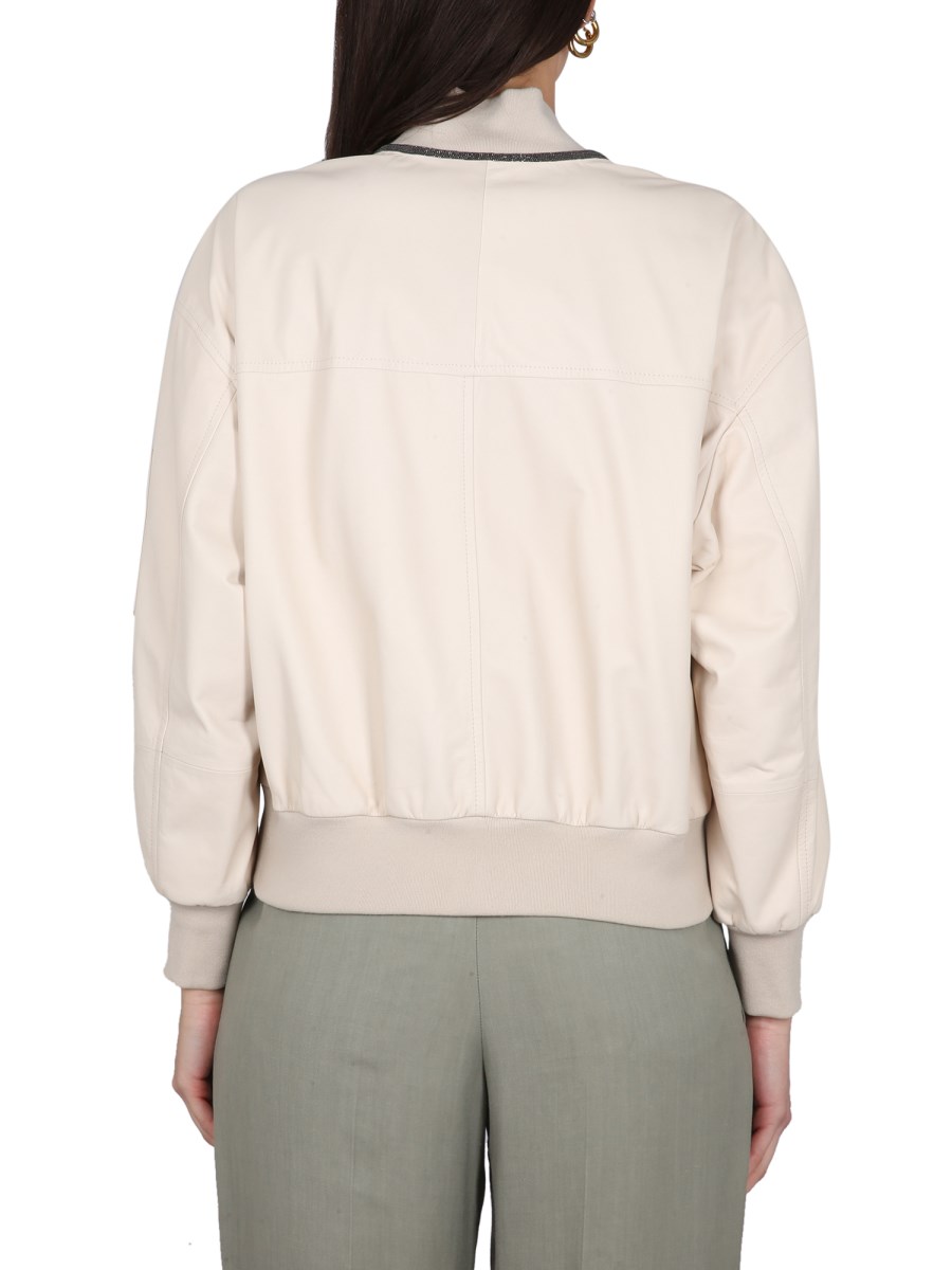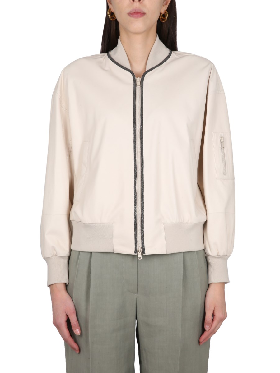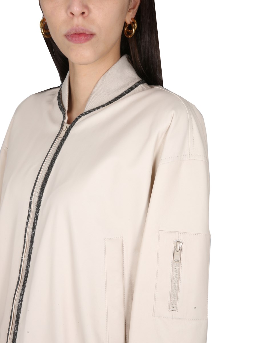 This bomber jacket from Brunello Cucinelli is perfect for any occasion. It has a zipper and double slider closure on the side pockets. The two zippered side pockets are great for storage and the monile details make this bomber jacket stylish. It is made of calf leather and is perfect for any cold weather activity.