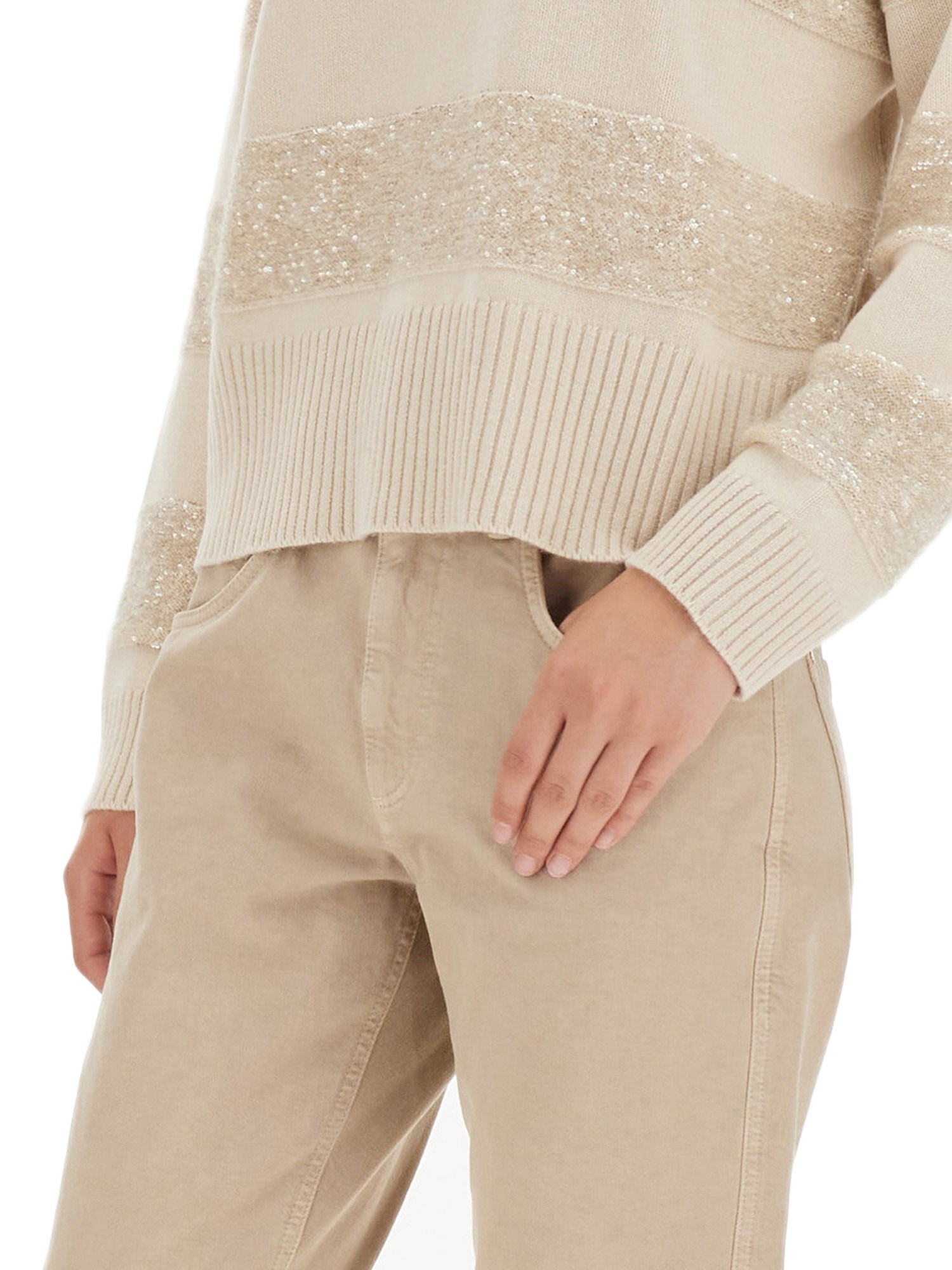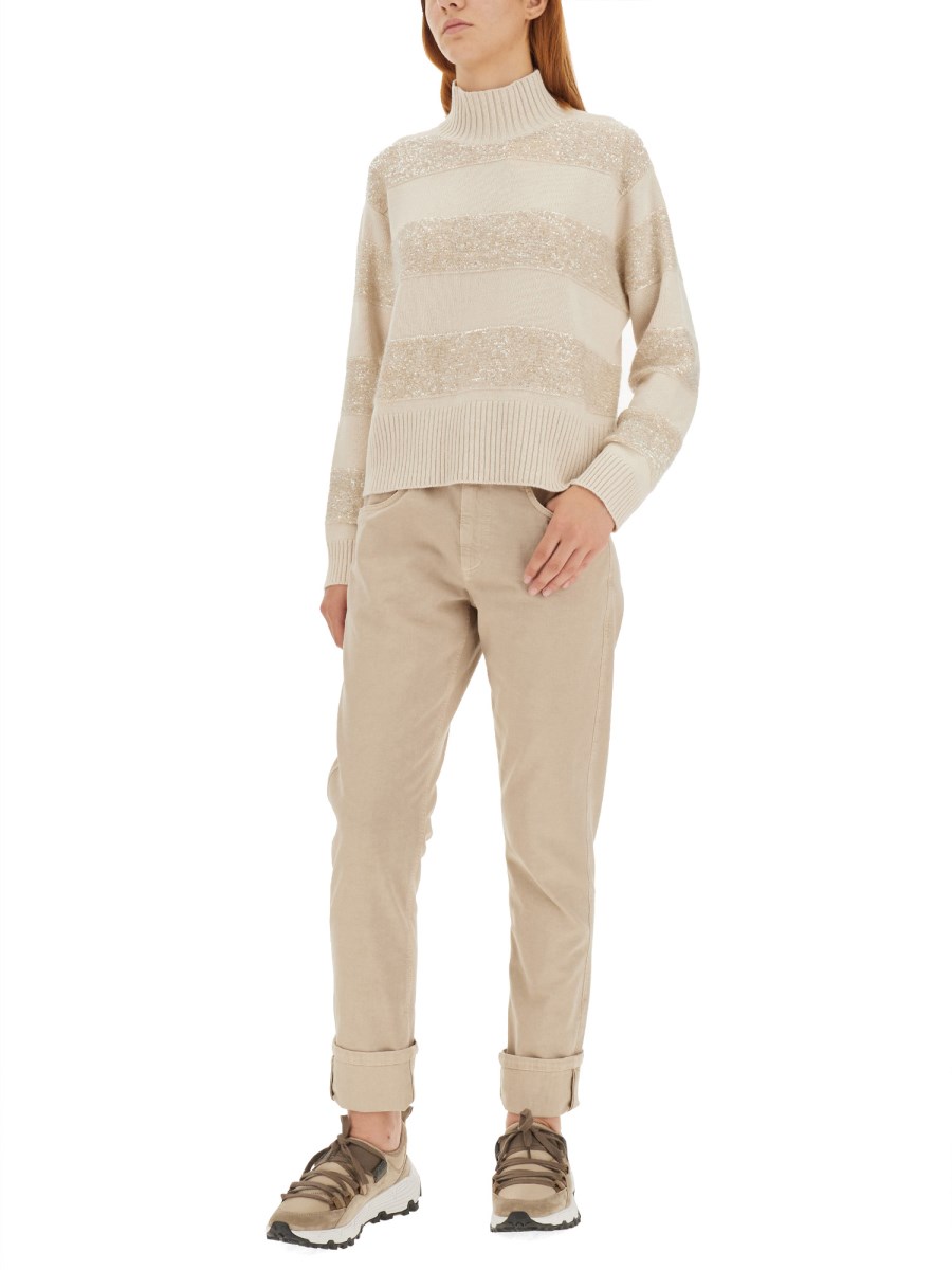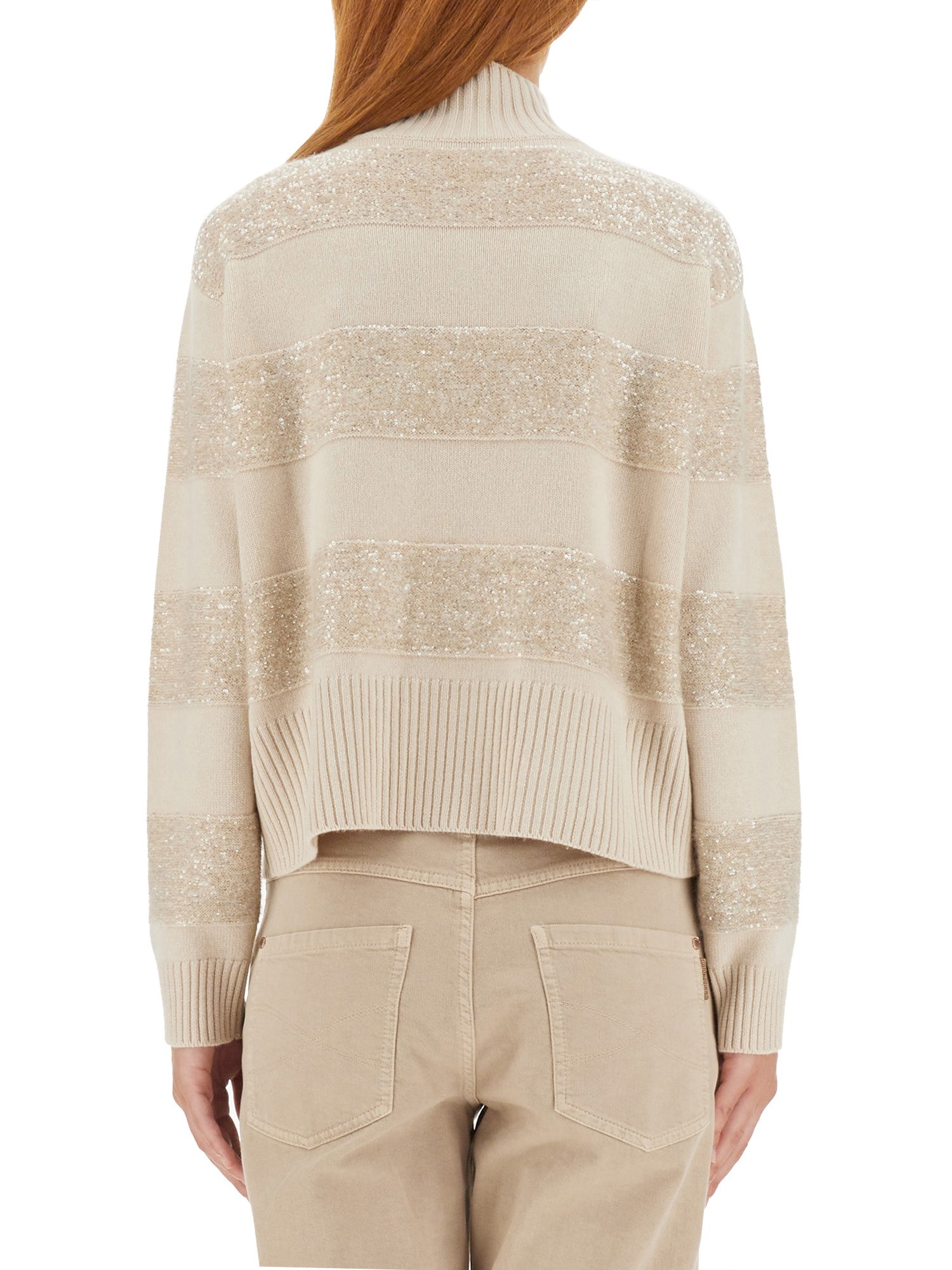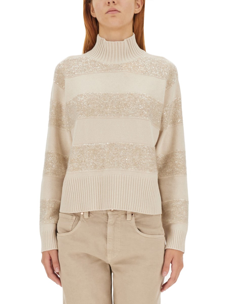 Stay cosy and stylish with this Wool Sweater with Stripe Pattern from Brunello Cucinelli. Crafted with the finest quality wool, this sweater offers a luxurious warmth that will keep you comfortable all day long. The timeless stripe pattern adds a touch of sophistication, making it perfect for any occasion.