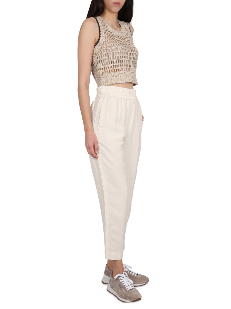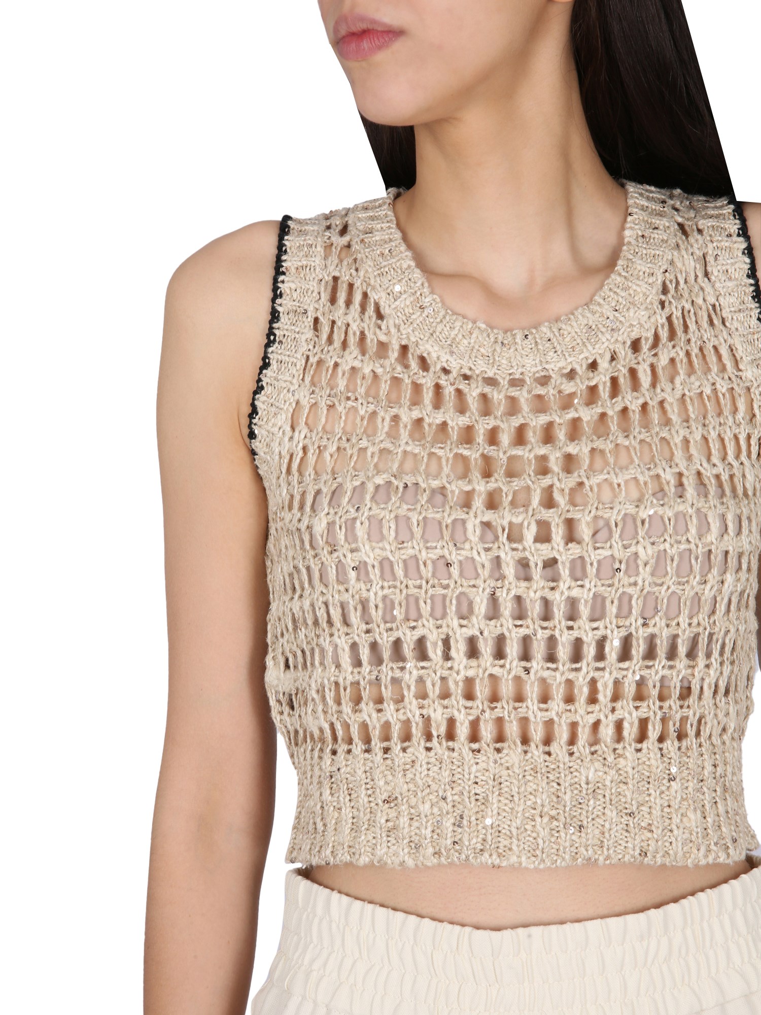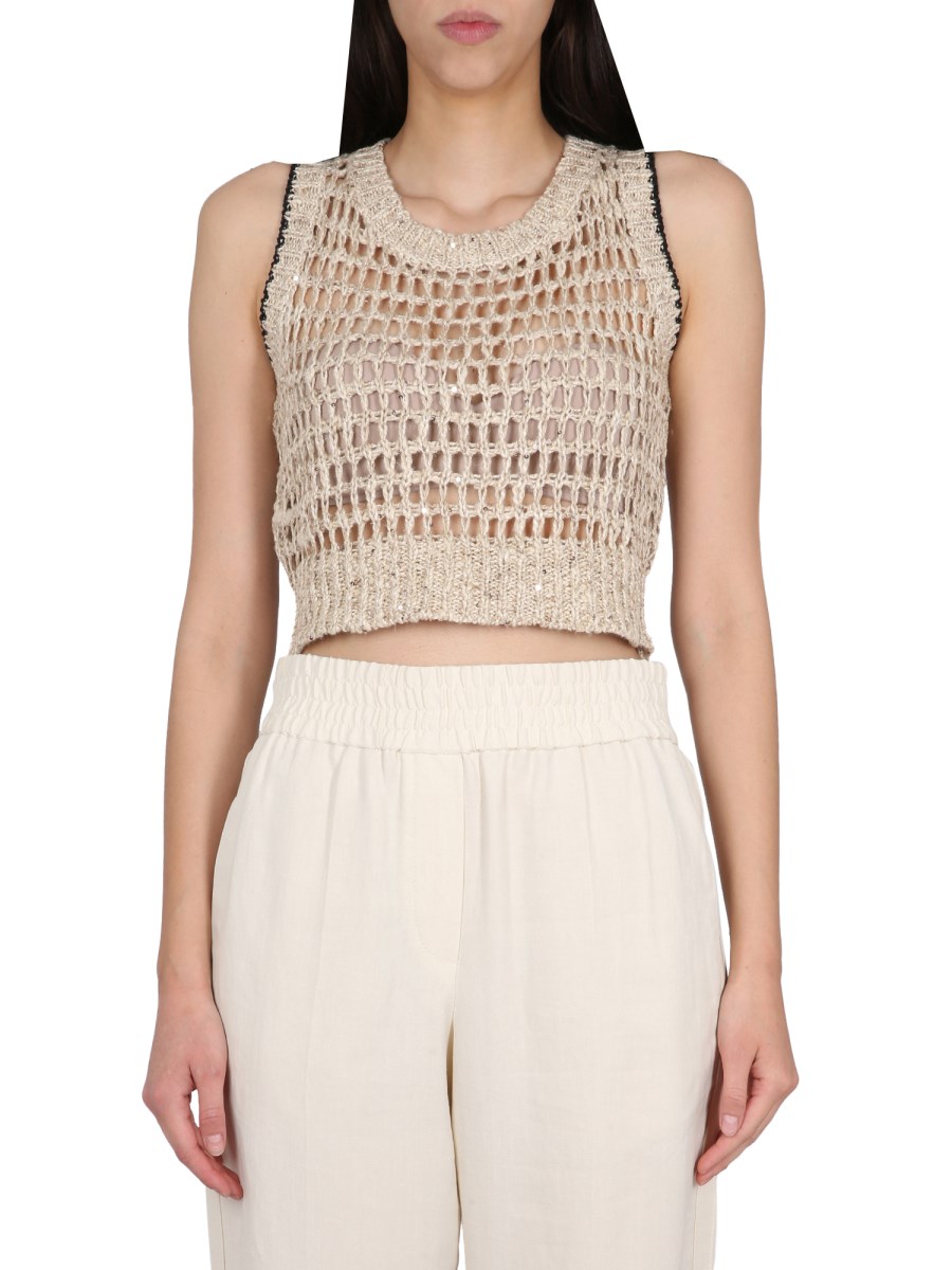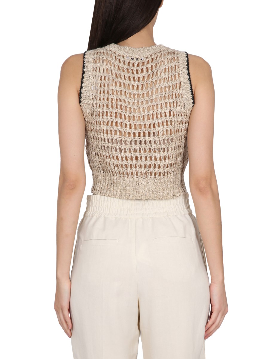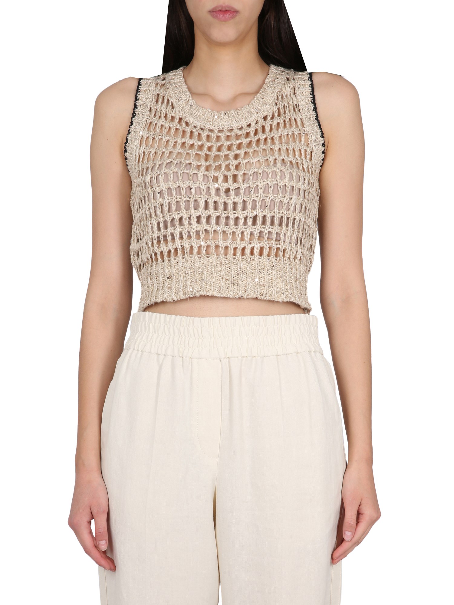 A sleeveless, ribbed halo linen silk top, this linen and silk shirt from Brunello Cucinelli is lightweight, soft, and comfortable. The deep scoop neckline and sleeveless design makes this top a great layering piece for both casual and formal wear. This sleeveless halo linen silk top is a classic piece that is both sophisticated and feminine.