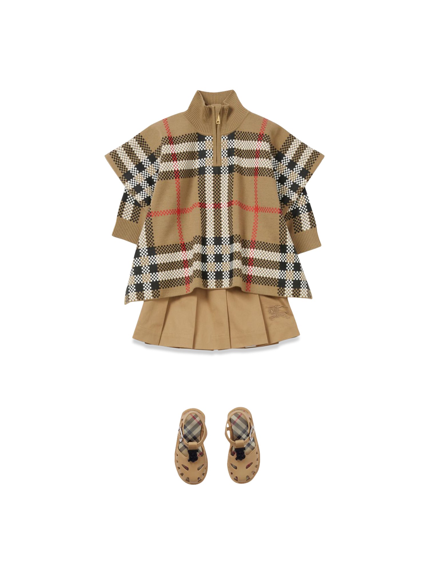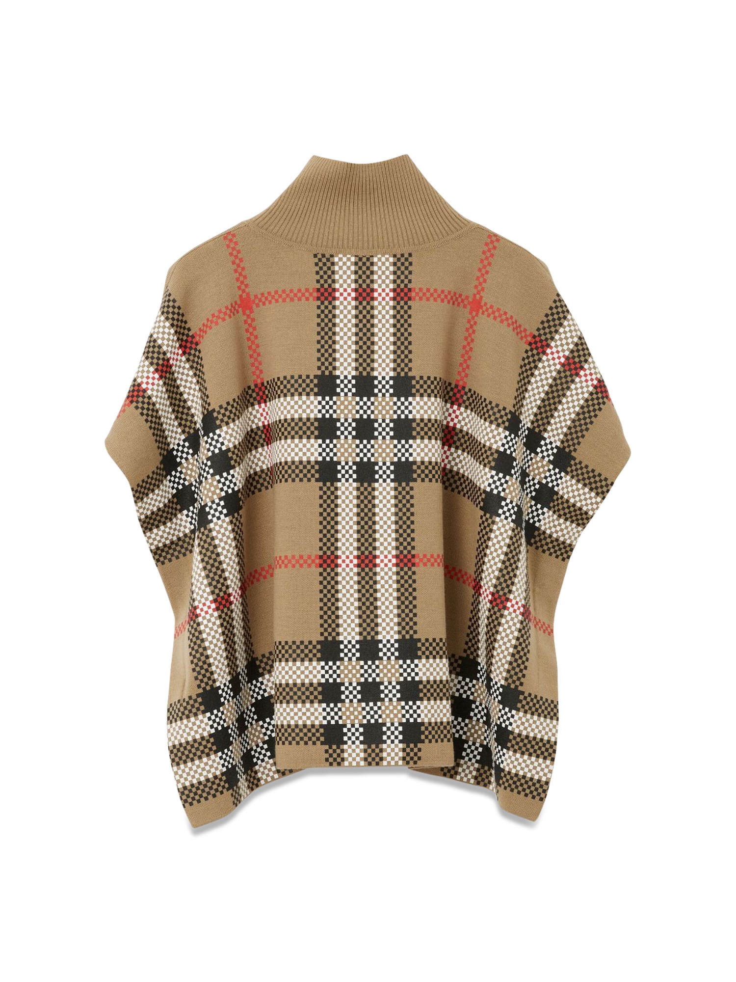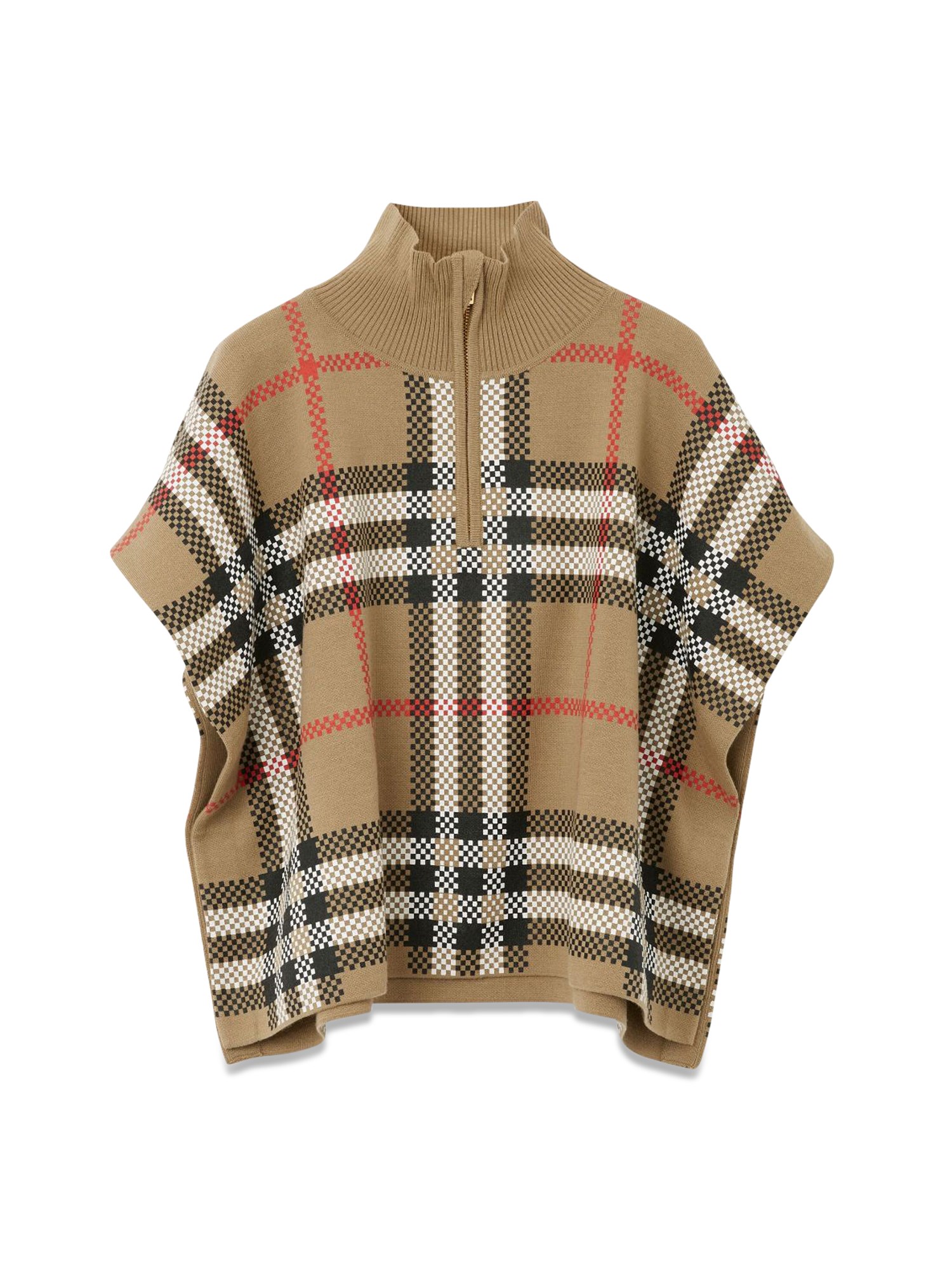 The cape from Burberry is made from Merino wool and it is very warm and comfortable. The design of the cape is unique with the signature checkered pattern. The fabric is not only beautiful but also easy to care for and to be worn in the rain. It has a mock neckline with a zippered front closure.