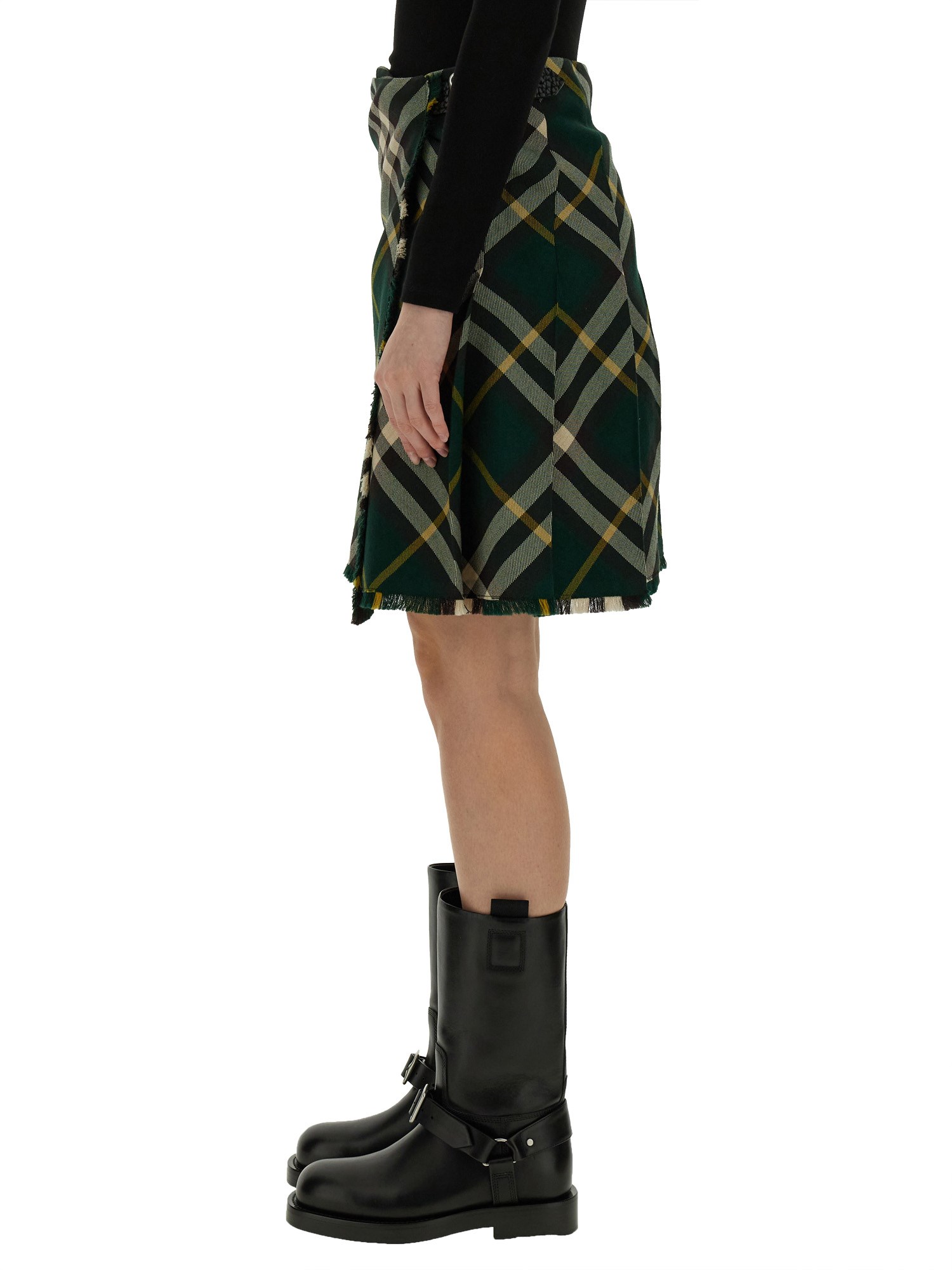 This skirt from Burberry is a timeless addition to your wardrobe. Made from premium quality wool fabric, this skirt offers unrivaled comfort and durability. The soft, luxurious feel ensures a blissful wearing experience, while the high-quality construction guarantees longevity. The classic design of this skirt features pleats on the back, adding a touch of elegance and femininity to your outfit. The pleats create a graceful flow and movement, making you look effortlessly stylish.