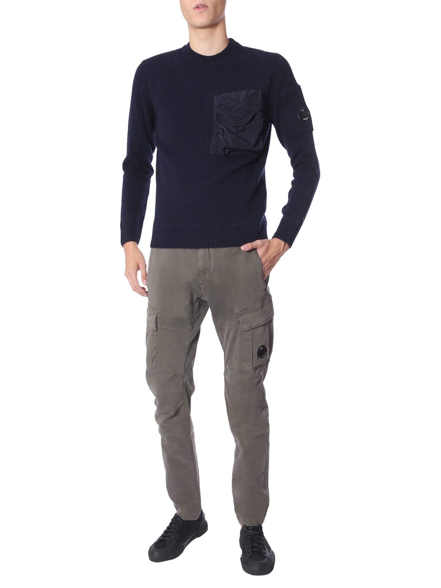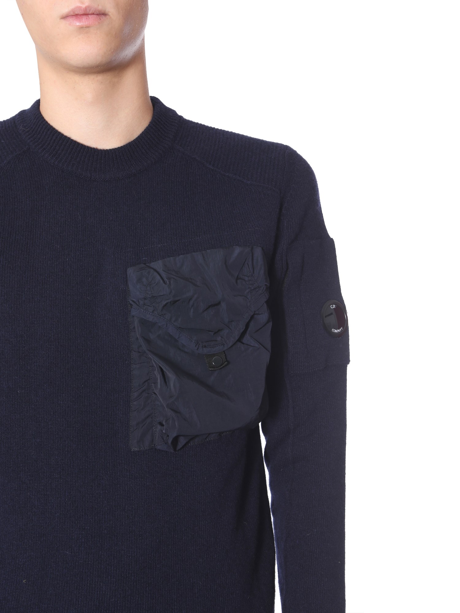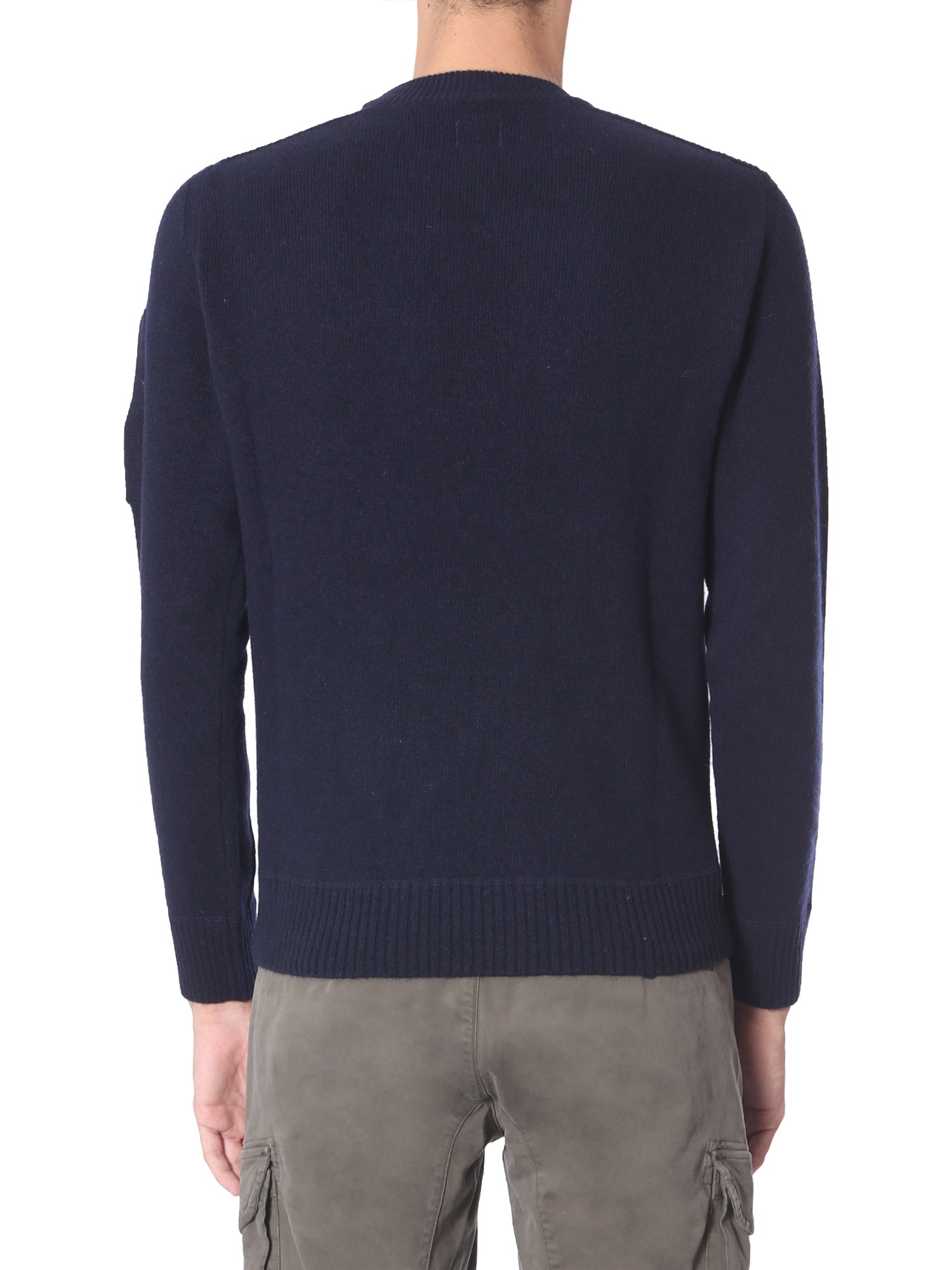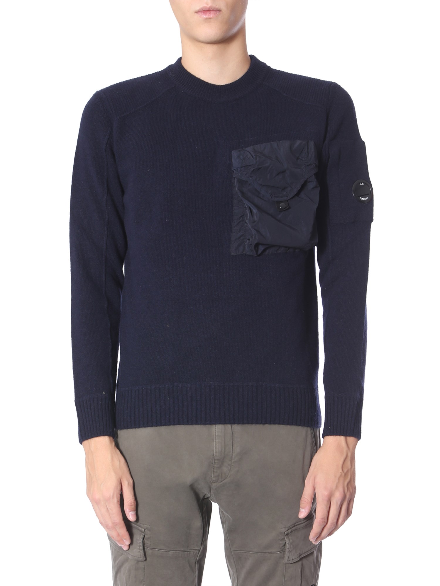Head out in style with the round neck sweater by C.P. Company. This winter apparel is made of 80% wool for warmth and 20% polyamide for soft texture. It has a flap and button pocket at chest to keep small items safe. The left sleeve has an iconic lens that gives the sweater a stylish edge.