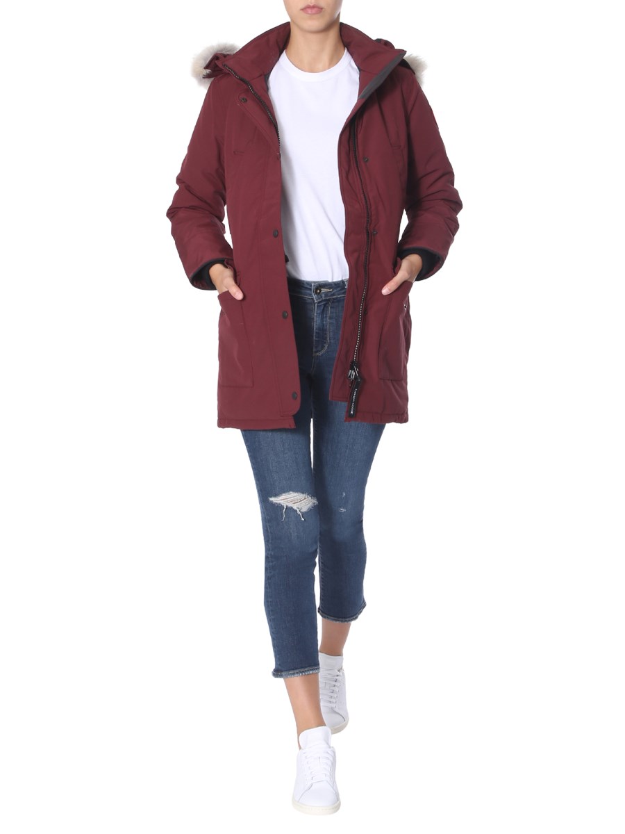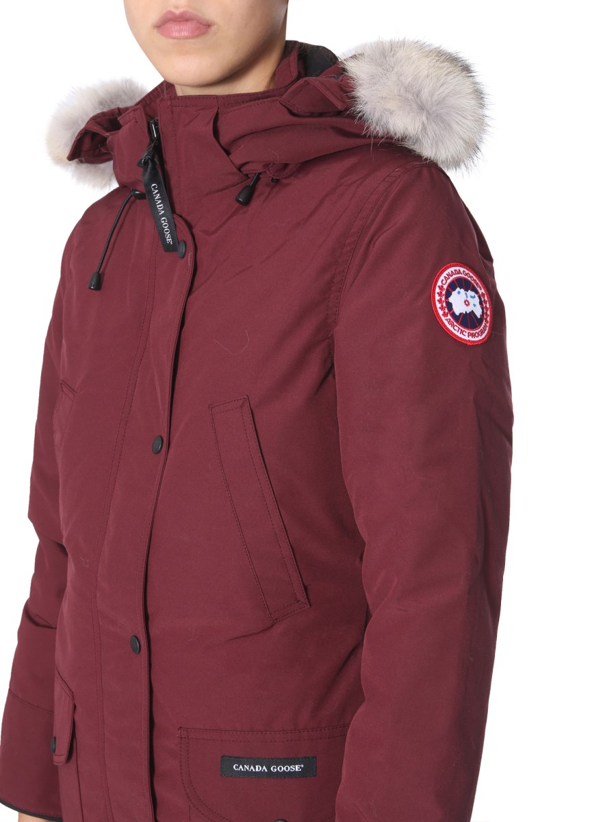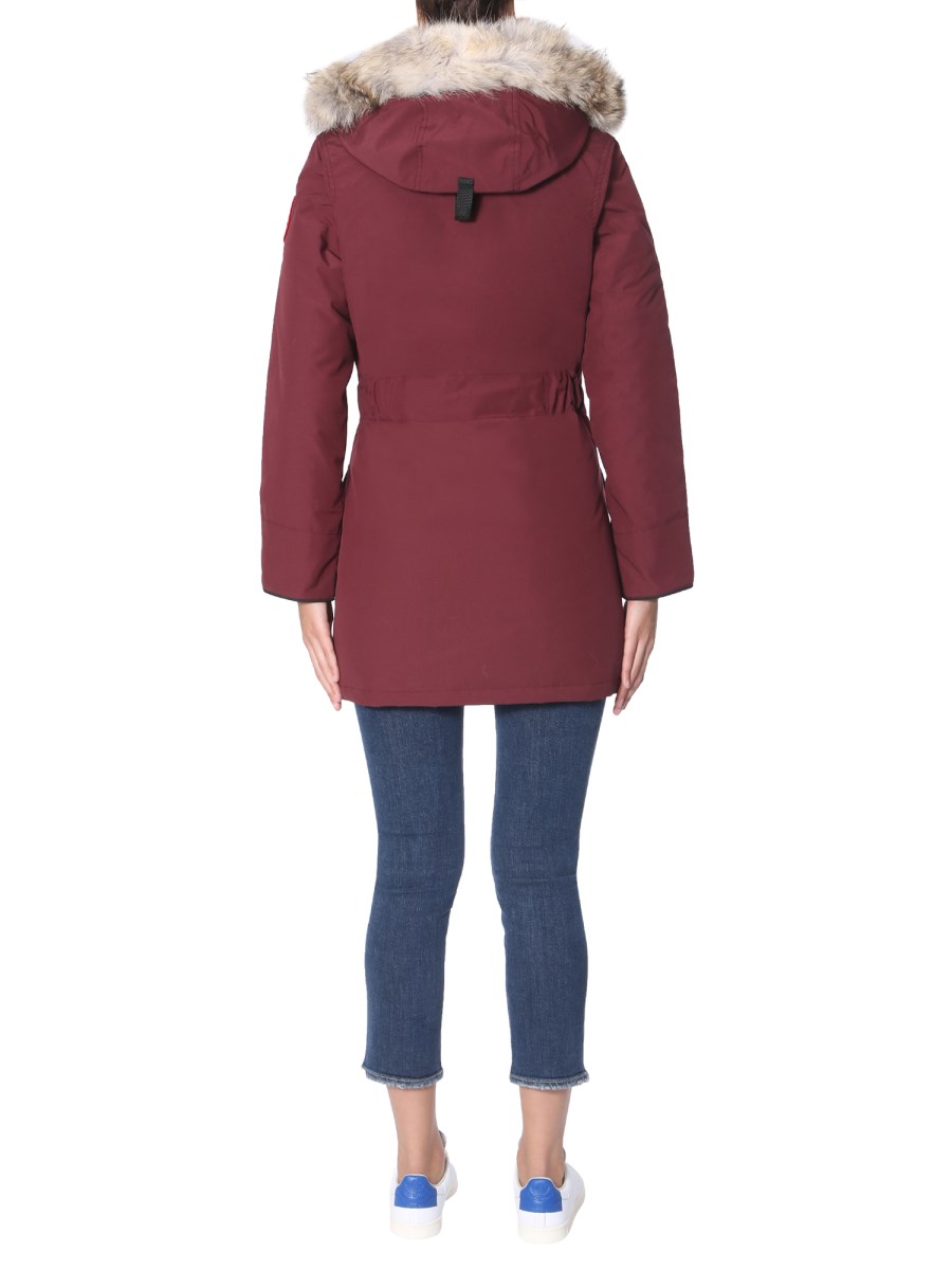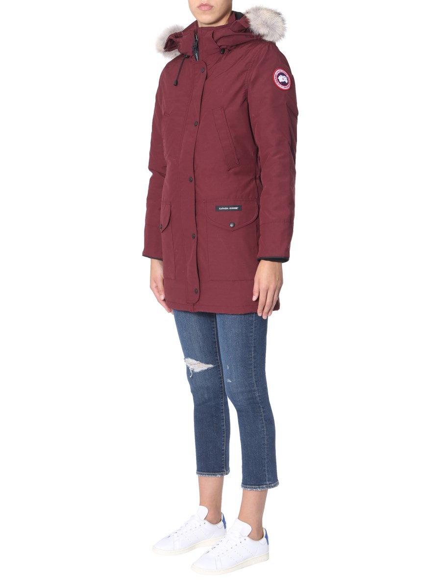Stay covered and stylish in winter with the Trillium parka by Canada Goose. It has a fur edged hood to keep your head and neck safe from the cold wind. The parka is made with 85% polyester and 15% cotton with down padding for warmth and comfort. The slim fit style is designed to highlight your curves beautifully.