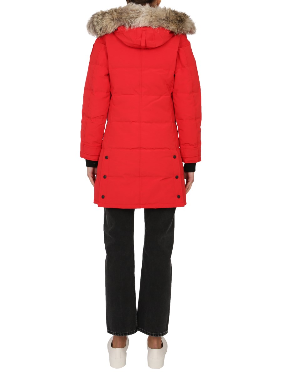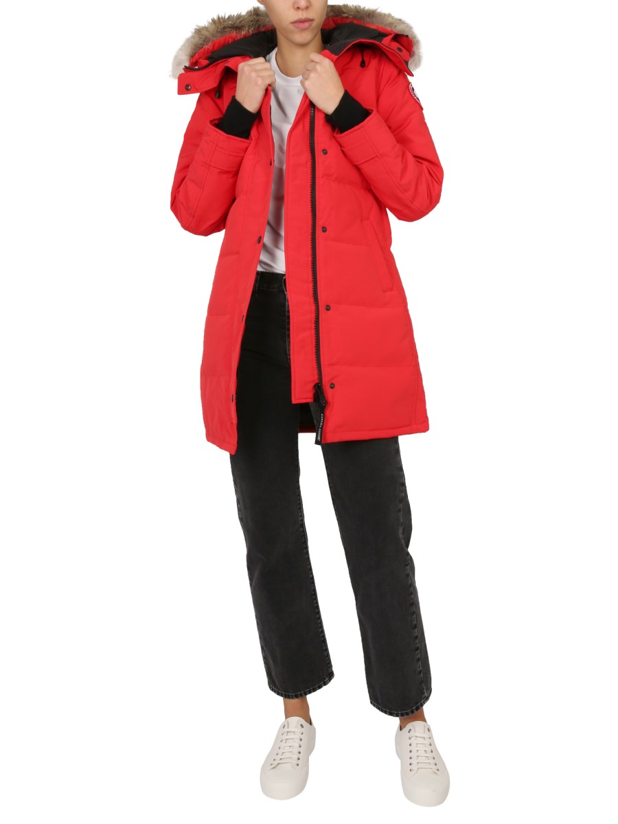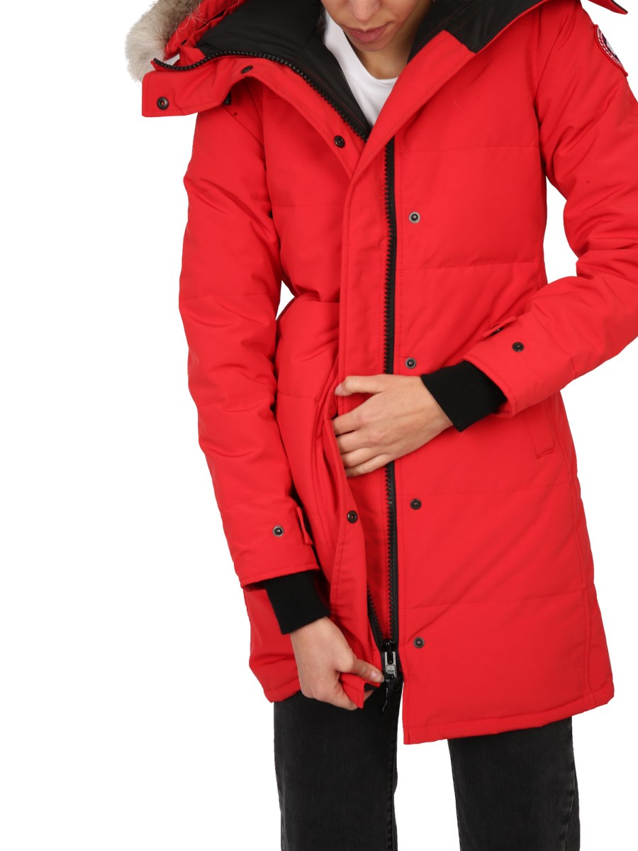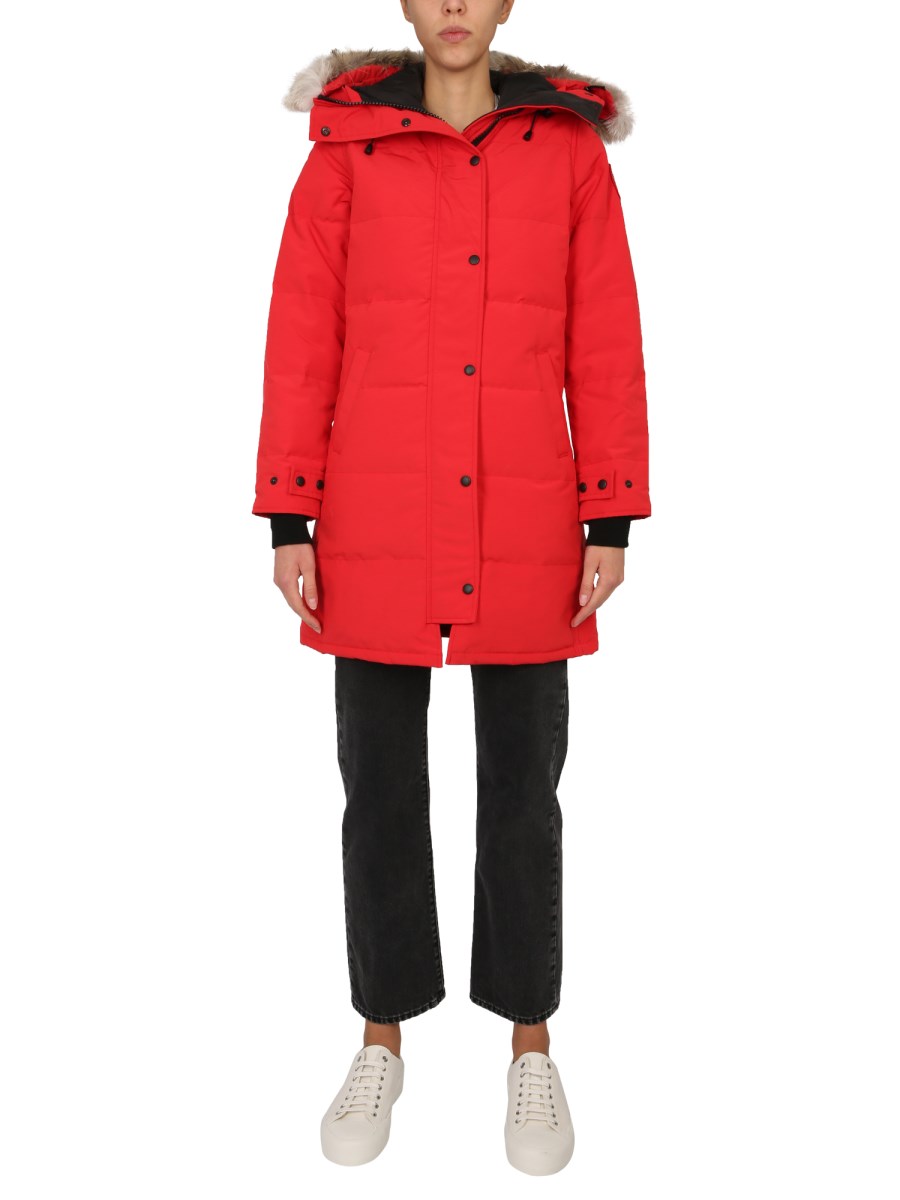 Canada Goose's top-of-the-line "Shelburne" Parka is lightweight and easy to wear. It features a high neck with coulisse, hood with removable fur profile, long sleeves with elastic bottom, logo patch on the sleeve, lined braces, straps with snap buttons at the wrist, front zip and snap buttons closure, lined inner, two inner pockets, slits on the back with snap buttons, and two front pockets with snap buttons.