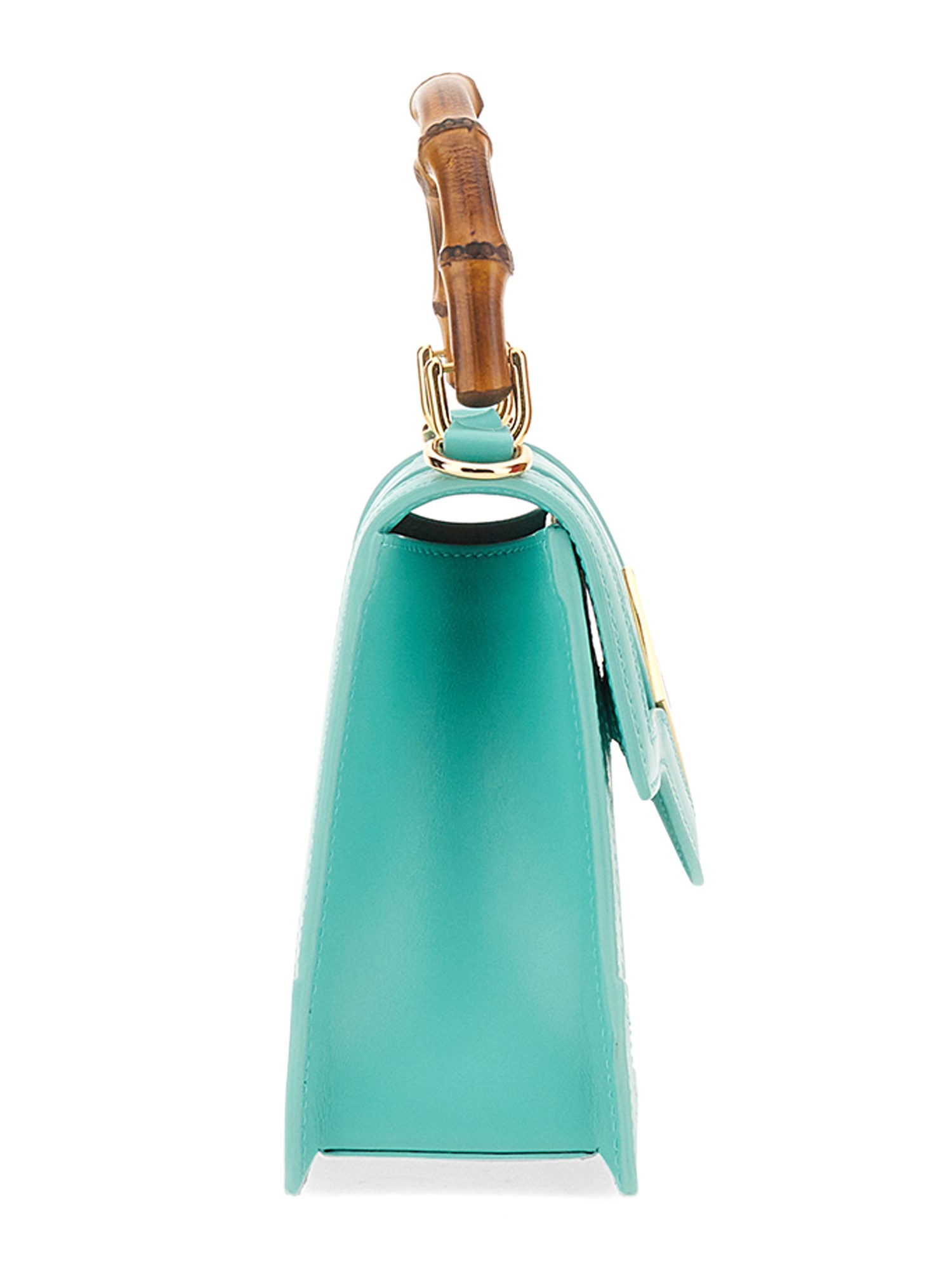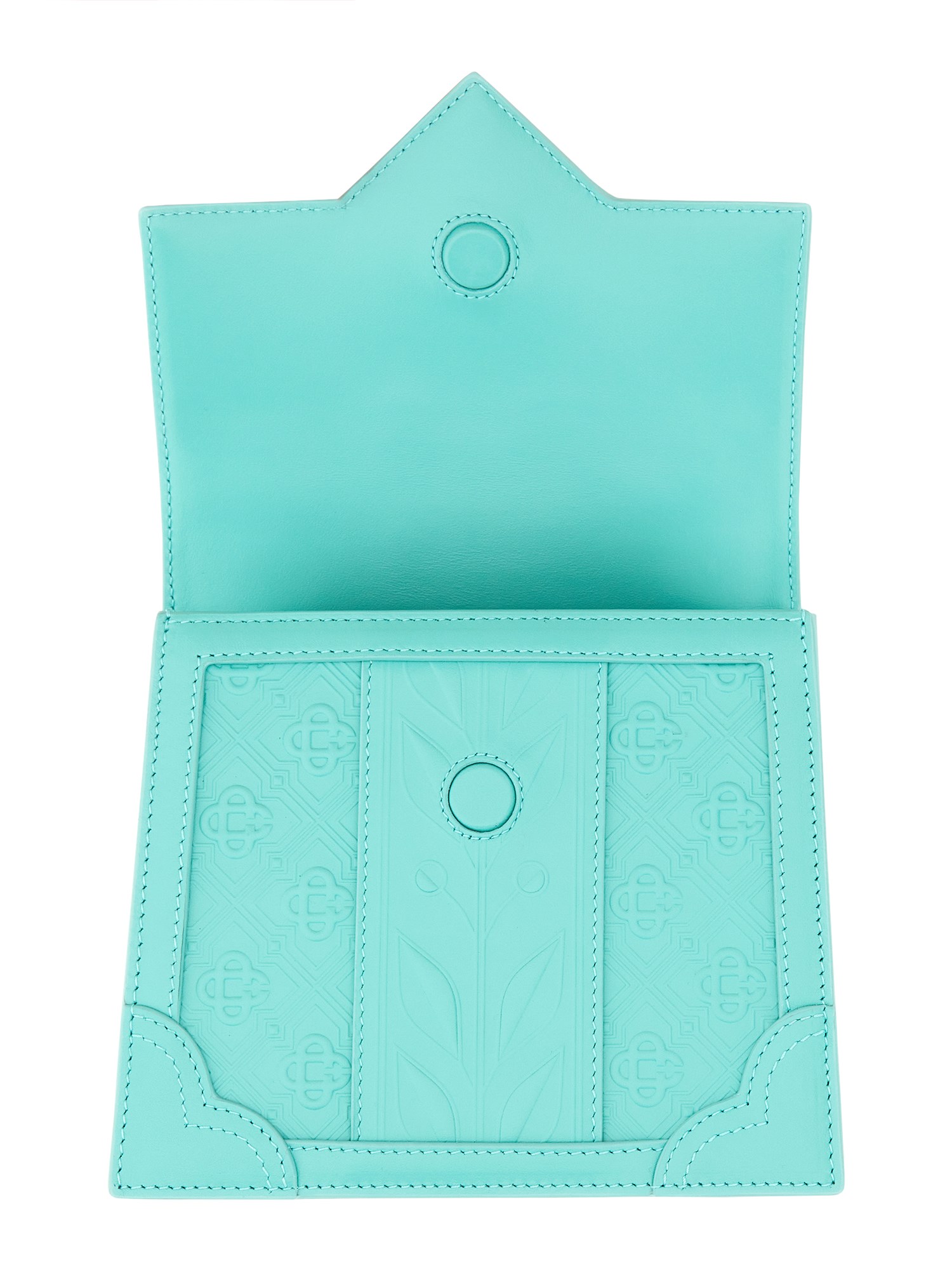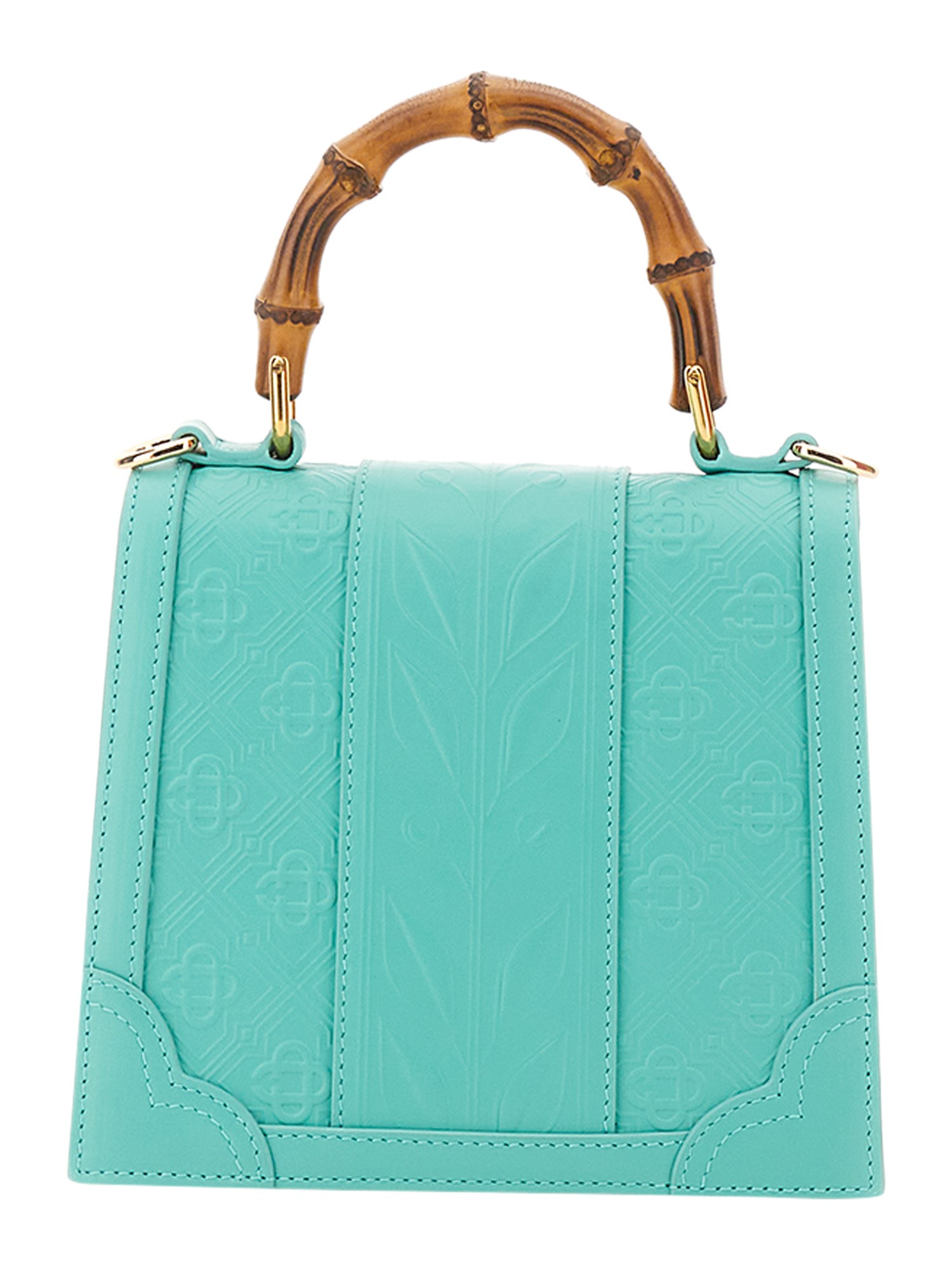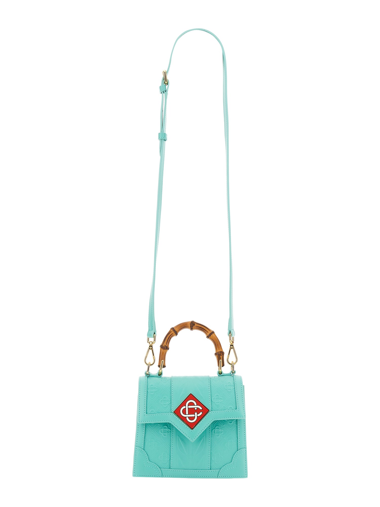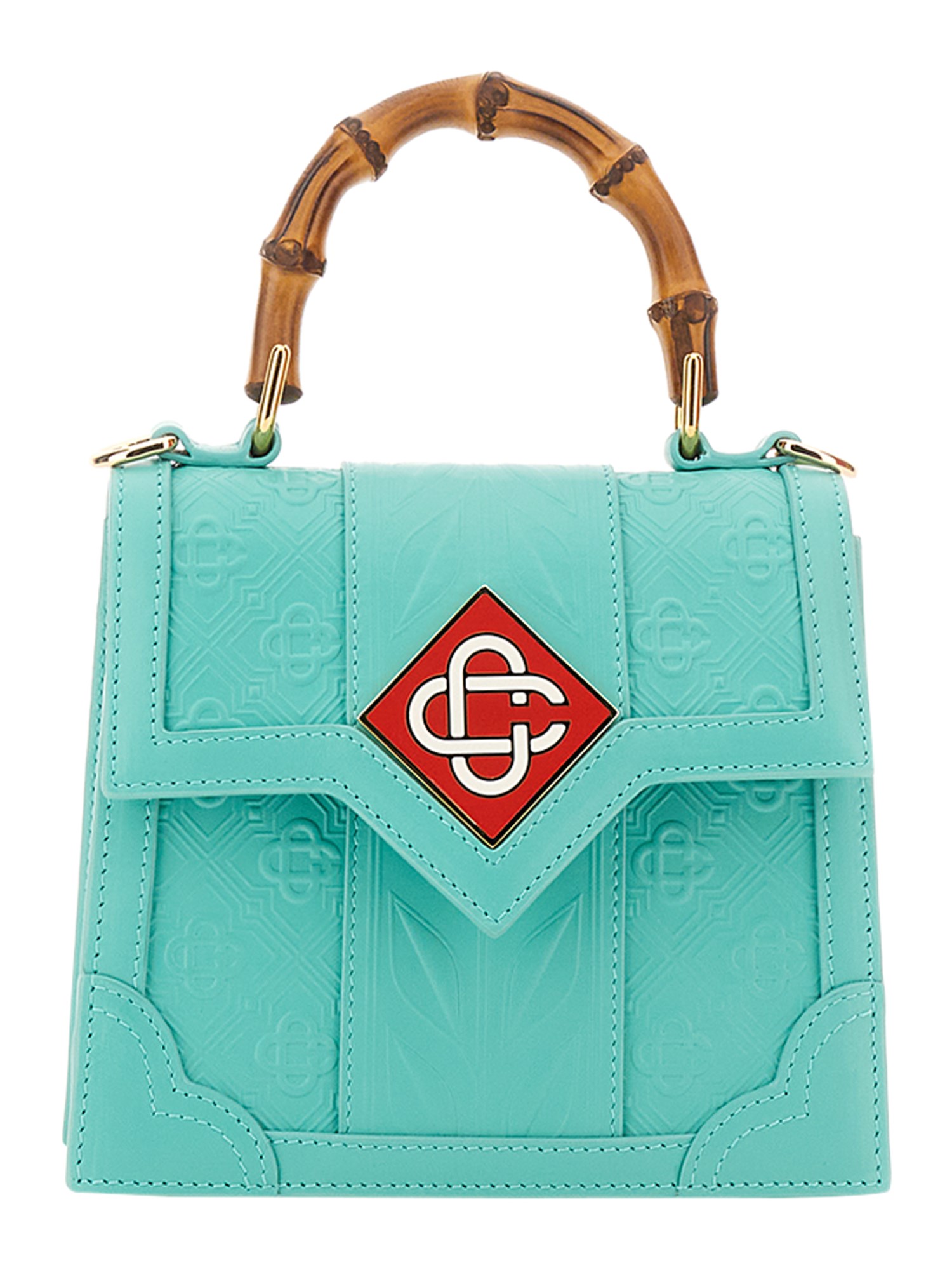 The turquoise mini Jeanne bag is the house's signature bamboo top-handle style with a flap opening reinterpreted for this season. Crafted from 100% Italian calf leather, the pink handbag is complete with a Casablanca diamond monogram in contrast red and a coordinating crossbody strap.