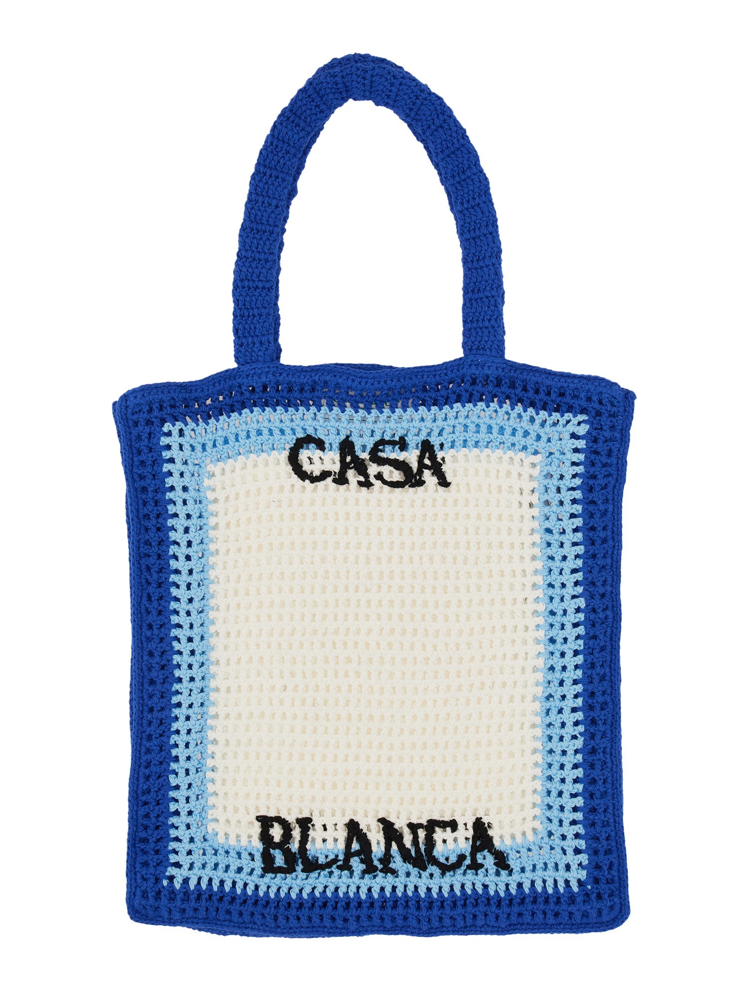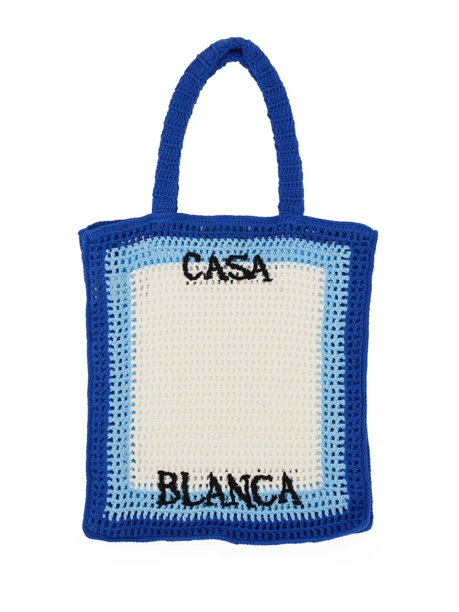 The Atlantis Crochet bag is a blue and white style designed to complete a summer ensemble. Made of 100% cotton, the bag has a slouchy silhouette with an embroidered black logo and straps that allow the tote style to be worn over the shoulder or in the hand.