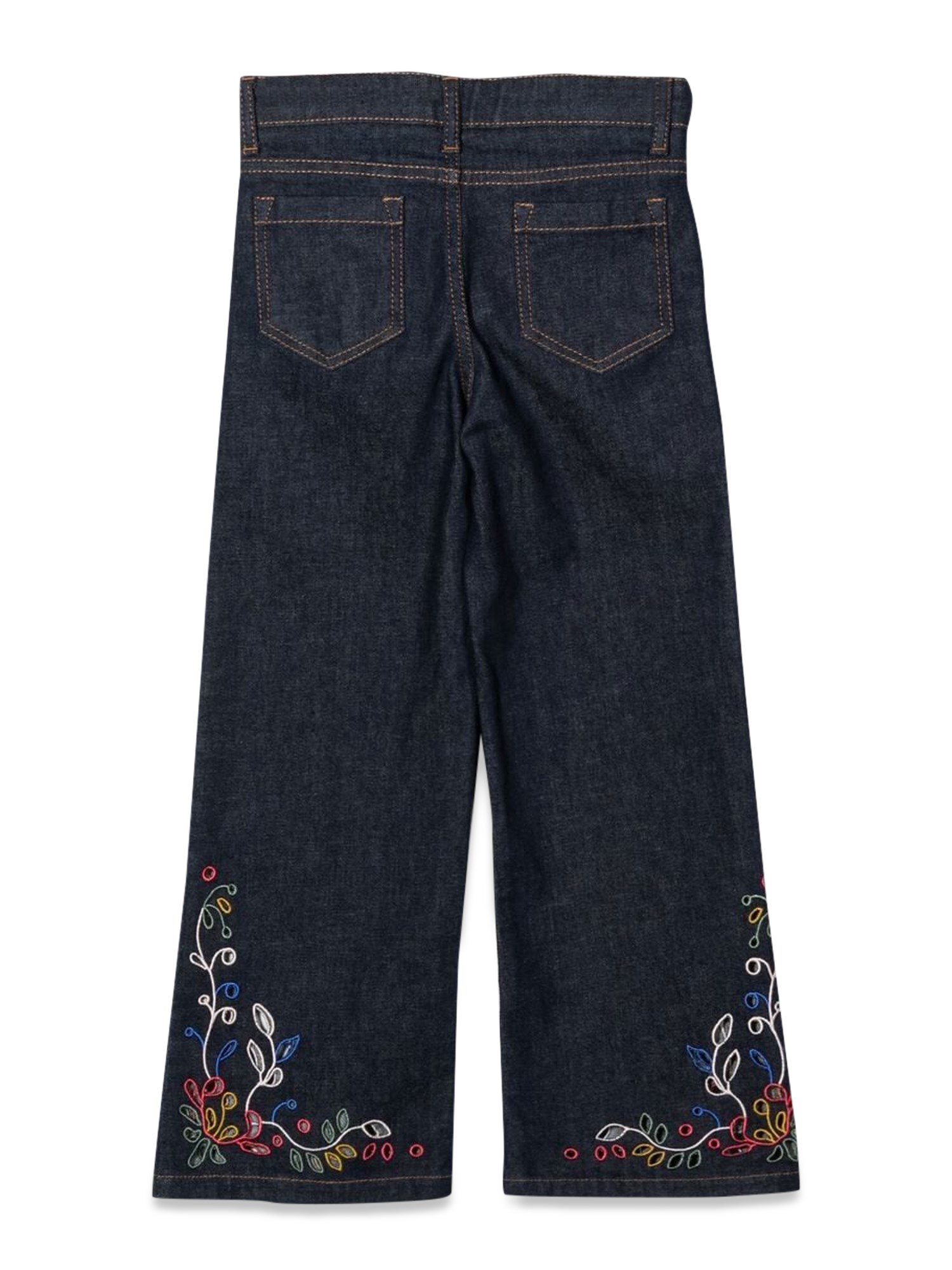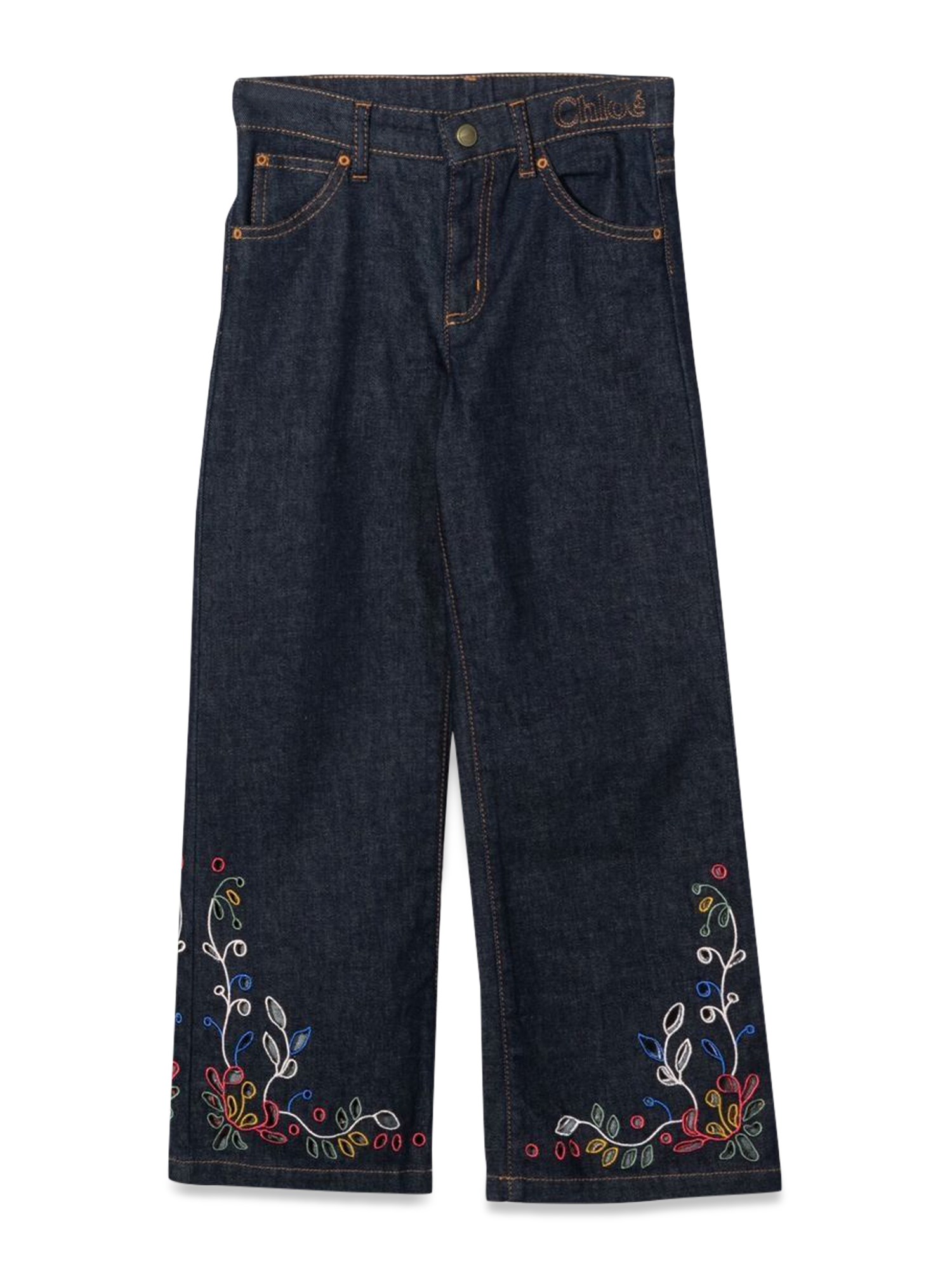 These pair of jeans from Chloe are made from a blend of cotton and polyester, with a zipper and two front pockets. The jeans feature a front-button closure, with an embroidered bottom. The jeans are made of a cotton blend, so they're comfortable and easy to move in. The bottom of the jeans has a wide fit.