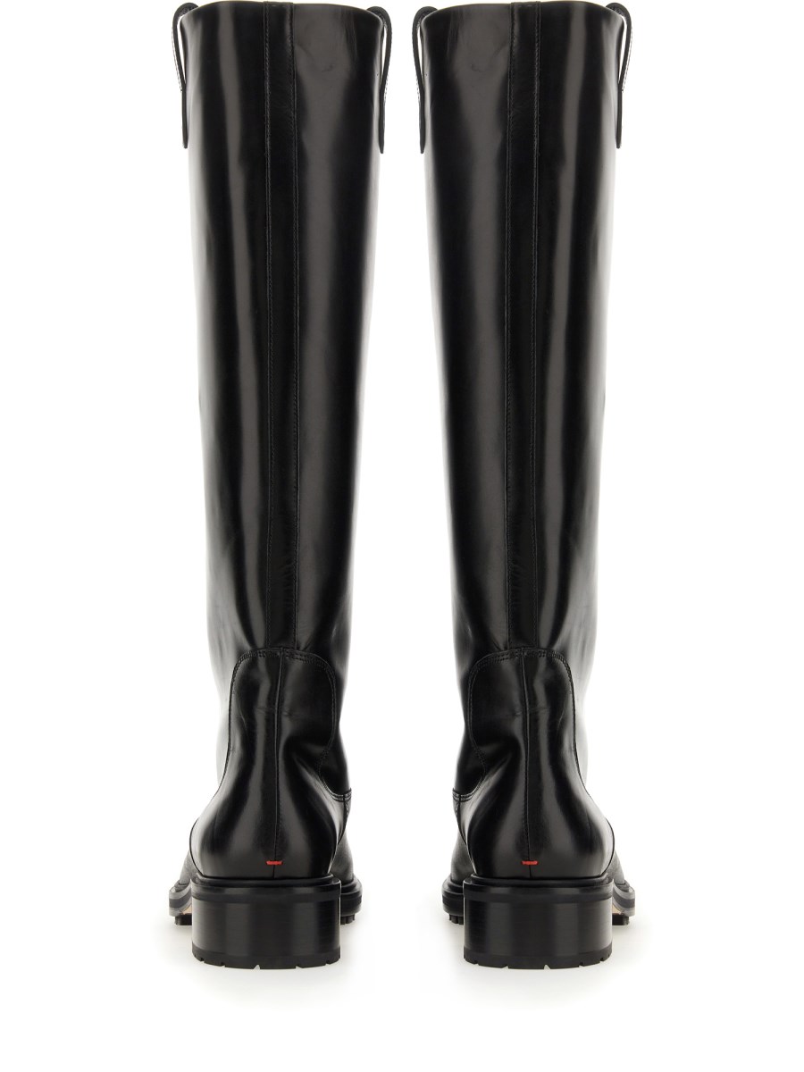 Henry is a modern twist on the classic knee-high riding boot, crafted from premium calf leather. Its chunky heel and rubber sole offer comfort in cold weather. Versatile, it complements long skirts, fitted jeans, or trousers. With an inside material of 100% Cross Breed Lamb Leather, it features a 4.5 CM heel, a calf circumference of 38 CM, and a shaft height of 39 CM. Made in Italy.
