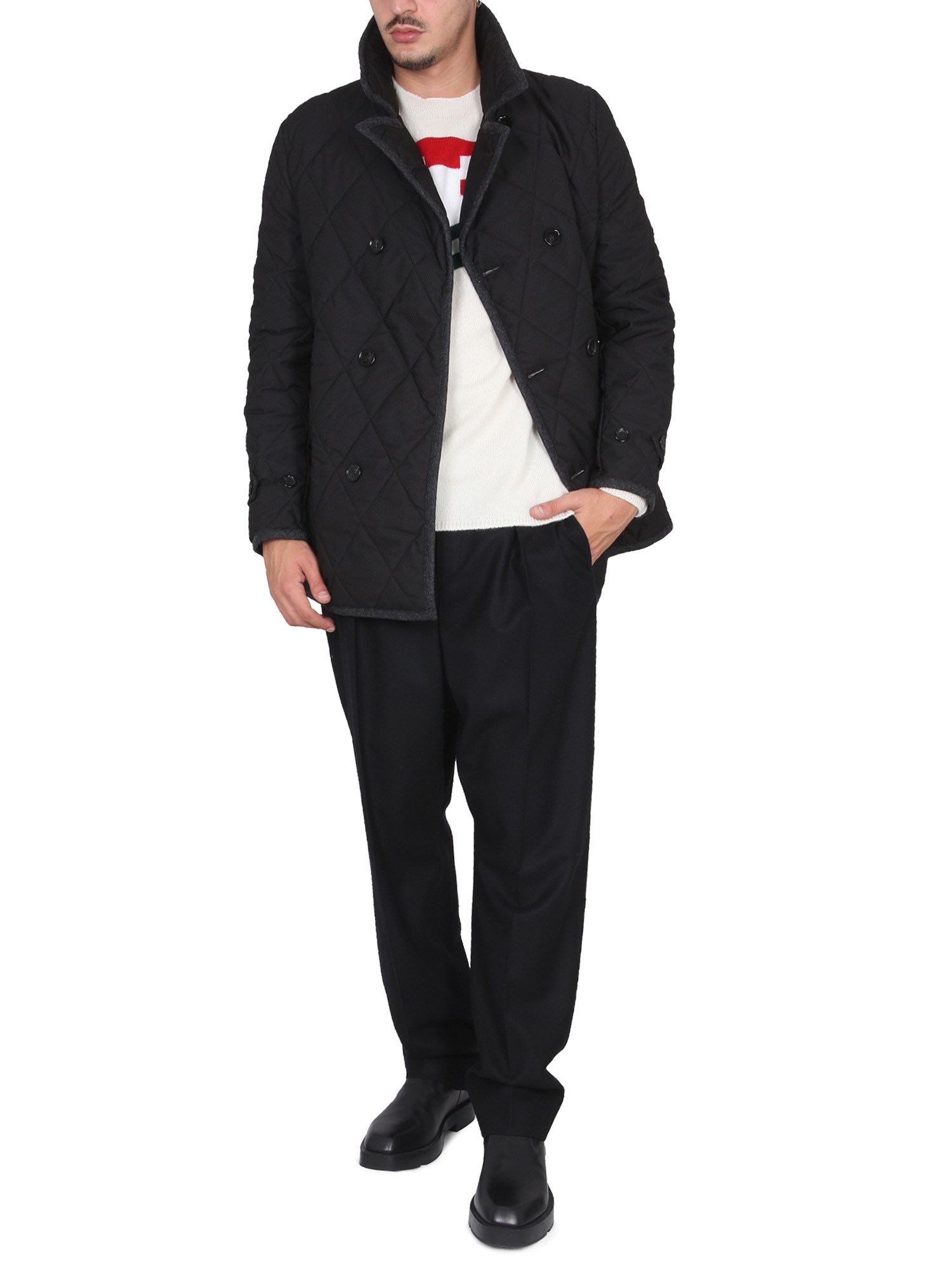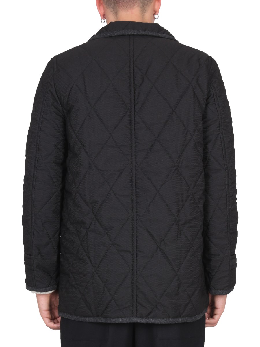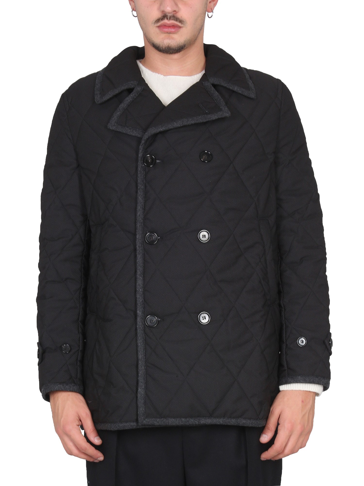 This striking black coat from Comme Des Garcons Shirt is the perfect addition to your winter wardrobe. It features notched lapels and a button closure, double-breasted style, and is a thick, rich fabric that will keep you warm. This double-breasted coat is perfect for both business and casual occasions.