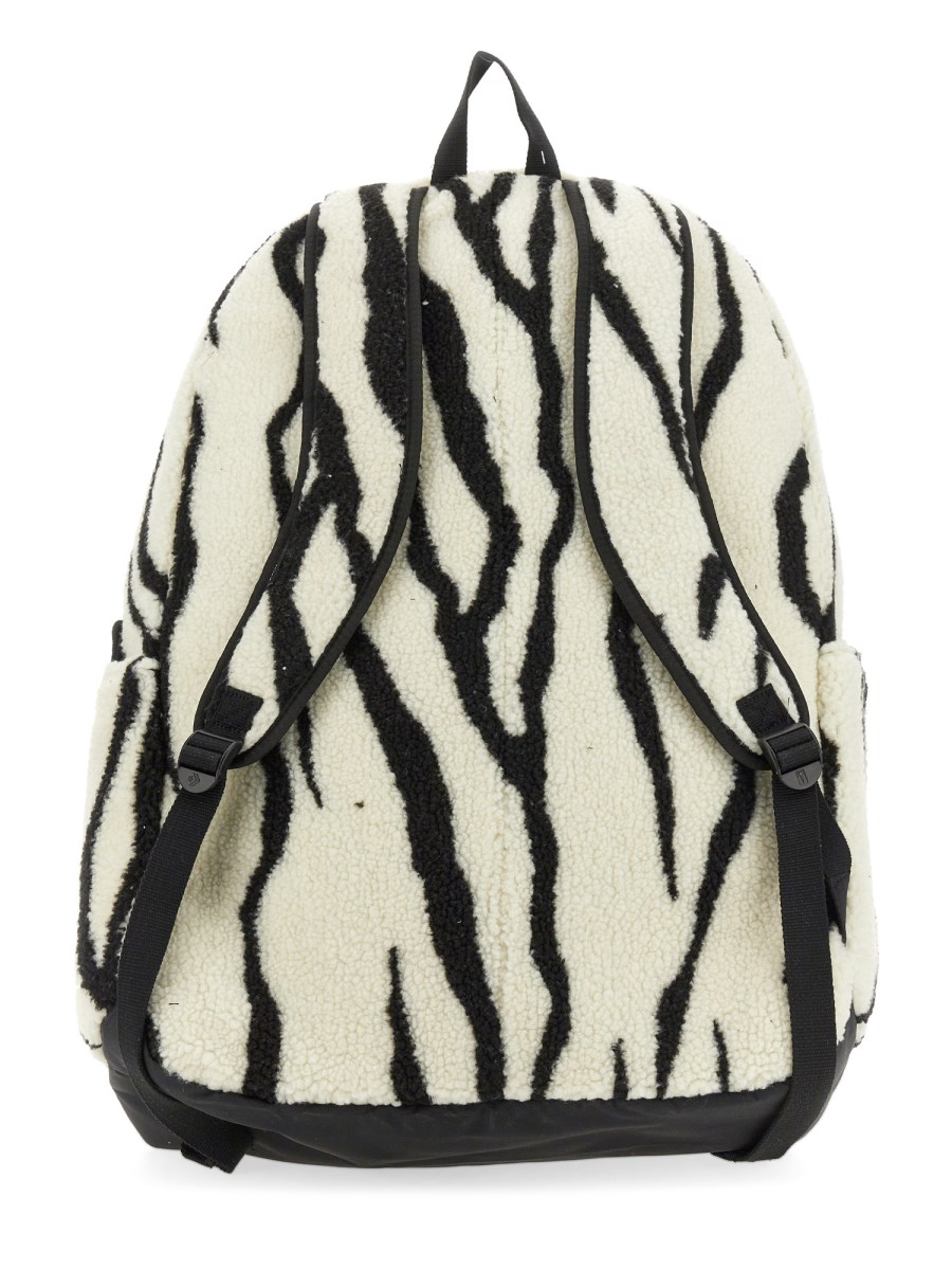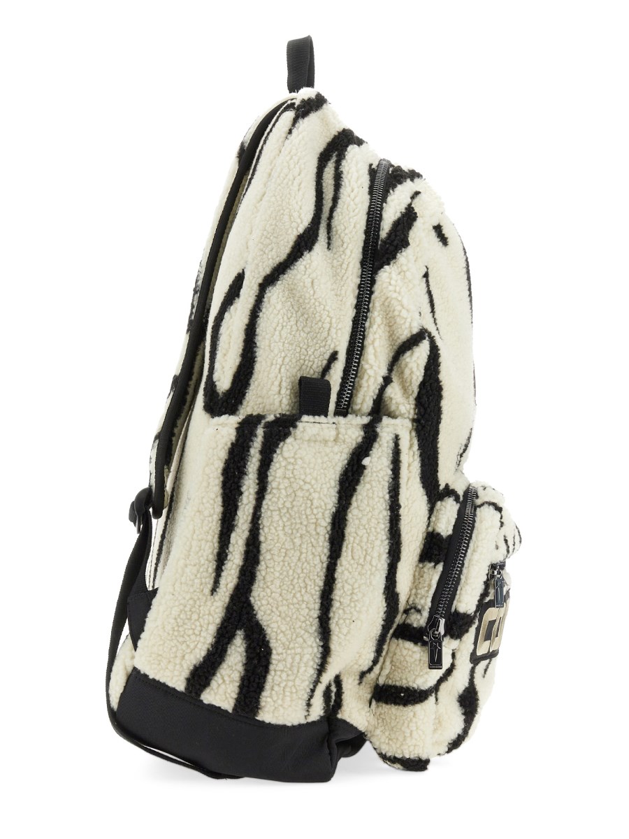 This CONVERSE X DRKSHDW GO LO BACKPACK features zebra-inspired faux shearling (100% polyester) with a black double zipper with the collab pentagram logo, a loop carry-handle on top and two wide, adjustable shoulder straps. It has a front pocket and front zipper with collab pentagram logo, a large collab logo embroidered on front and an internal laptop sleeve.