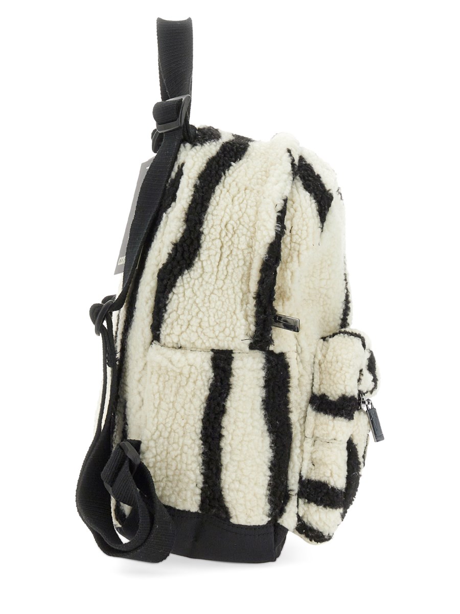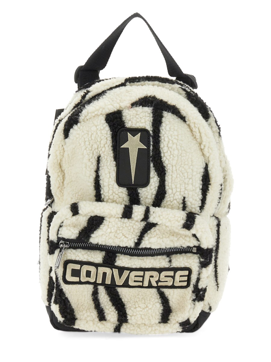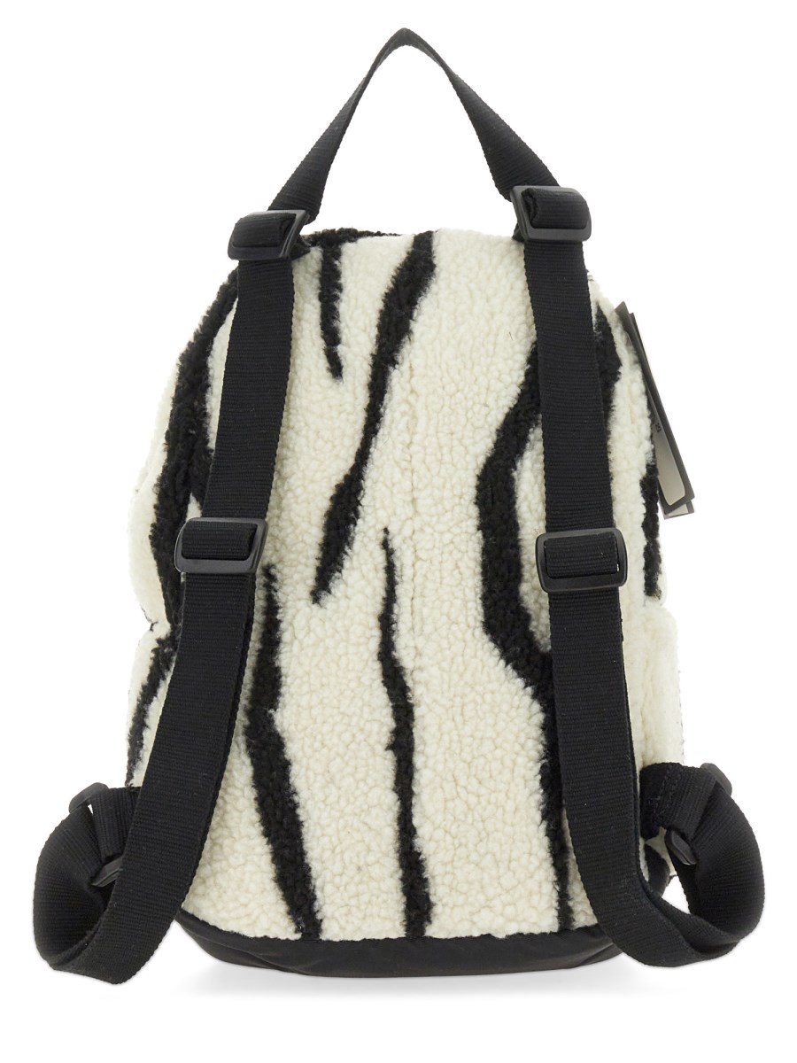 This CONVERSE X DRKSHDW OVERSIZED BACKPACK features zebra-inspired faux shearling (100% polyester) with a black double zipper with the collab pentagram logo, a loop carry-handle on top and two wide, adjustable shoulder straps. It has a front pocket with top and front zippers with collab pentagram logo, a large collab logo embroidered on front and an internal pocket.