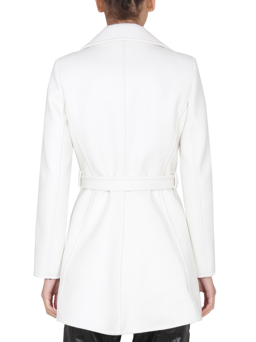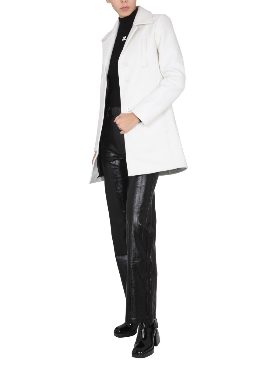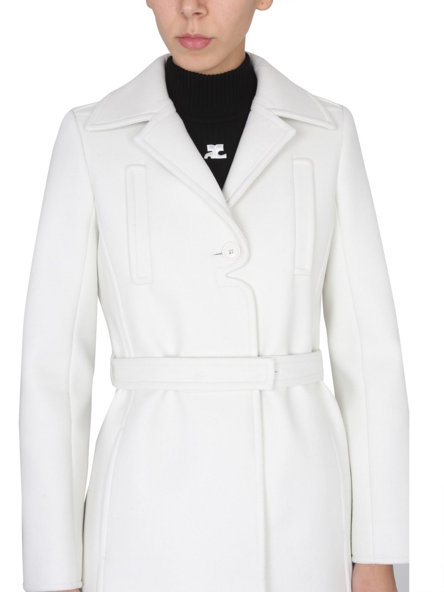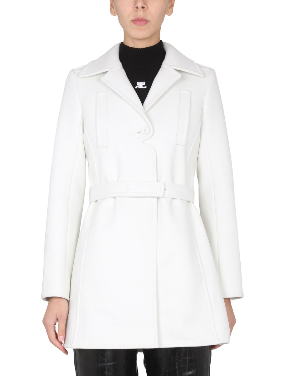 This single-breasted button closure wool blend coat from Courreges is a timeless piece of fashion. The sleek and stylish design is made to last, with the mirror lapels and waist belt to make the piece stand out. This black wool blend coat is stylish and warm, a perfect fall or winter coat for the chilly days ahead.
