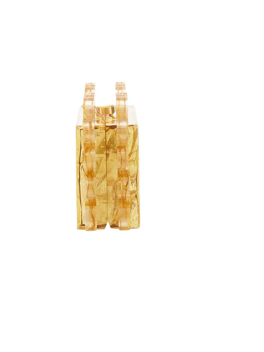 The rectangular shape of the Harlow Clutch is embellished by a unique pattern of circular details that line the edge of the bag. Created from a gold lamé encased in acrylic, the bag is finished with a scooped front lock closure on the top. This statement-making bag gives off an air of 60’s glamour and is fully lined to protect your valuables. A redefined classic, you’ll endlessly turn to the Harlow to accent any outfit.