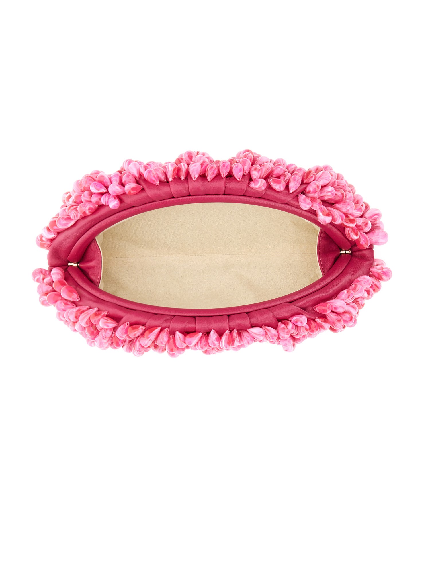 Jaala is a stunning shell-shaped clutch. She is the perfect accessory for your outfit. The Diva Napa leather is extremely luxurious and gives a sophisticated air to this bag. The translucent marbled acrylic is a perfect compliment to the dragonfruit color. The textured sides are undeniably eye-catching and comfortable on your hand. Guaranteed to give a burst of color and style.