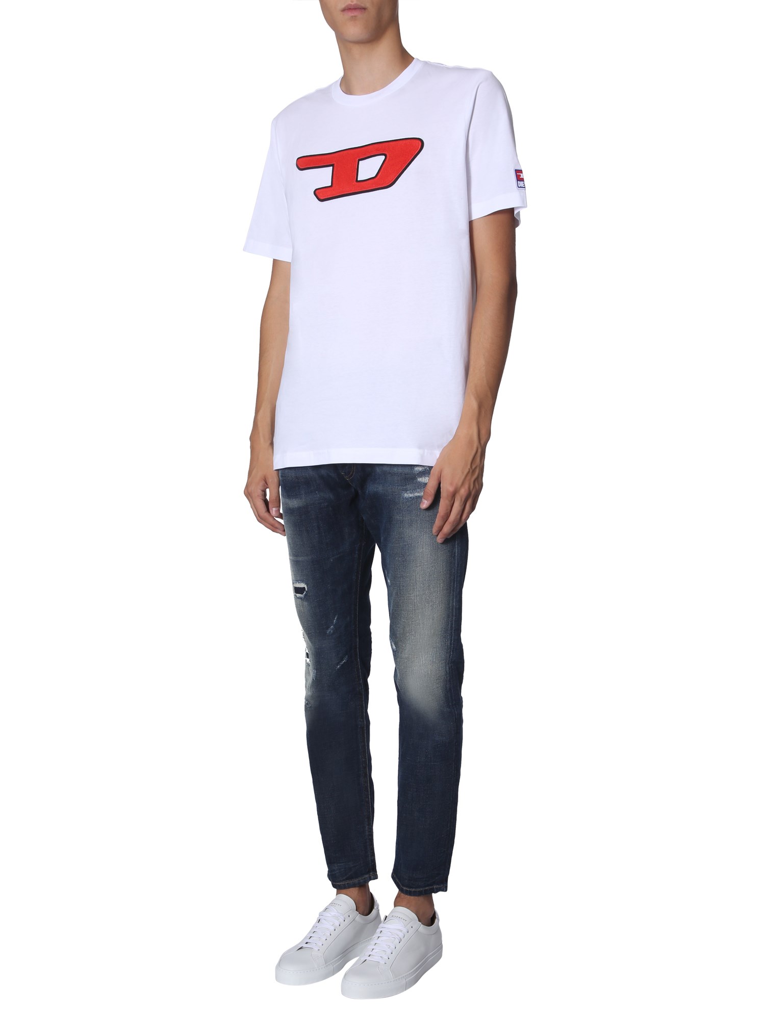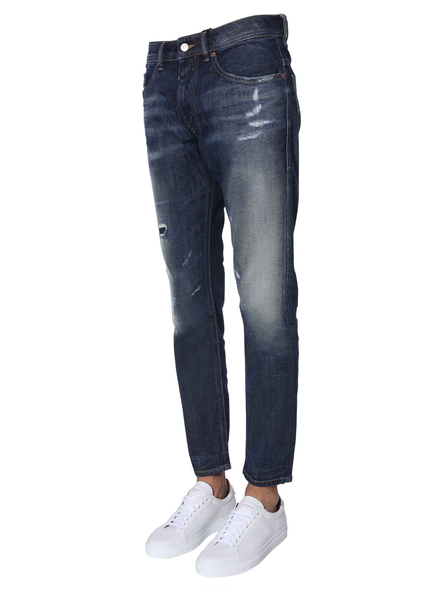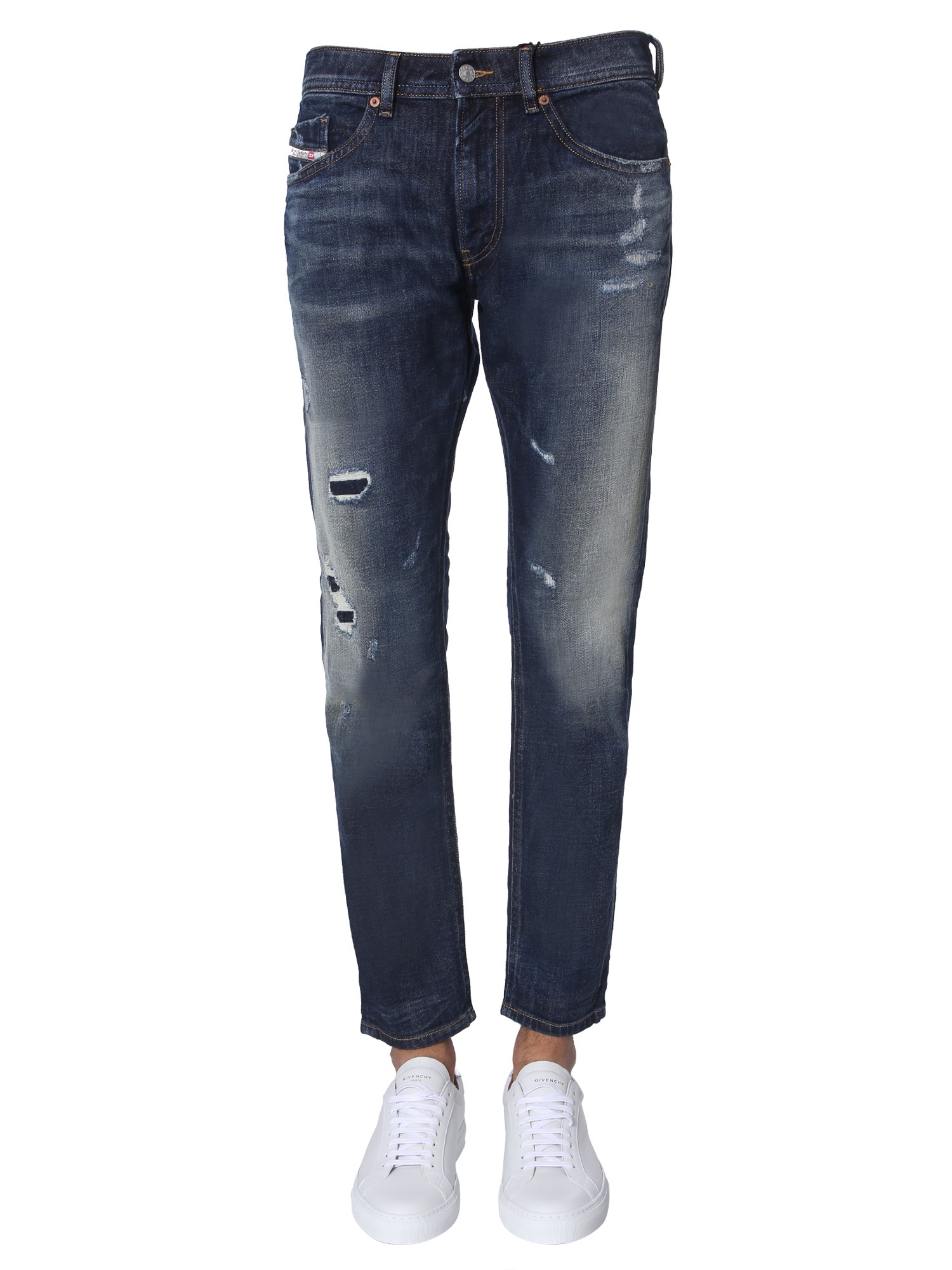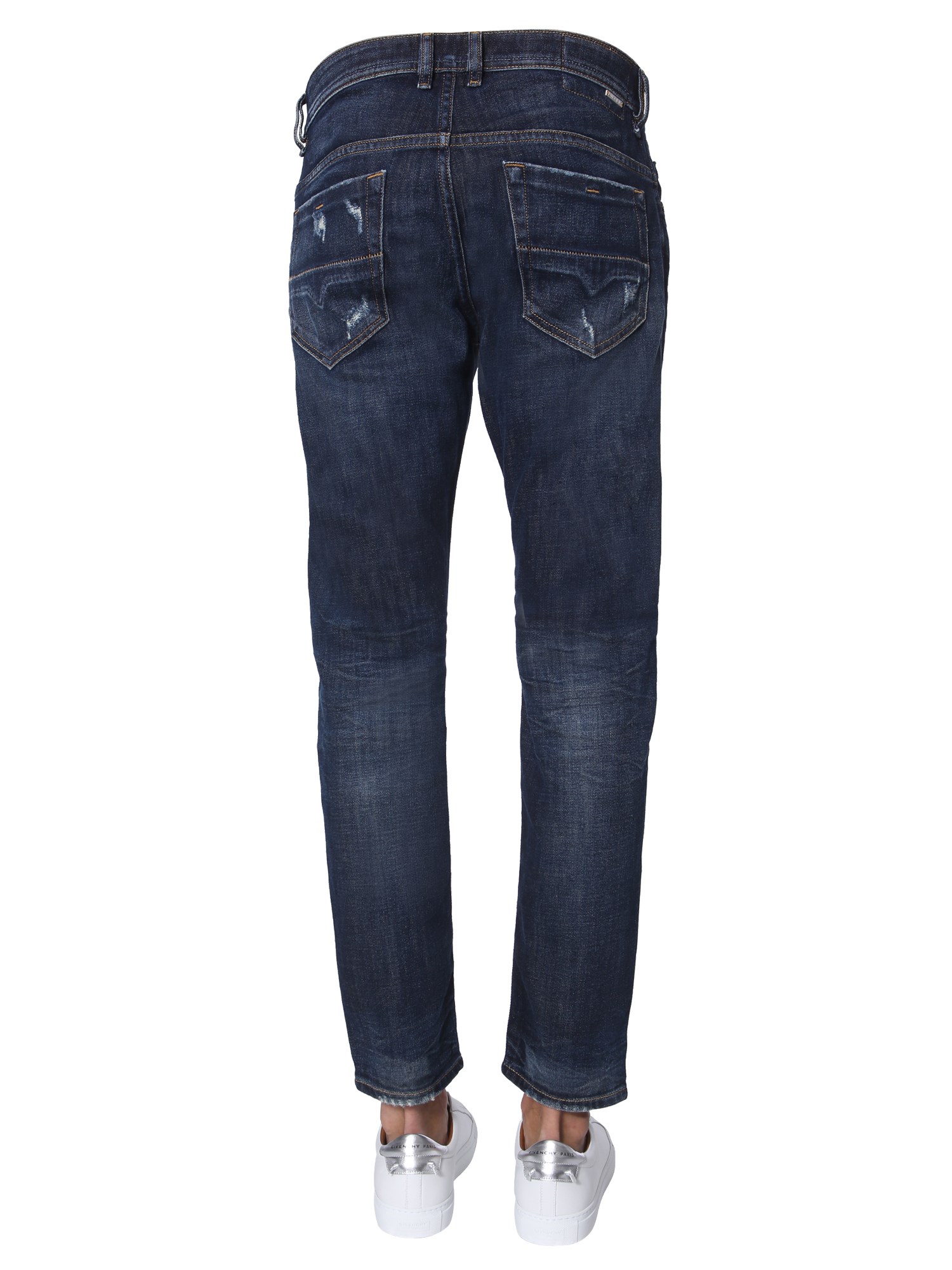 Upgrade your wardrobe with these "thommer" jeans from Diesel. These jeans have a trendy ripped front with a bleached effect that makes it a worthy addition to your wardrobe. The front zip and button closure gives a tight and secure fit. You can pair the with a white T-shirt and canvas shoes for a complete look.