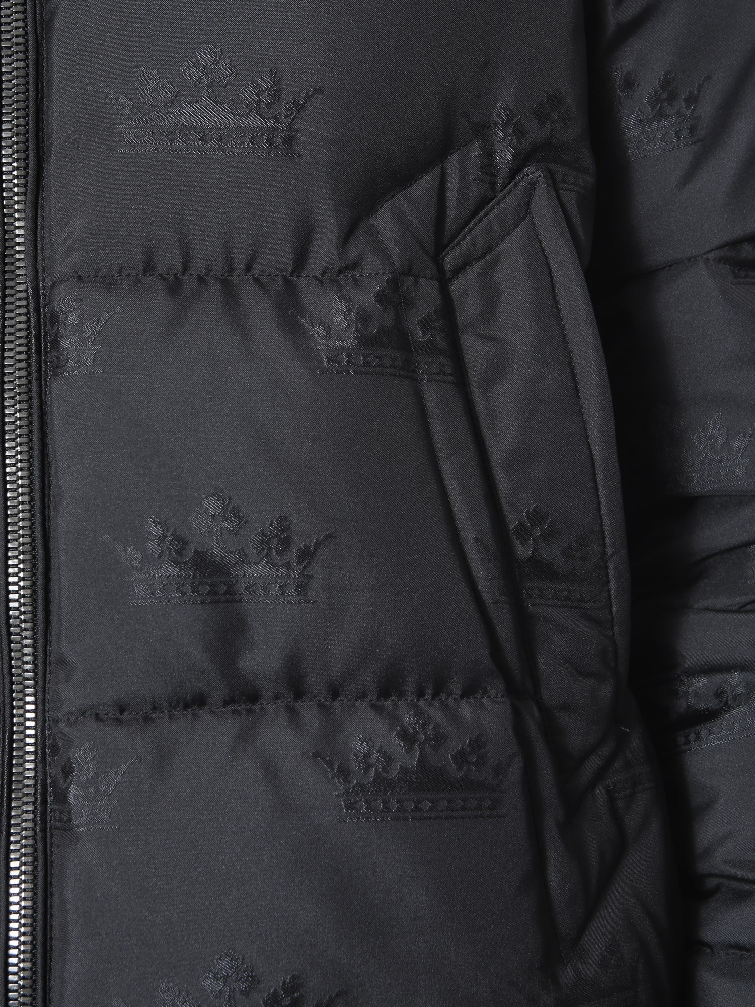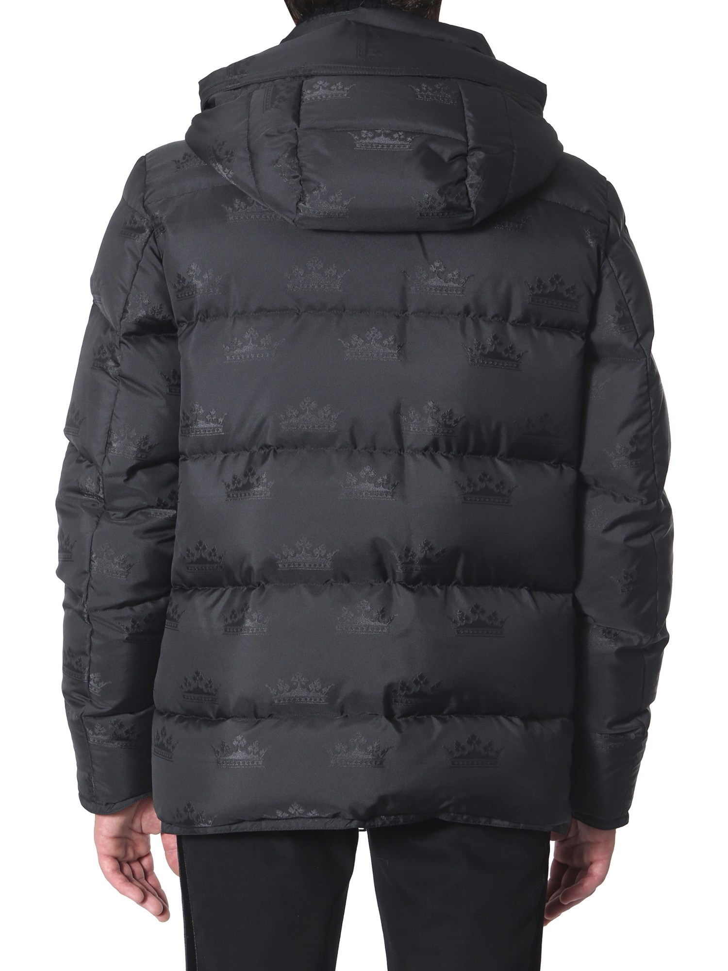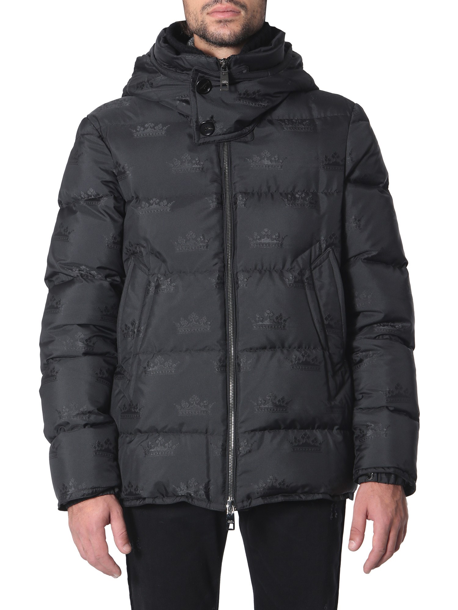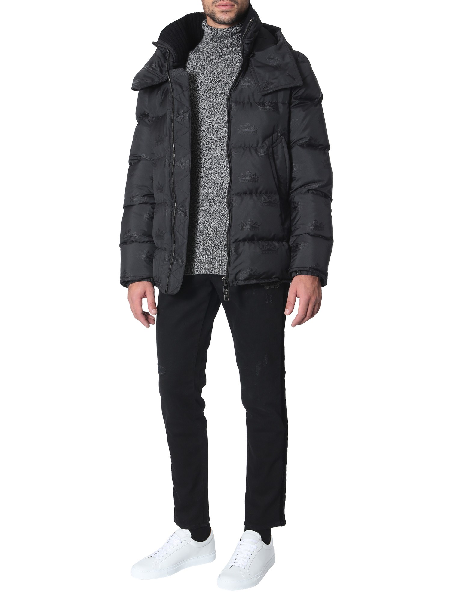 Protect yourself from the chilly wind during winter with this hooded down jacket from Dolce & Gabbana. It comes with a puffed interior that will help to keep you warm and cosy. The asymmetrical hooded neckline adds a distinct touch to its design while the zip closure will let you wear it conveniently. Club it with a pair of black denim jeans and leather boots to complete your winter look.