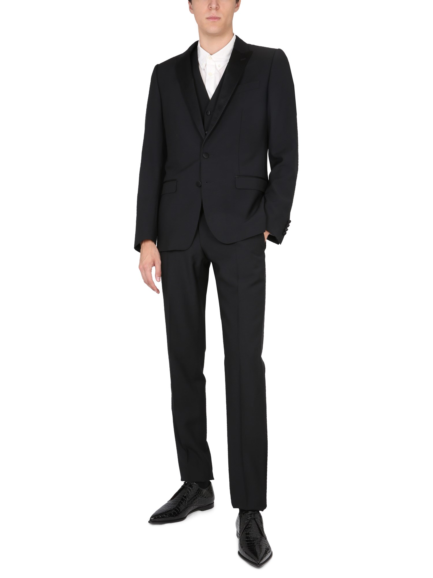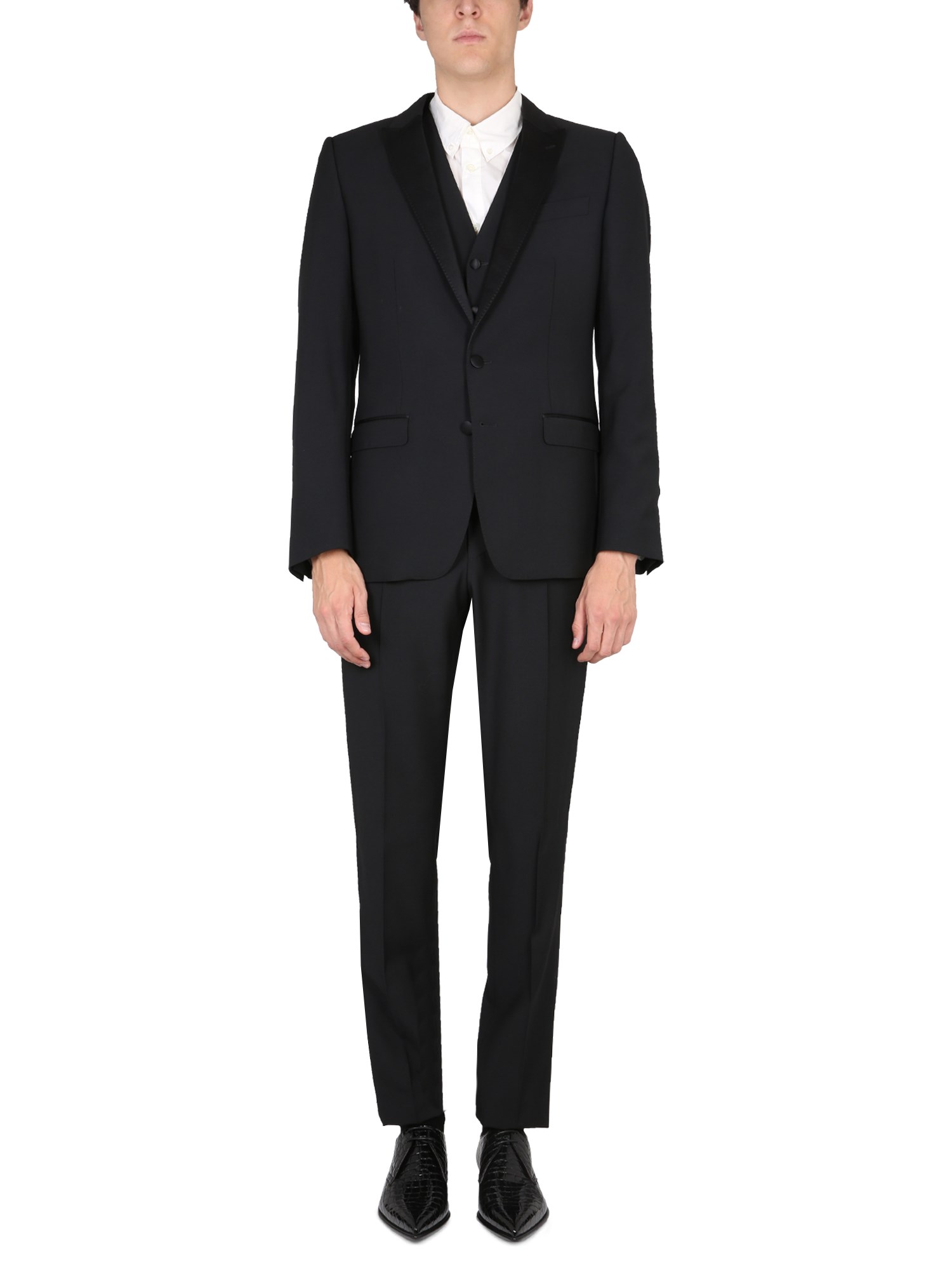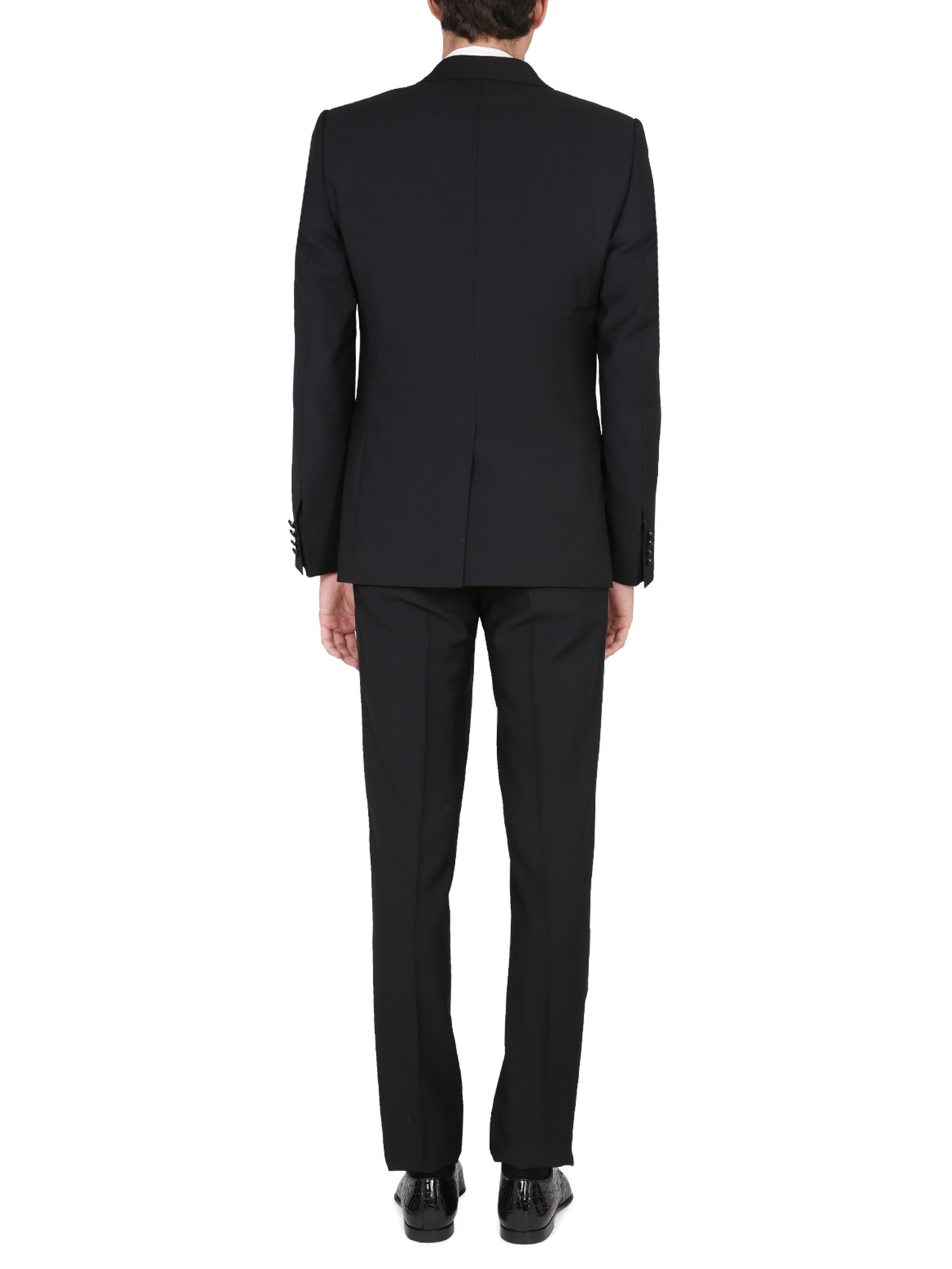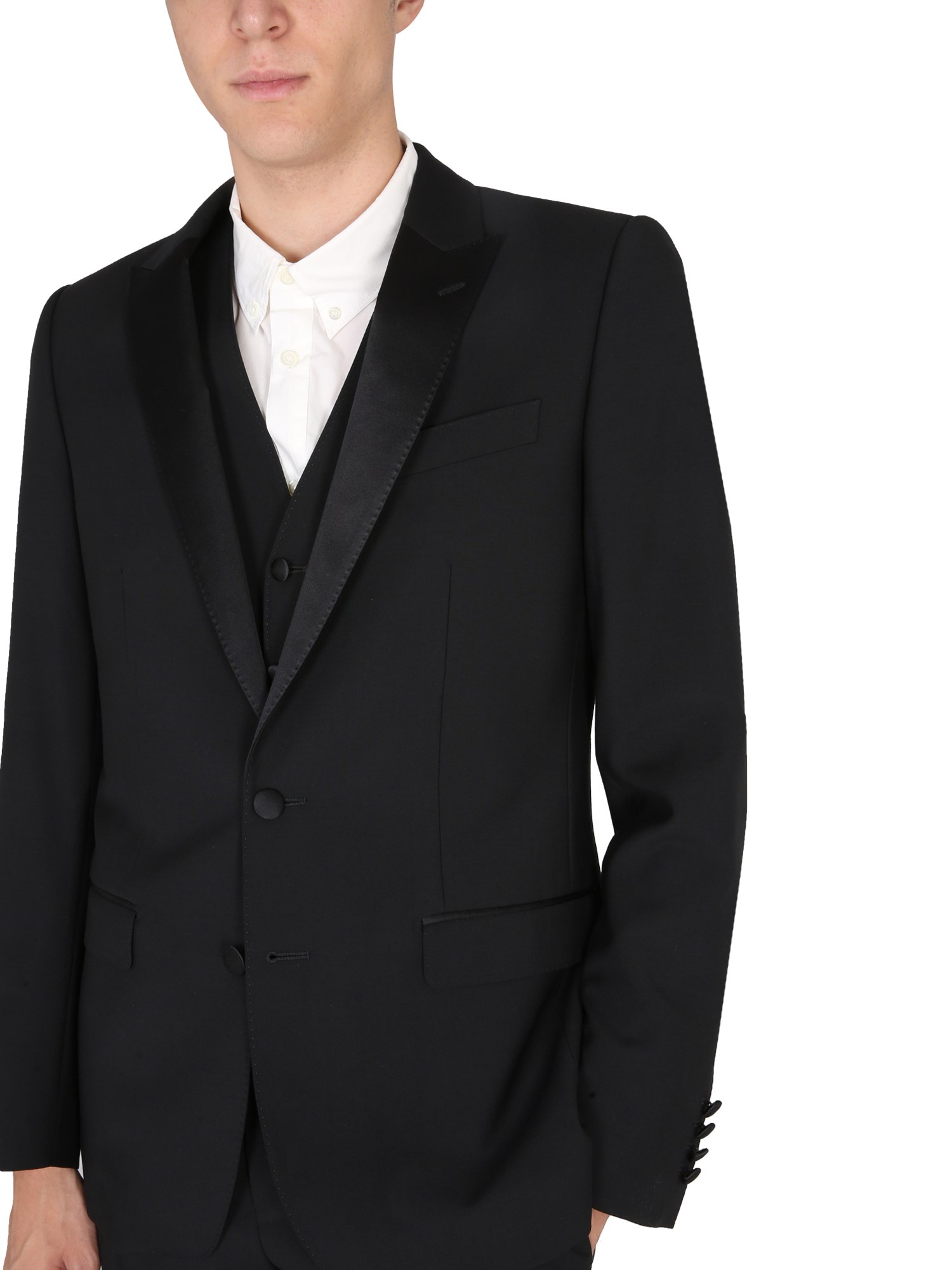 - PEAKED LAPELS, SINGLE-BREASTED CLOSURE WITH DOUBLE BUTTON, WELT POCKETS, THREE INSIDE POCKETS, CENTER SLIT
