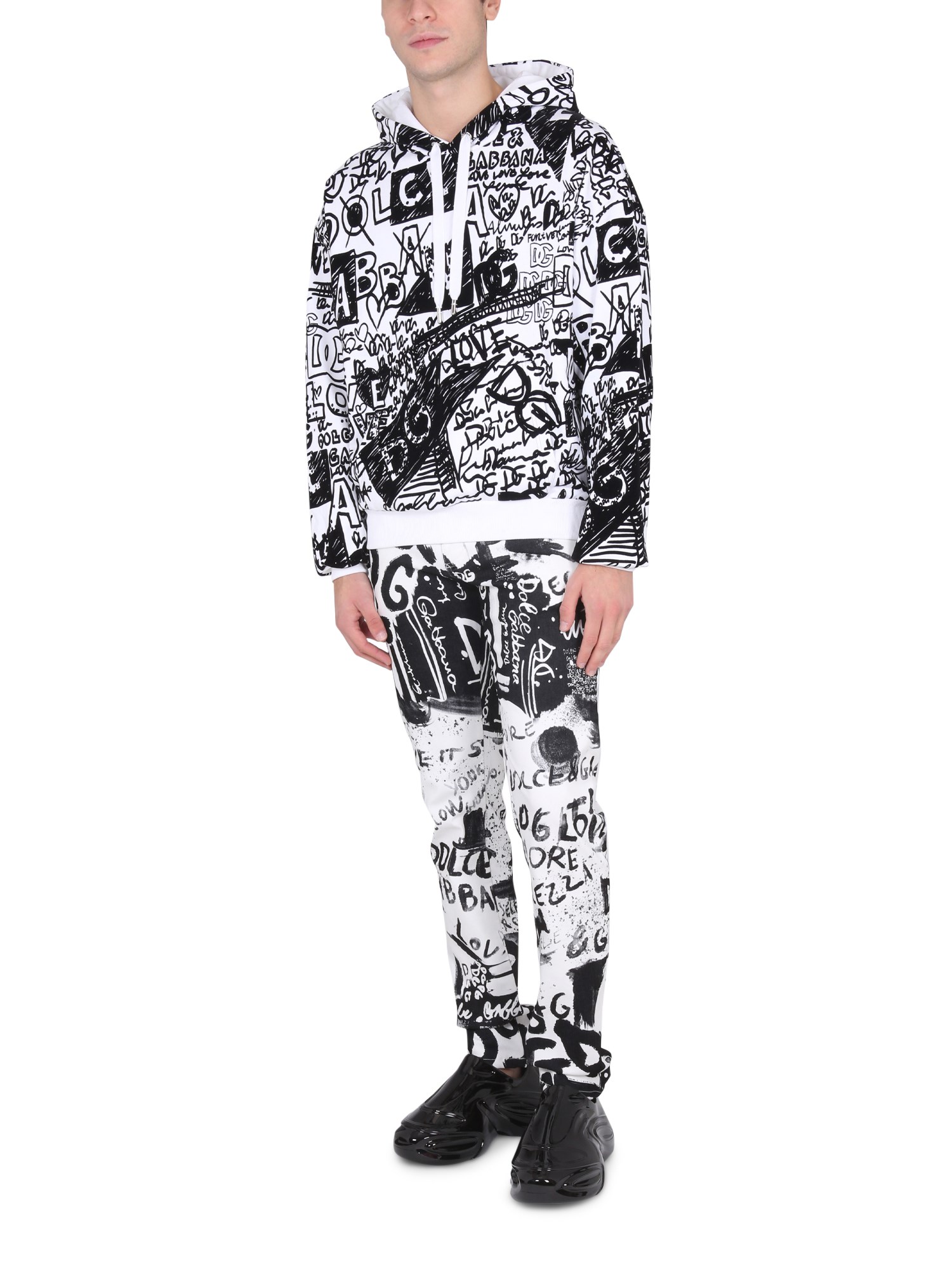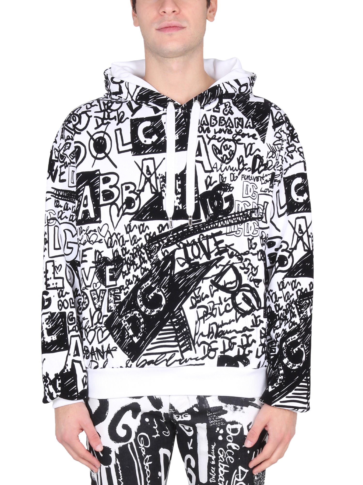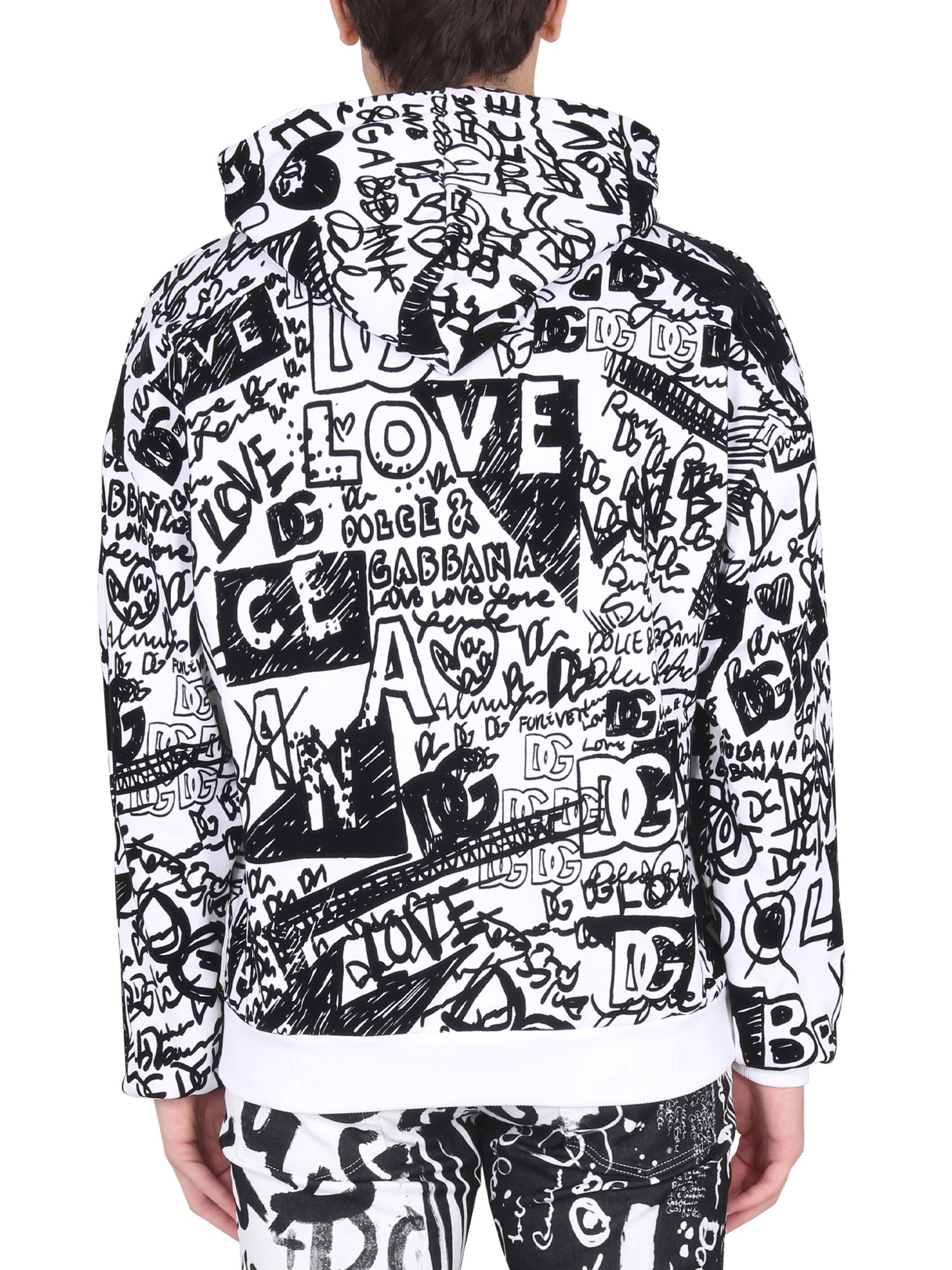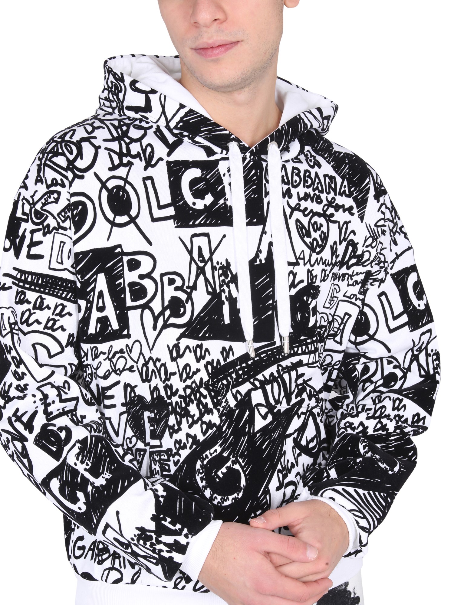 The fleece hoodie from the house Dolce & Gabbana is a warm and comfortable hoodie for the cold winter months. It features a hood and drawstring logoed metal finials, along with an elastic knit bottom hem and cuffs for added warmth. It has long sleeves and an all-over-flocked graffiti print.
