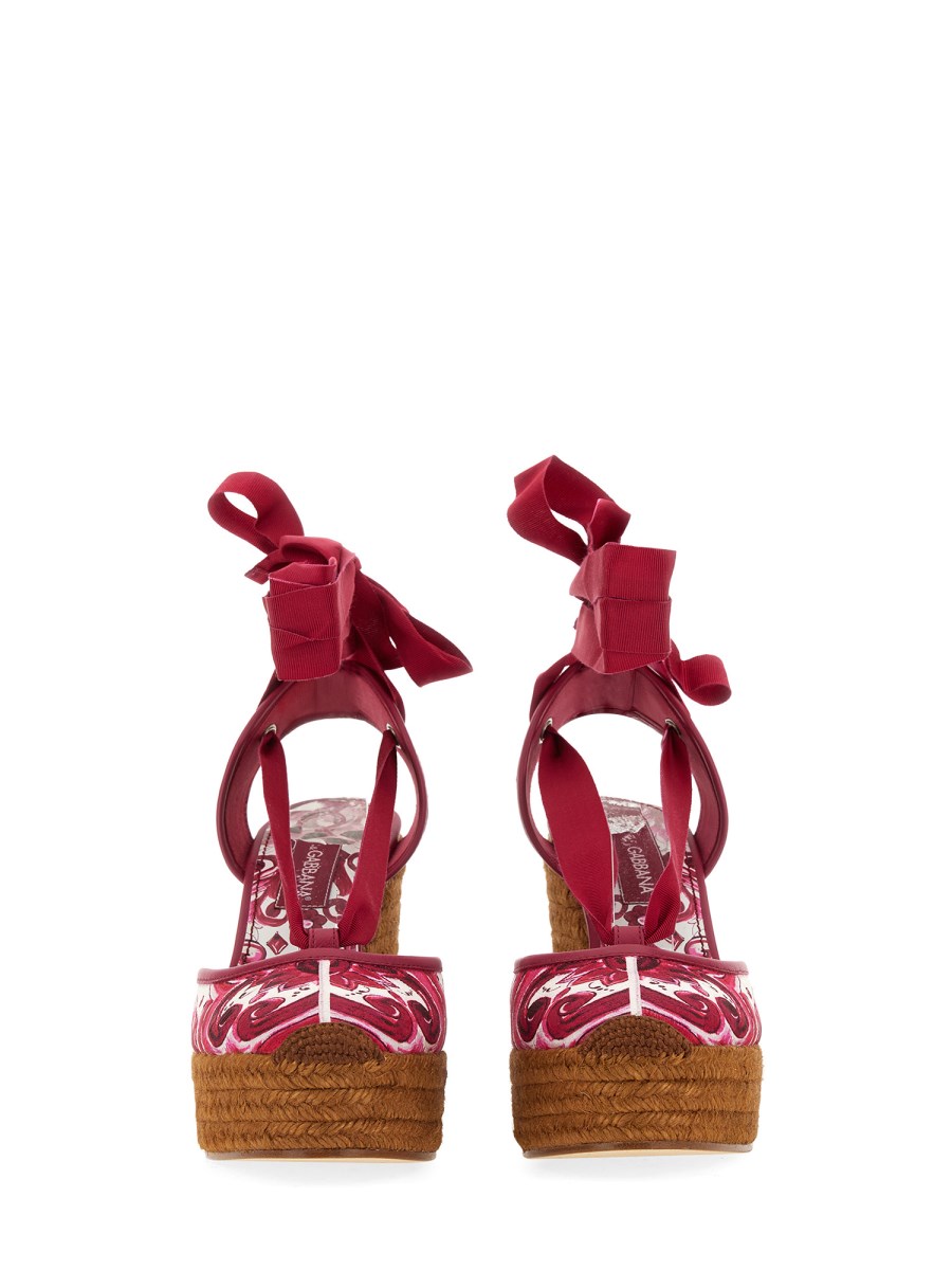 Elevate your style with these printed brocade fabric wedges from Dolce & Gabbana. Crafted with a lightweight footbed measuring 9 cm, these wedges offer both comfort and a beautiful design. The grosgrain ribbon closure adds a touch of elegance, while the brocade fabric upper featuring a stunning majolica stamp creates a unique and eye-catching look.