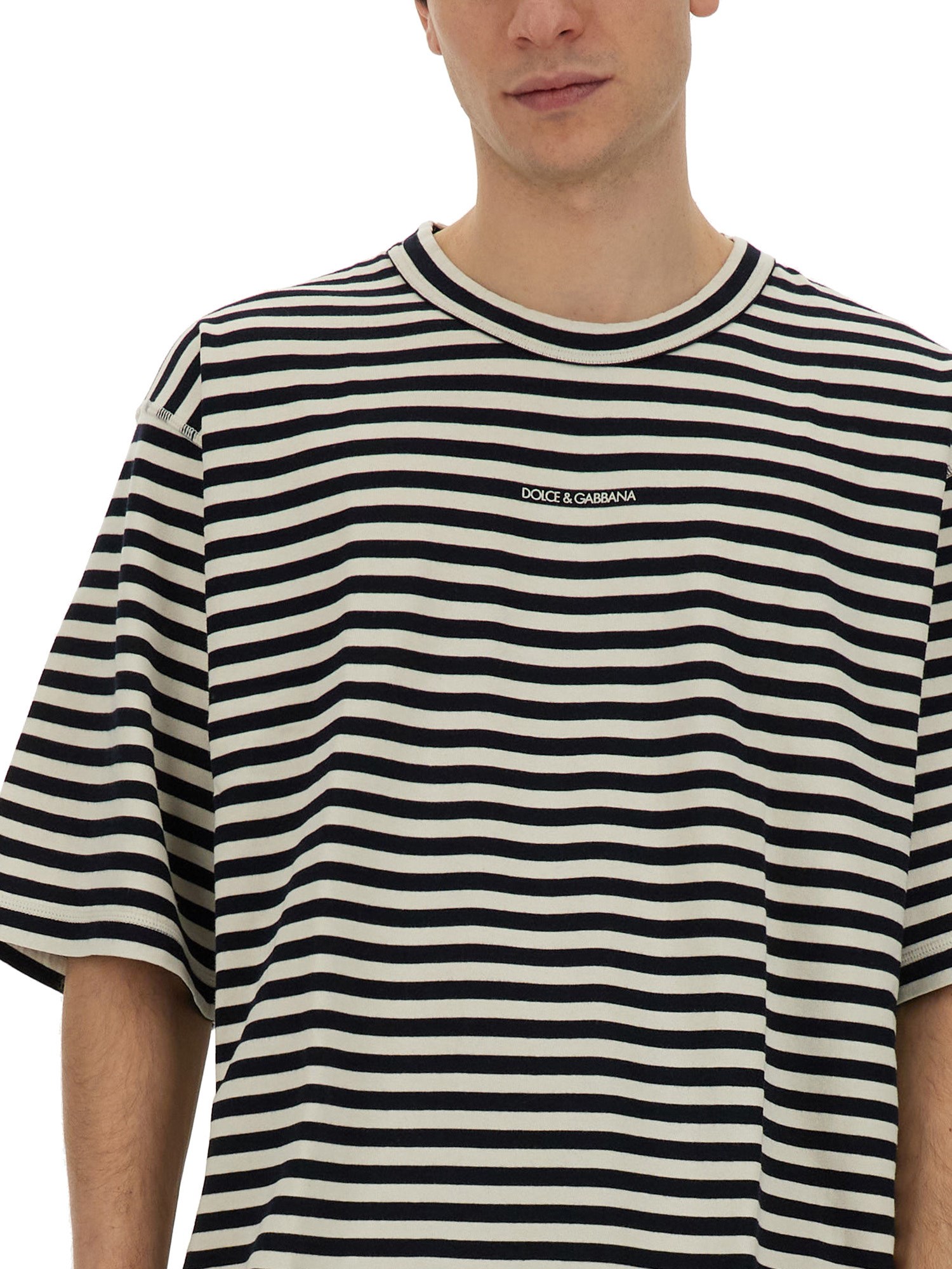 Introducing Dolce & Gabbana’s crew neck striped cotton oversized T-shirt, a must-have addition to your wardrobe. Crafted from high-quality cotton, this T-shirt offers ultimate comfort and breathability. The classic crew neck design adds a touch of sophistication, while the oversized fit provides a relaxed and trendy look. The timeless striped pattern adds a stylish element, making it suitable for both casual and semi-formal occasions.