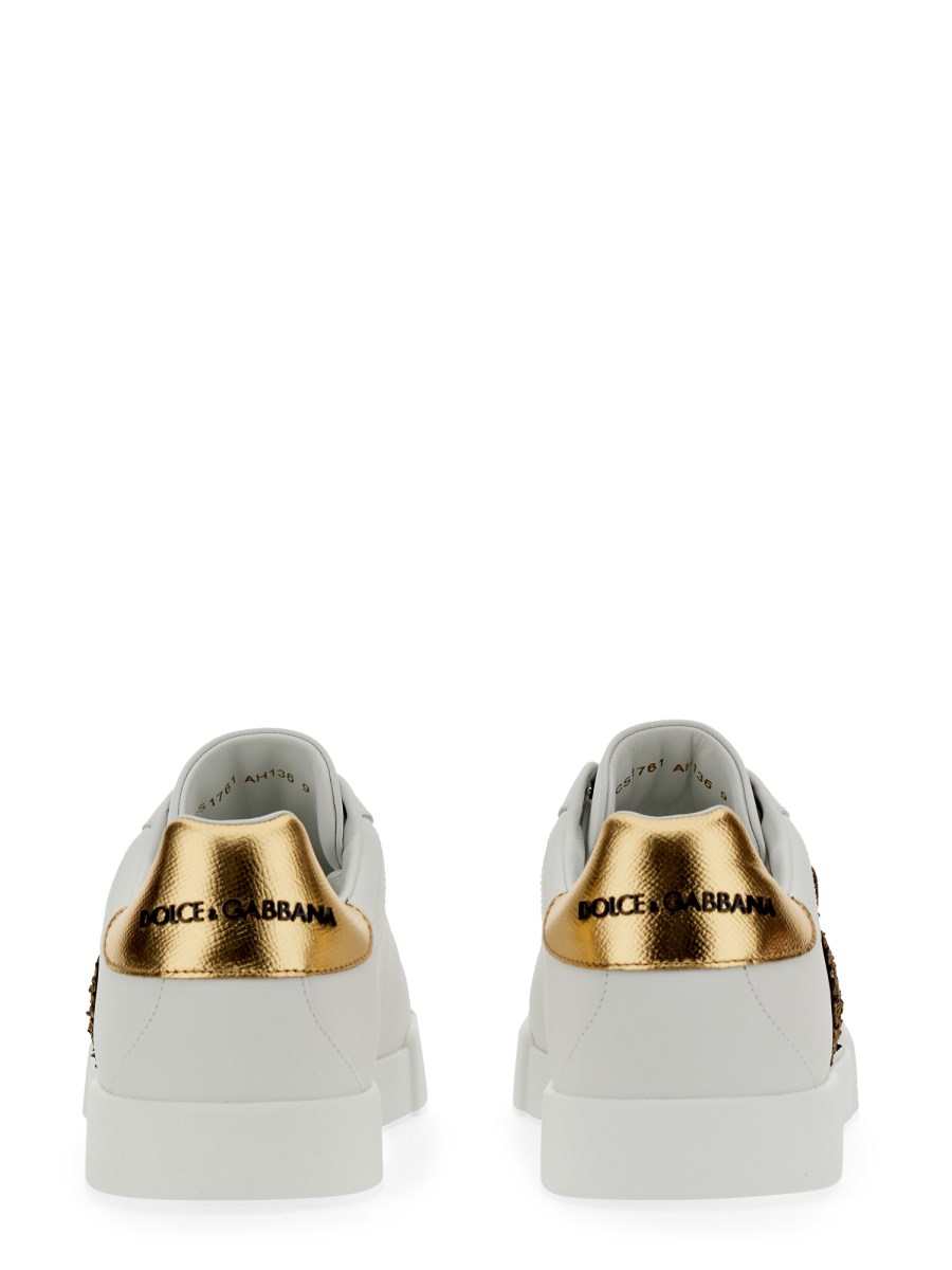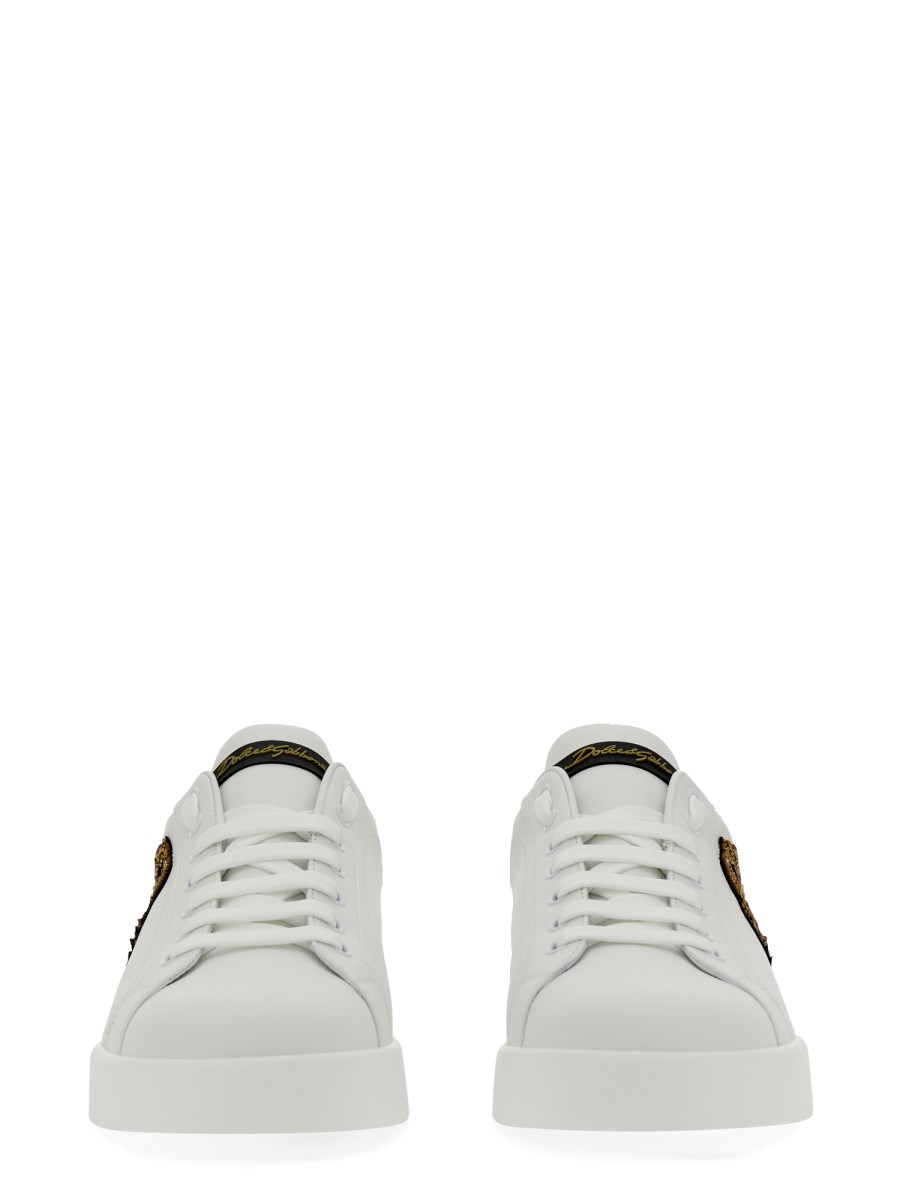 These white, leather sneakers from Dolce & Gabbana feature a rubber sole, a leather upper, and a crowned patch on the side. They have a large front patch with the D&G logo and a small embroidered logo on the back of the heel. These pair of shoes are made from 100% calf leather and will last a lifetime.