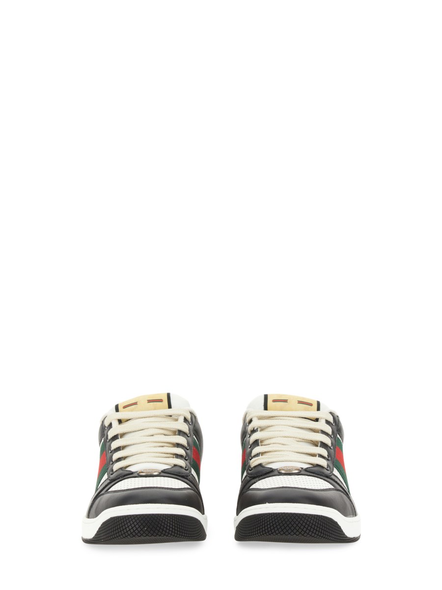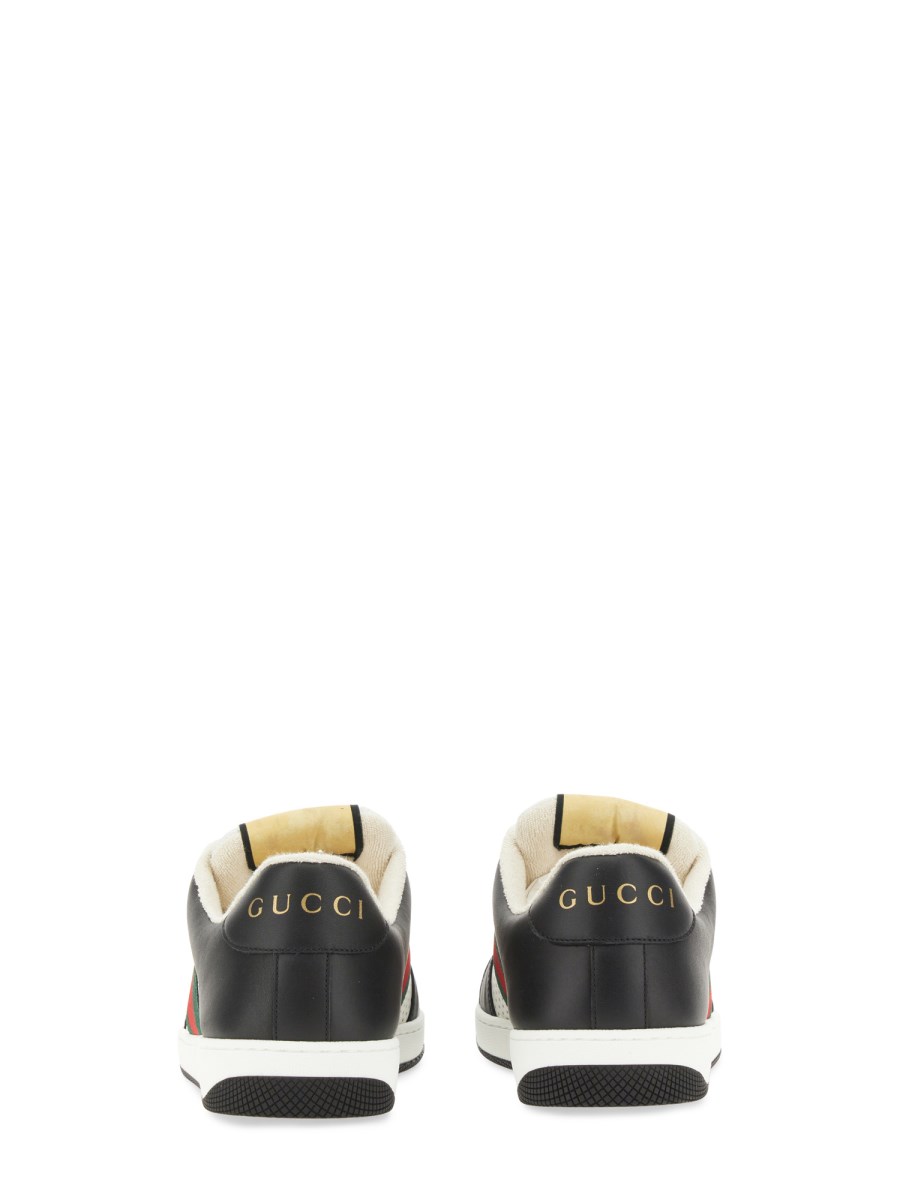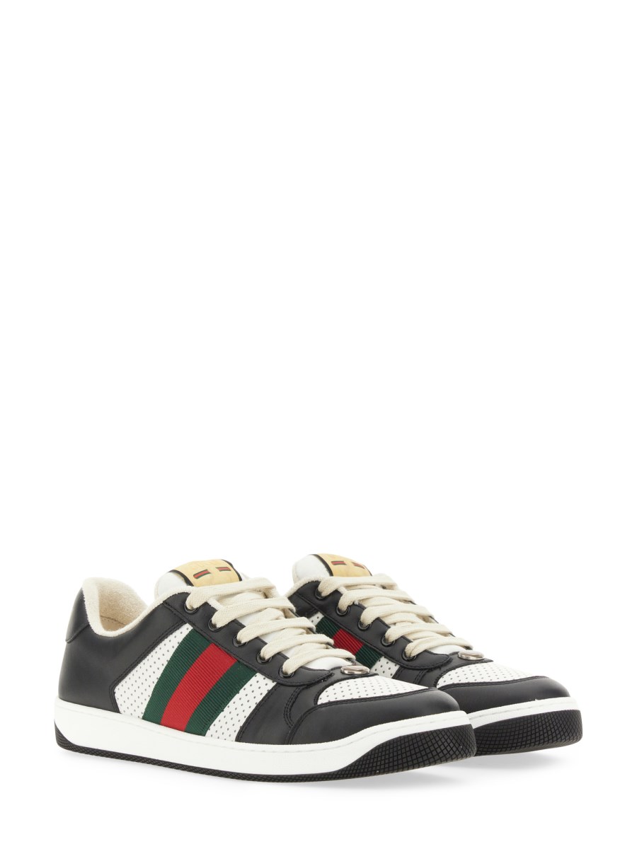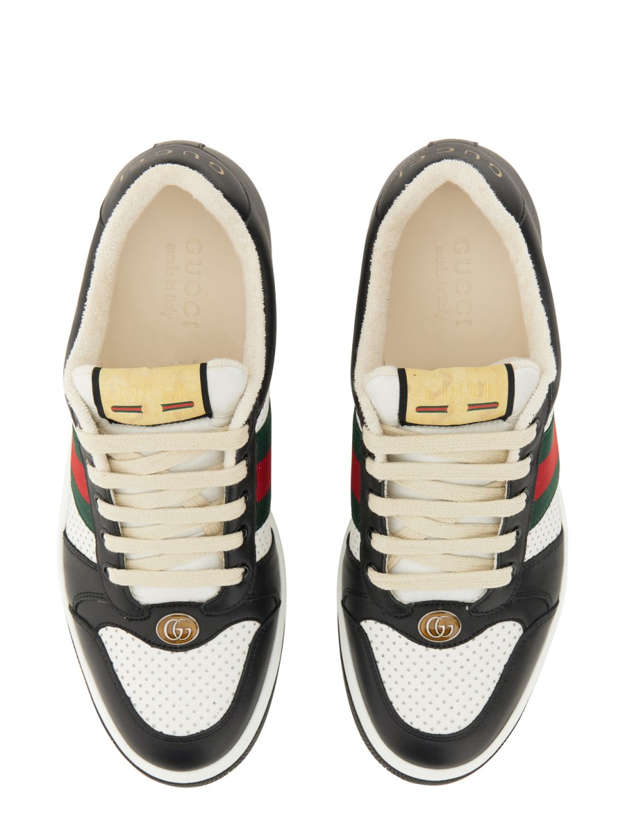 Influenced by classic trainers from the '70s, the Screener trainers—named for the defensive sports move—feature the Web stripe on the side and the vintage Gucci logo. Here the style is presented in black and white leather, while the House's monogram continues to appear as a subtle enamel and metal detail.