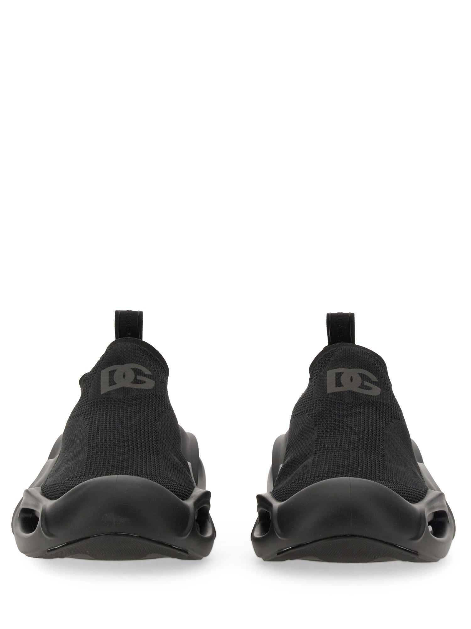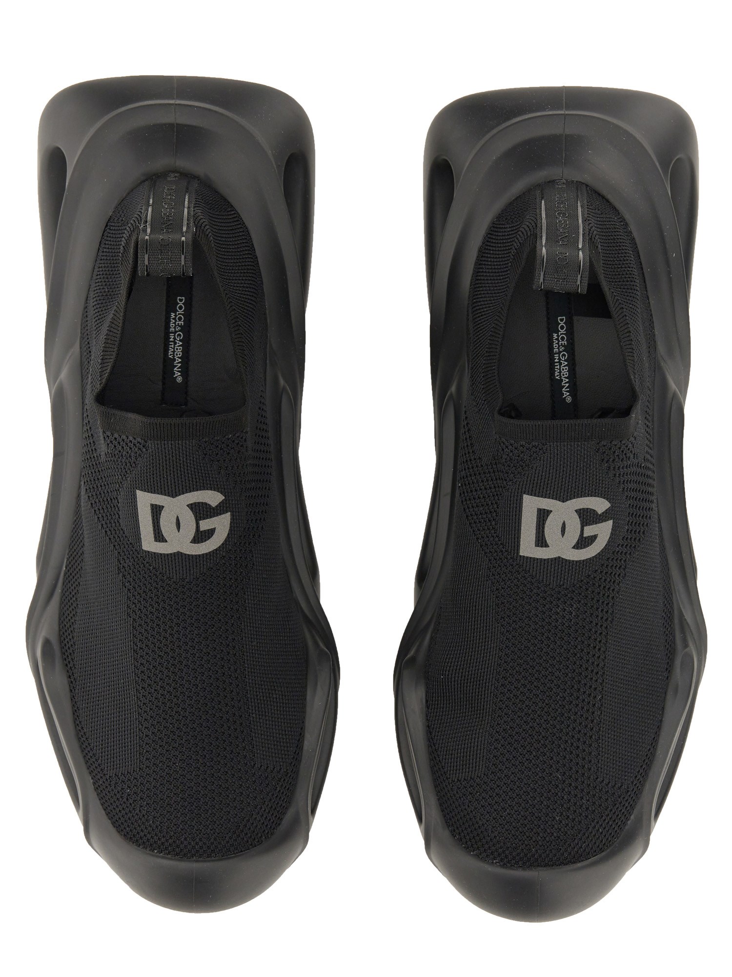 The inspiration for this new collection was the metaverse that, through its direct vision of the future and the younger generations, creates multiple identities that can intermingle and coexist. Featuring a chunky rubber sole that wraps around three soft pads, these new Wave sneakers come in stretch mesh with the DG logo.