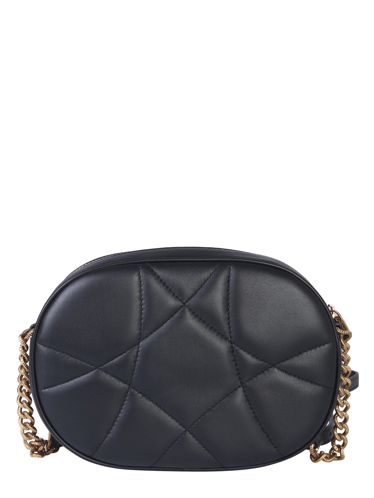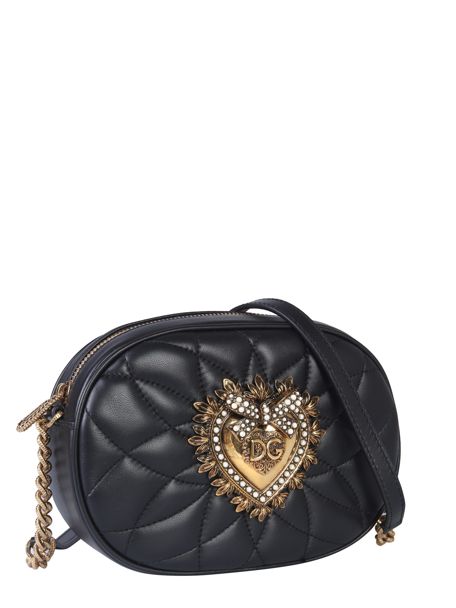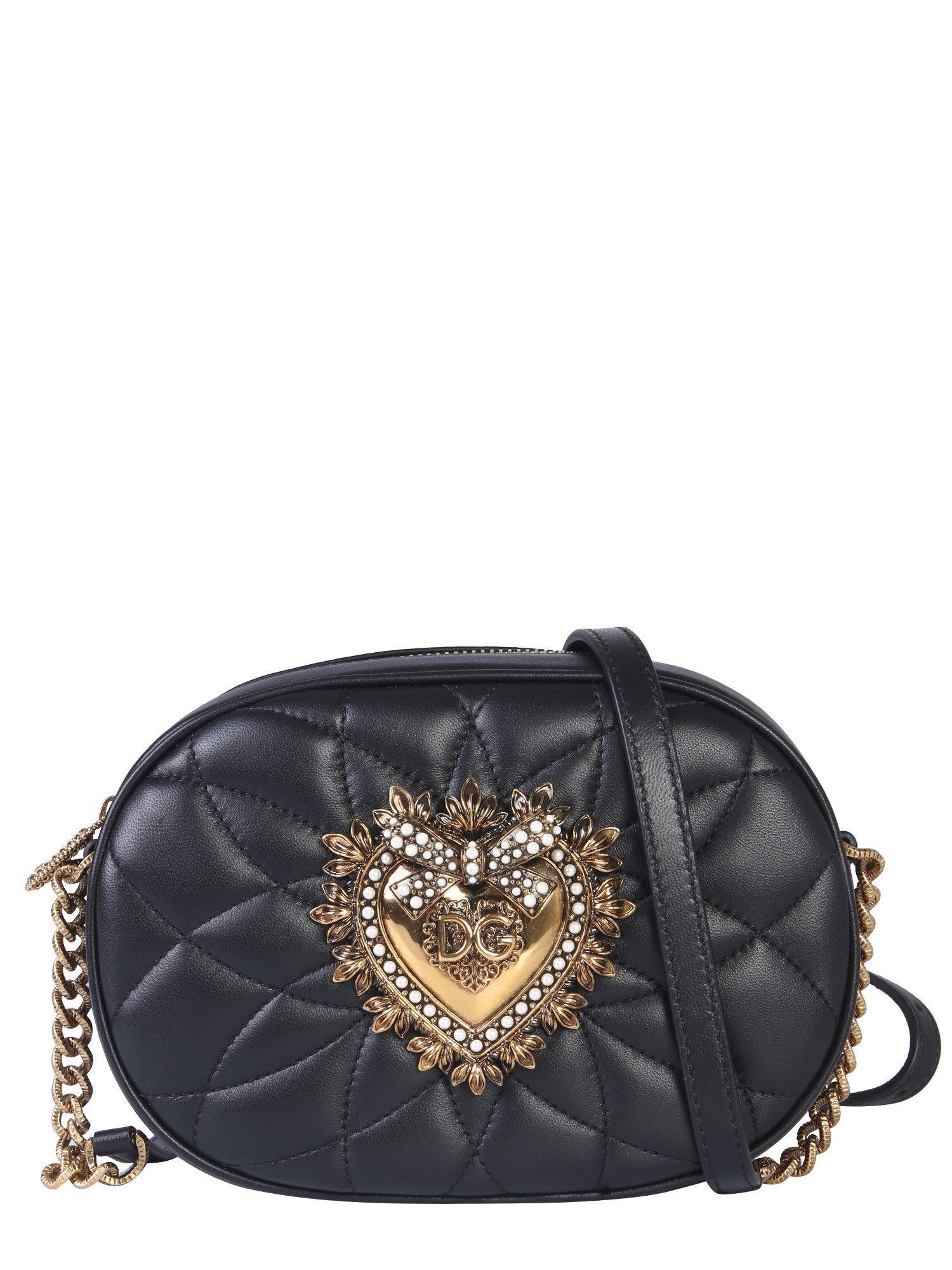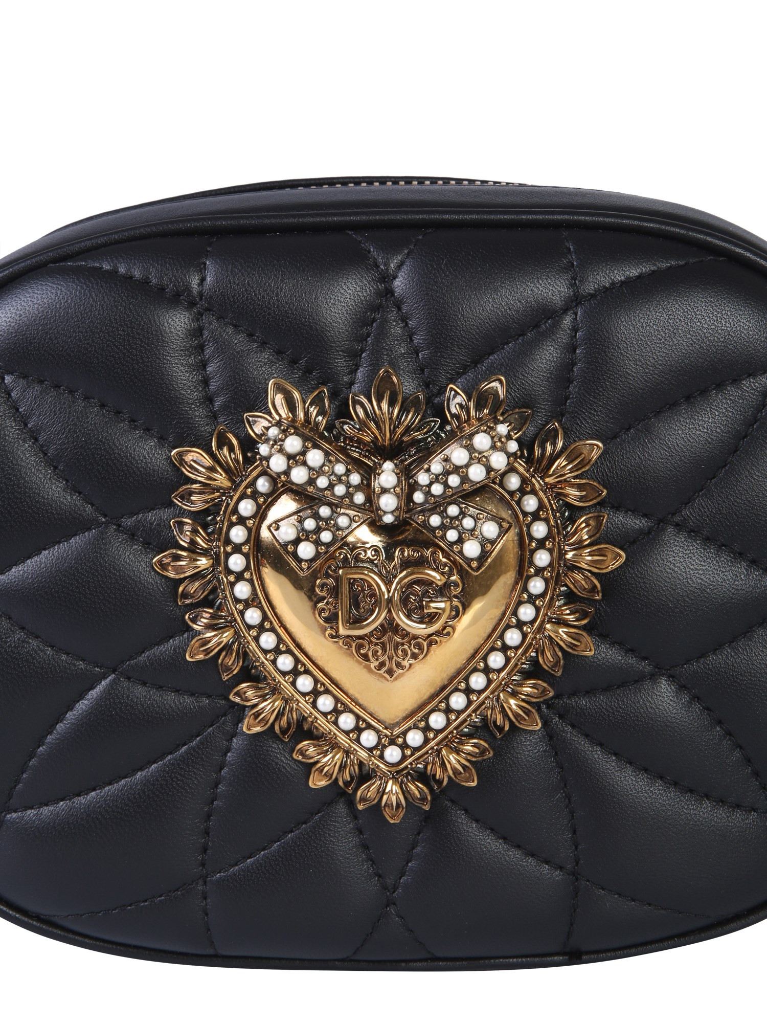 Add oodles of style to your look with this devotion camera bag from the house of Dolce & Gabbana. The bag is made from good quality leather that makes it perfect for your casual and formal occasions. With the quilted pattern on the surface, the bag features a handmade heart detailing with pearl inlay that further accentuates its stylish look.